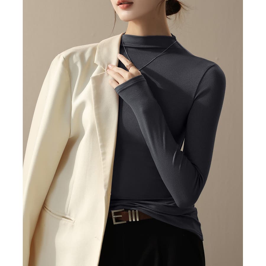 上品な半ハイネックデザインの長袖Tシャツ。