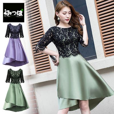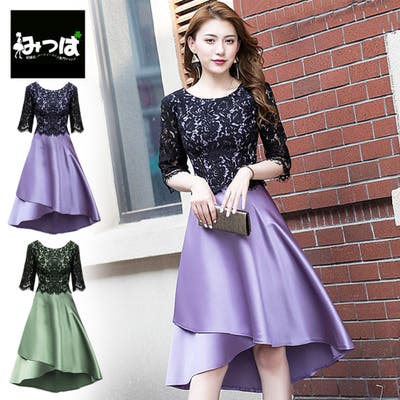★光沢が美しい重厚感のあるサテン地のワンピースとスカラップデザインが施された華やかなブラックレースがドッキングしたトレンドたっぷりのデザインドレスです。
