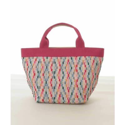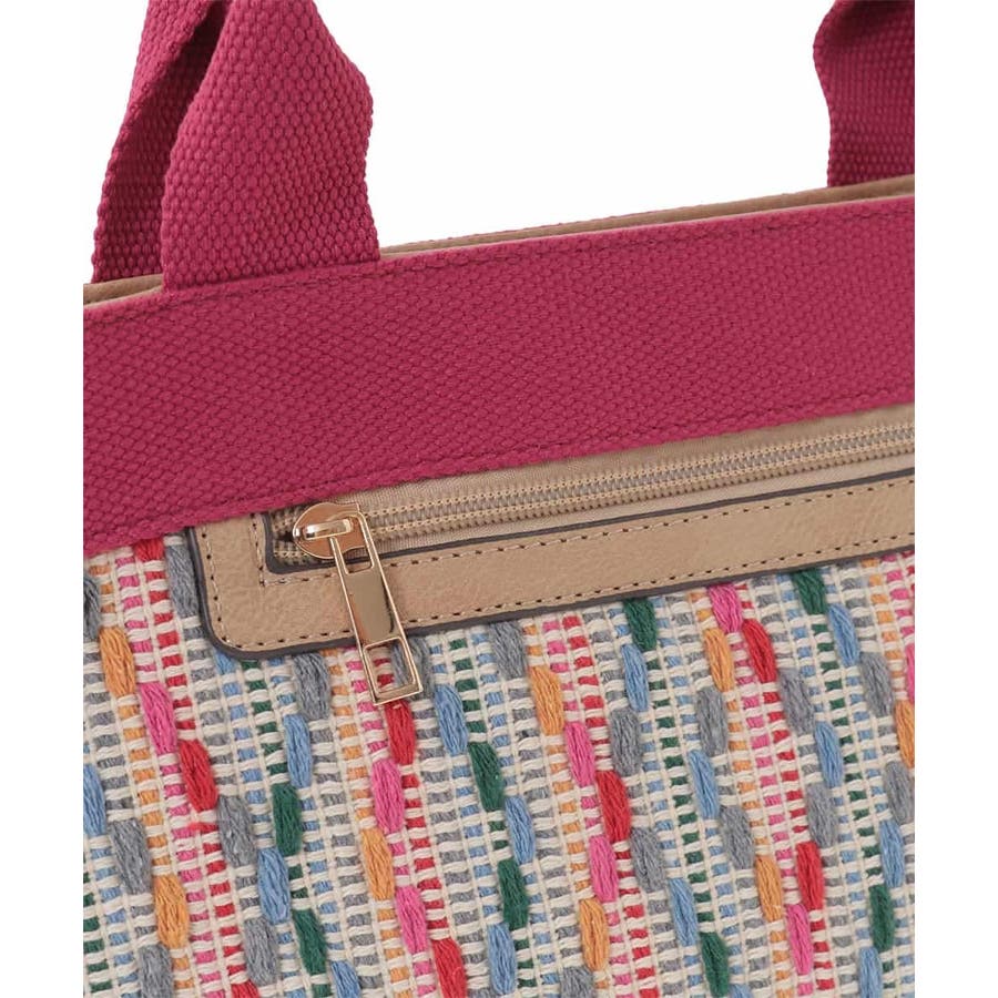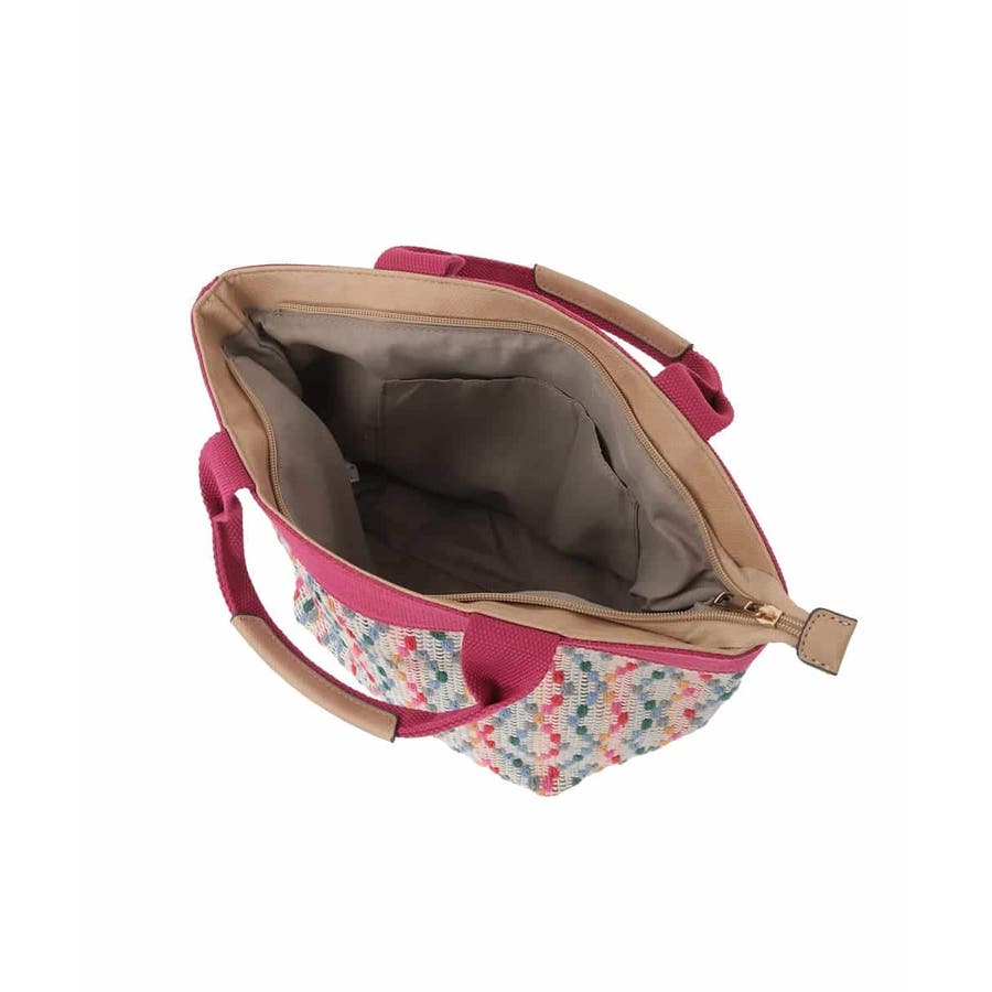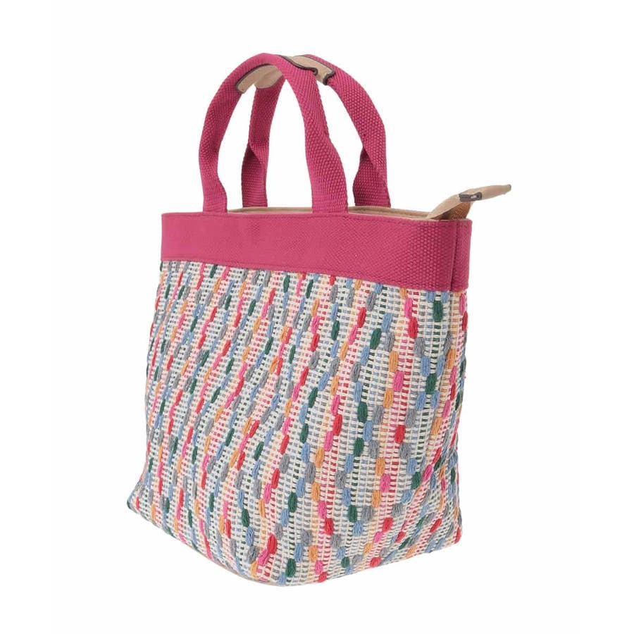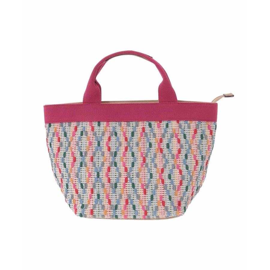 モチーフ編みのカラー配色刺繍がオリジナリティあるピースフルなデザインです。ハンドルやポケット口の合成皮革パーツで、さりげない大人らしさもプラス。