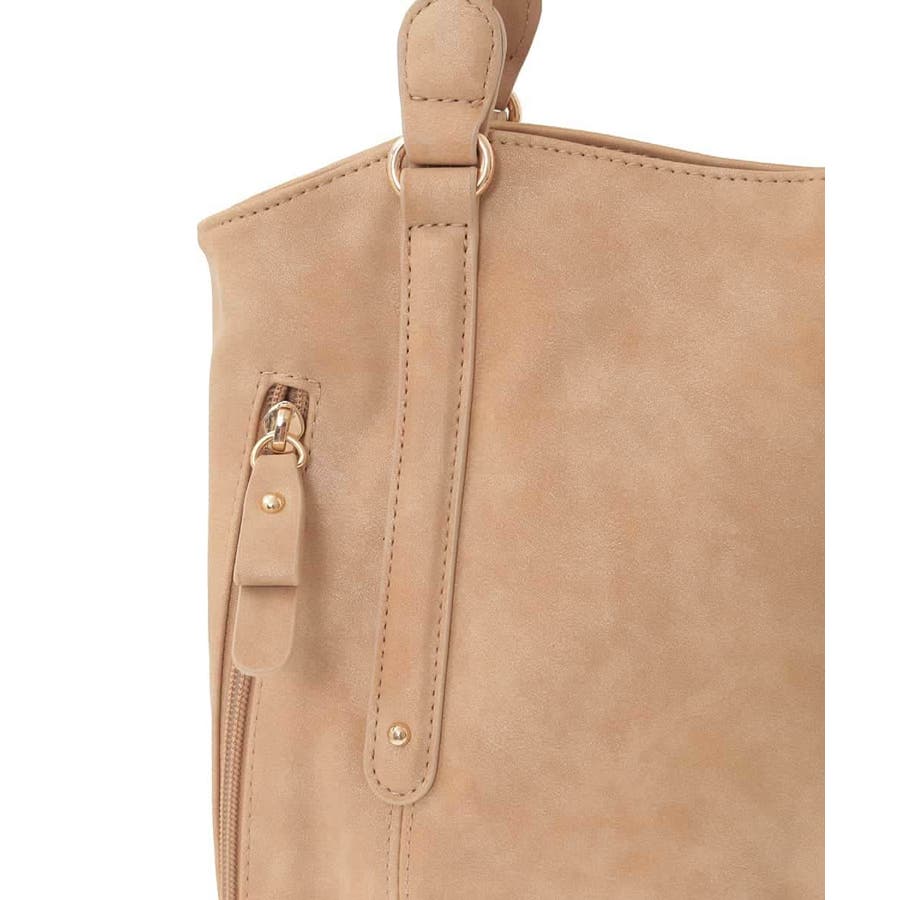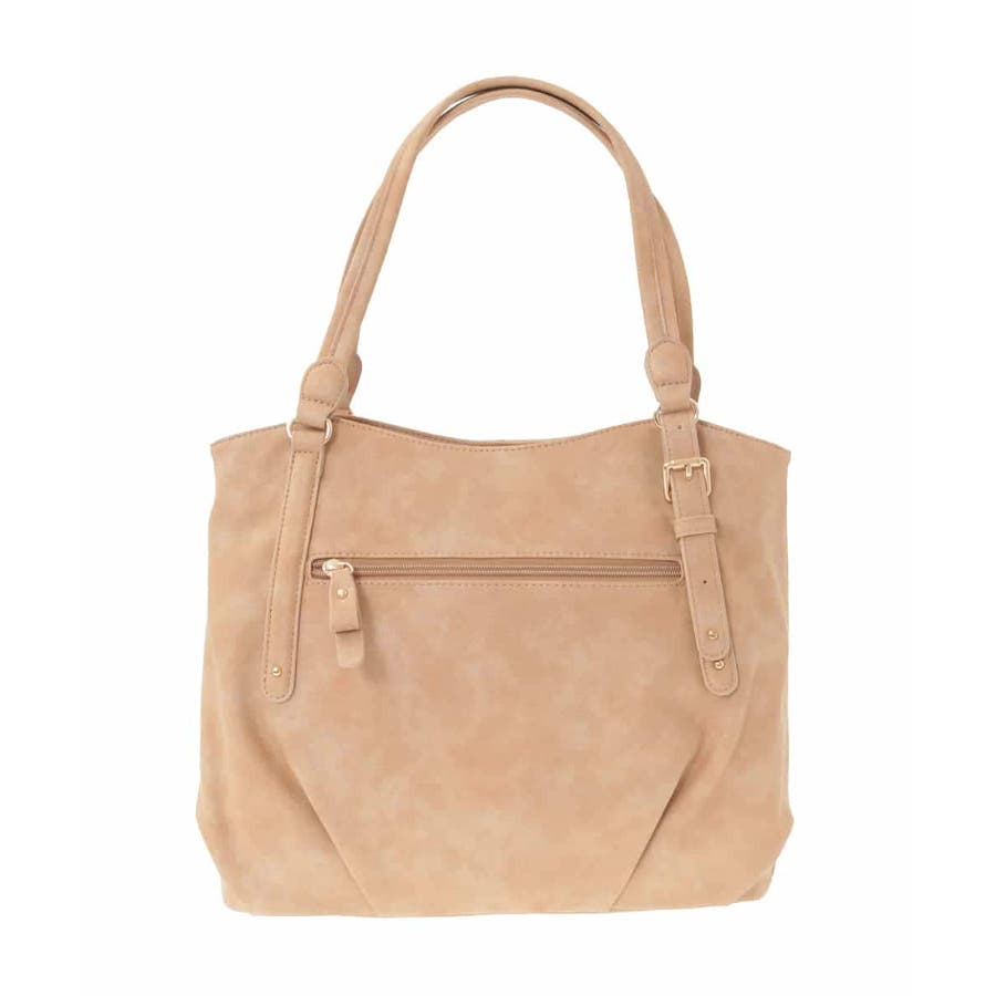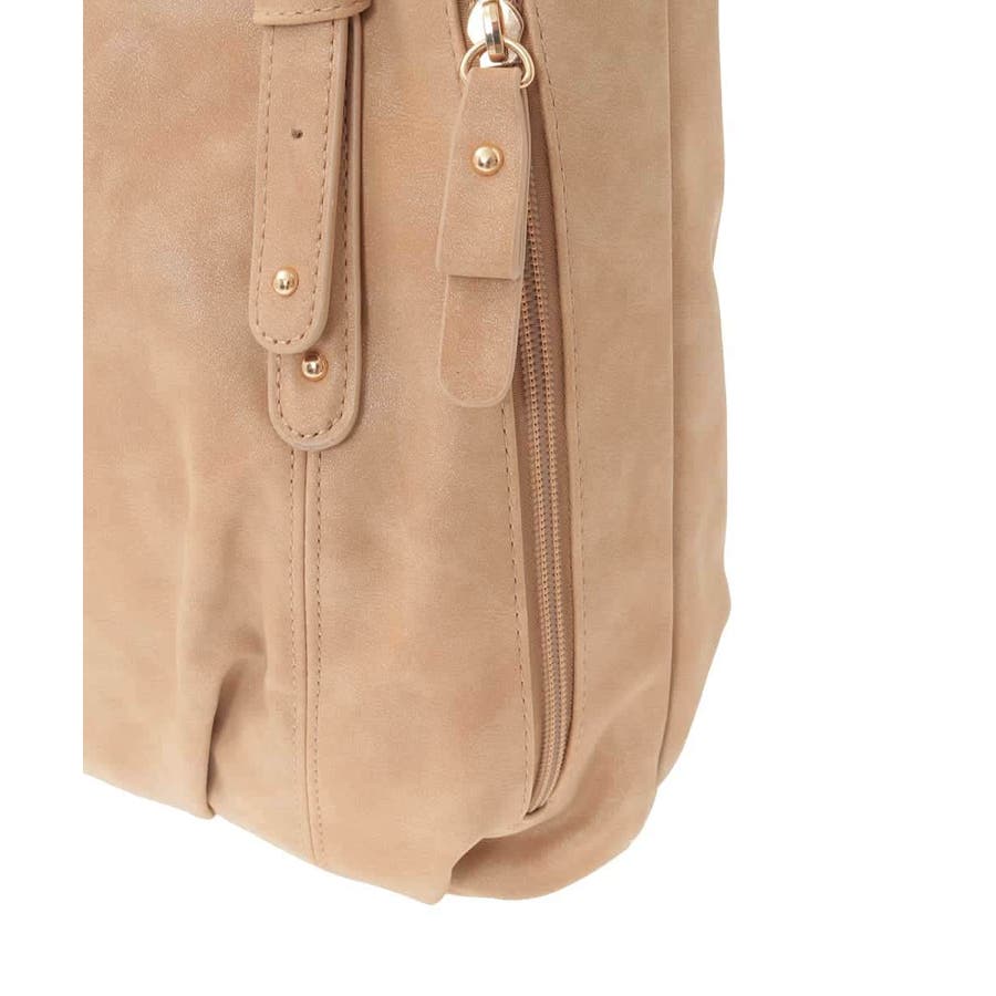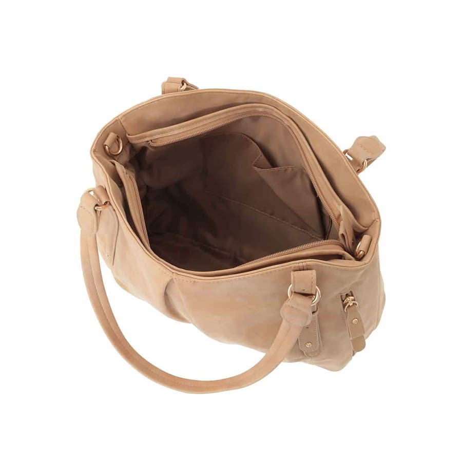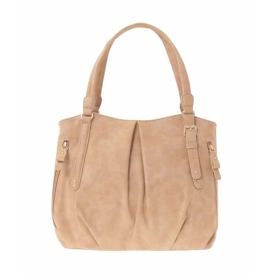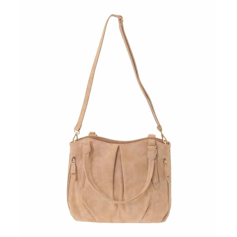 カーブトップにタックアクセントを効かせた女性らしいシルエットが魅力のひとつ。ベルトで長さ調節可能な持ち手や、2WAY使用でも合わせられるショルダー付きなのもポイントです。