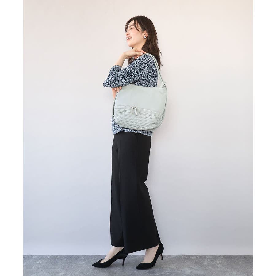 三角形のパンチングを施した洒落感あるディテールと、柔らかで品のあるレザー調生地が大人スタイルに馴染みやすいお作りです。
