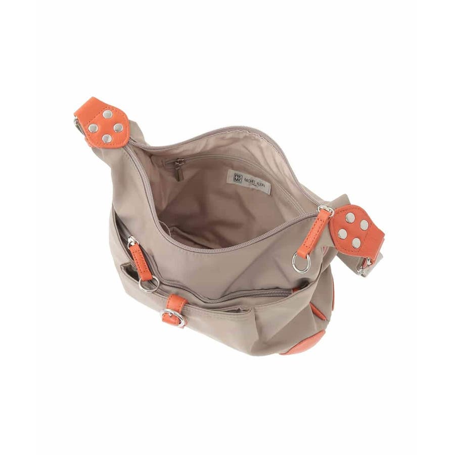 ナイロン混生地にレザーのパイピングを加えたMKバッグの定番ショルダーバッグです。生地には撥水加工を施しており、外出先で突然雨が降っても安心してお使いできるイージーケア仕様が魅力的。