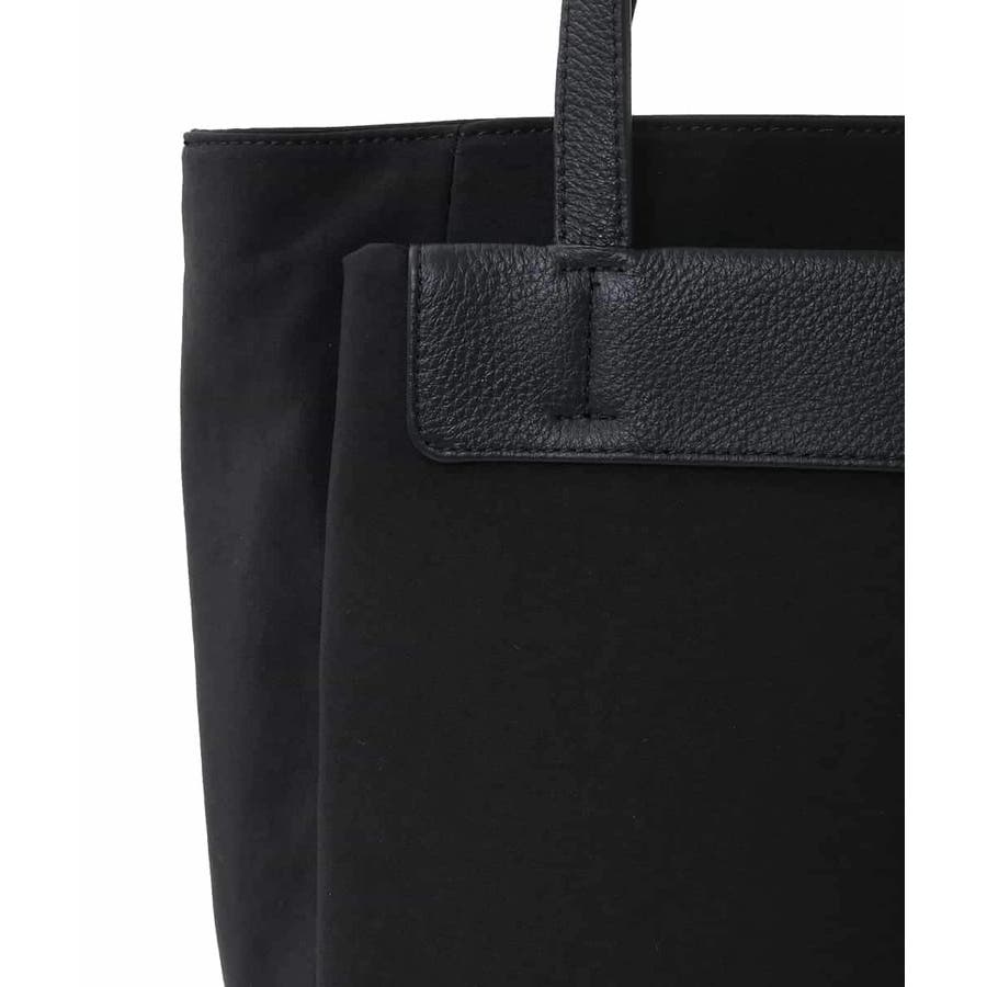 持ち手とポケット上部にカウレザーをジョイントして、品良く仕立てたナイロントートバッグです。