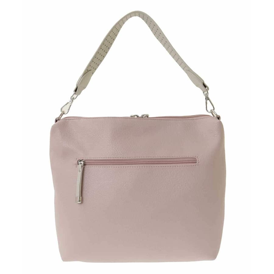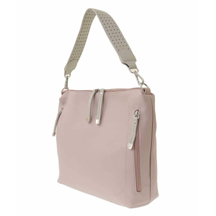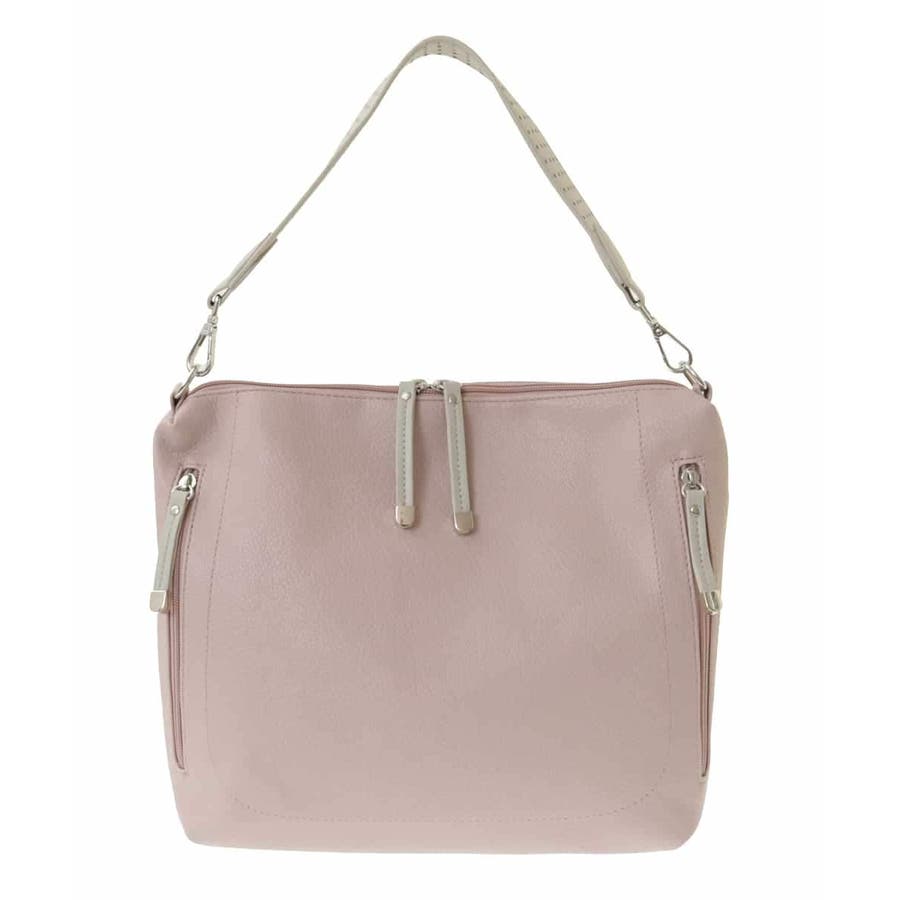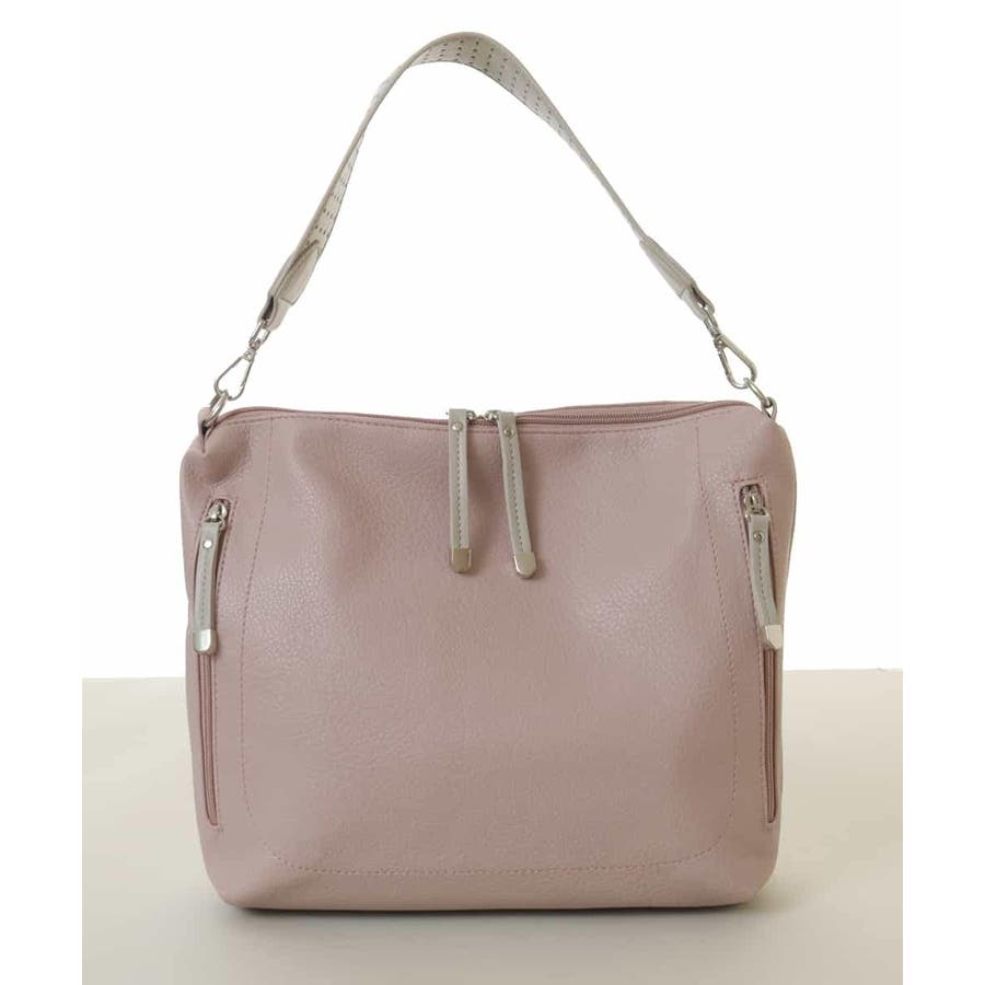 太めのパンチングハンドルに、メタル金具付きの引き手をアクセントにしたショルダーバッグです。ソフトな手触りの型押し合成皮革で上品な雰囲気に仕立てました。