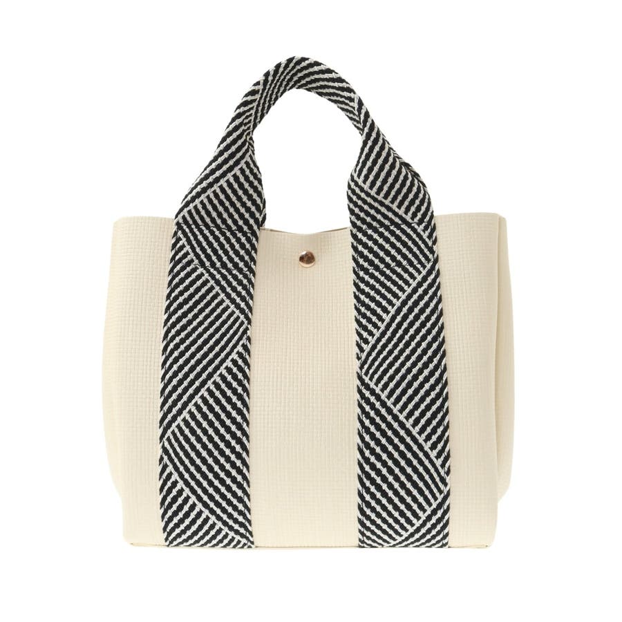 カゴバッグ風の編みデザインを型押しとプリントで表現した、お洒落なデザイントートです。