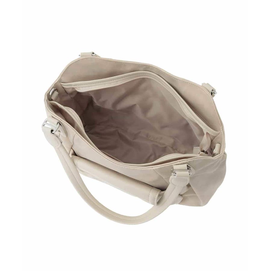 ほんのり光沢のあるマットなテキスタイルを使用した雰囲気あるトートバッグ。イレギュラーカットしたトップラインや、ギャザーで立体感を付けた女性らしいフォルムが印象的です。質感の異なるレザー調生地をパーツ使いしたフロントのフラップポケットがお洒落なポイント。三層構造の使い勝手の良いお作りでデイリーからお出かけまで幅広く活躍してくれます。