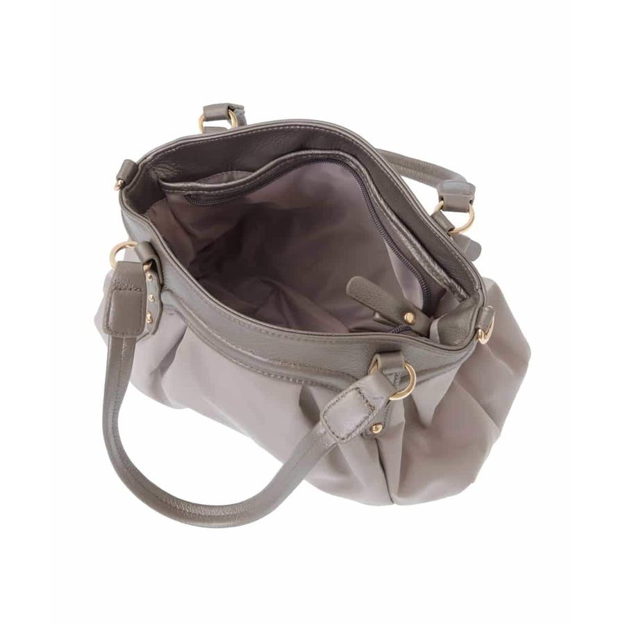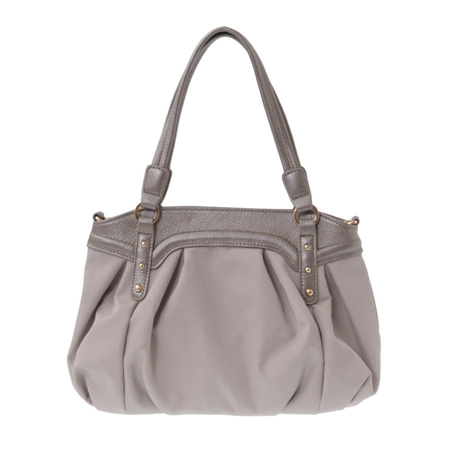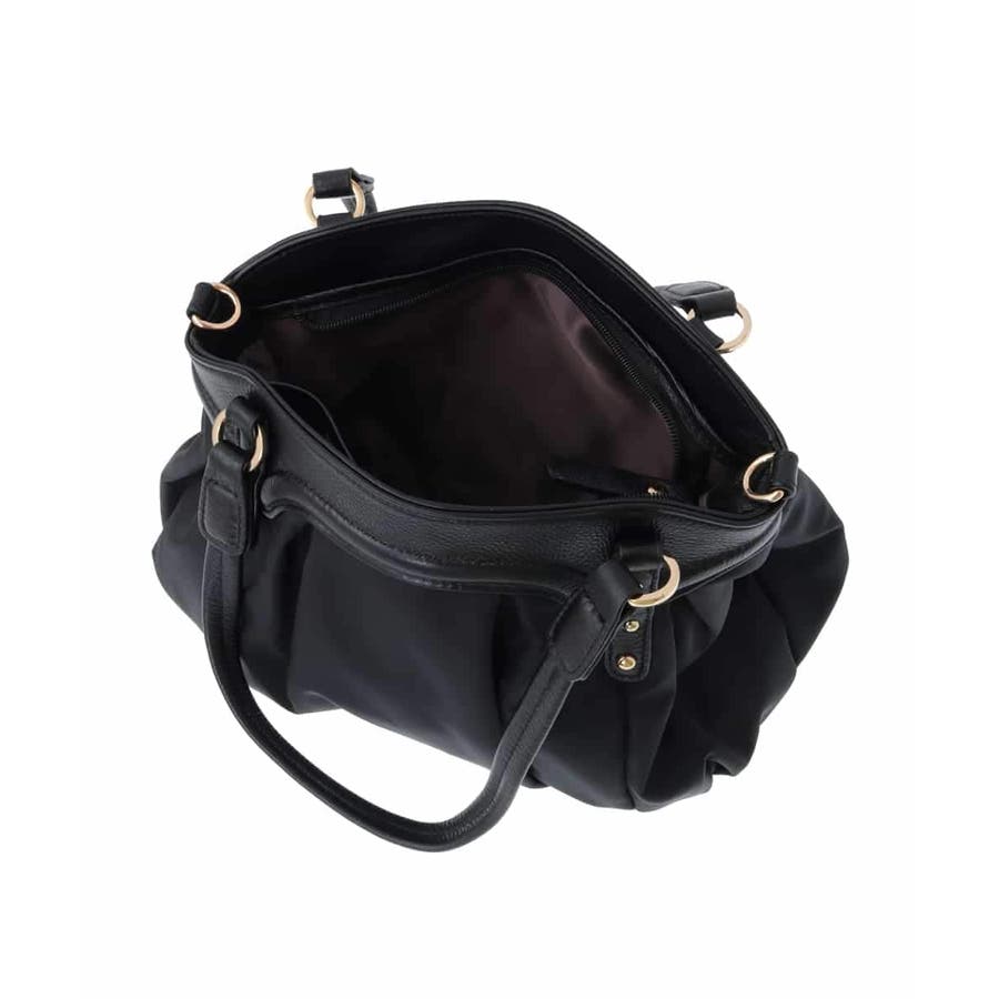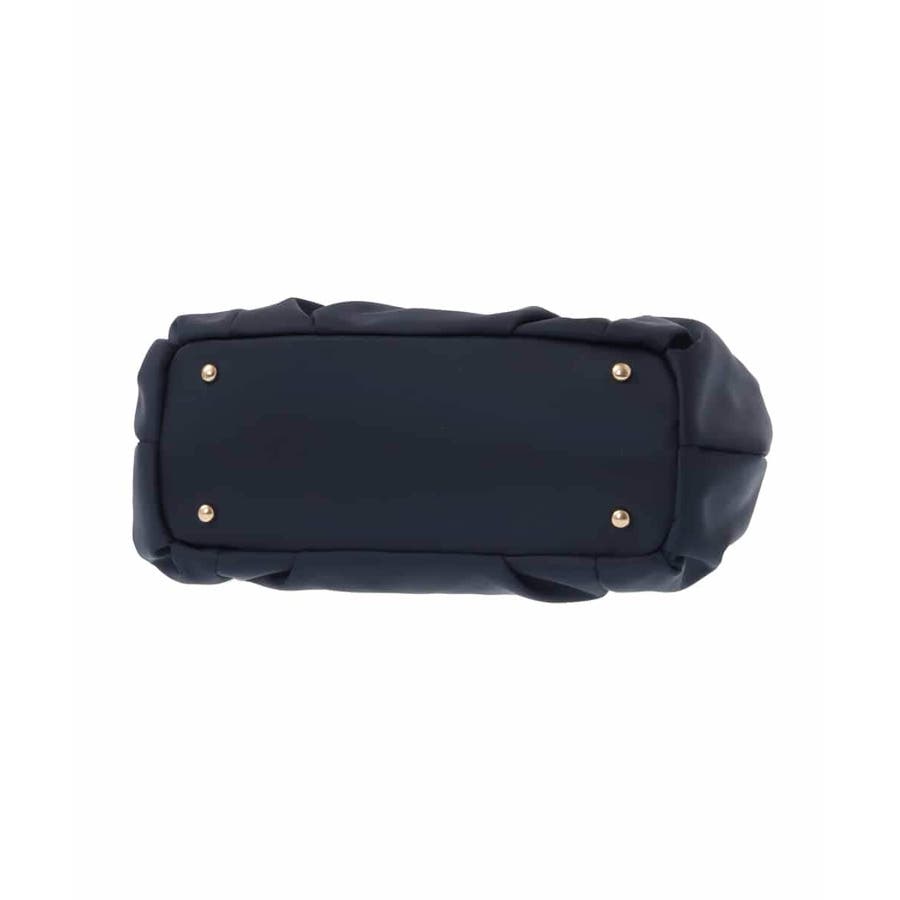 サイドにタックを入れた立体的なラウンドフォルムにメタルアクセントが高級感のあるお作りです。着脱可能なストラップ付きでショルダーバッグとしても使える便利な2WAY仕様。