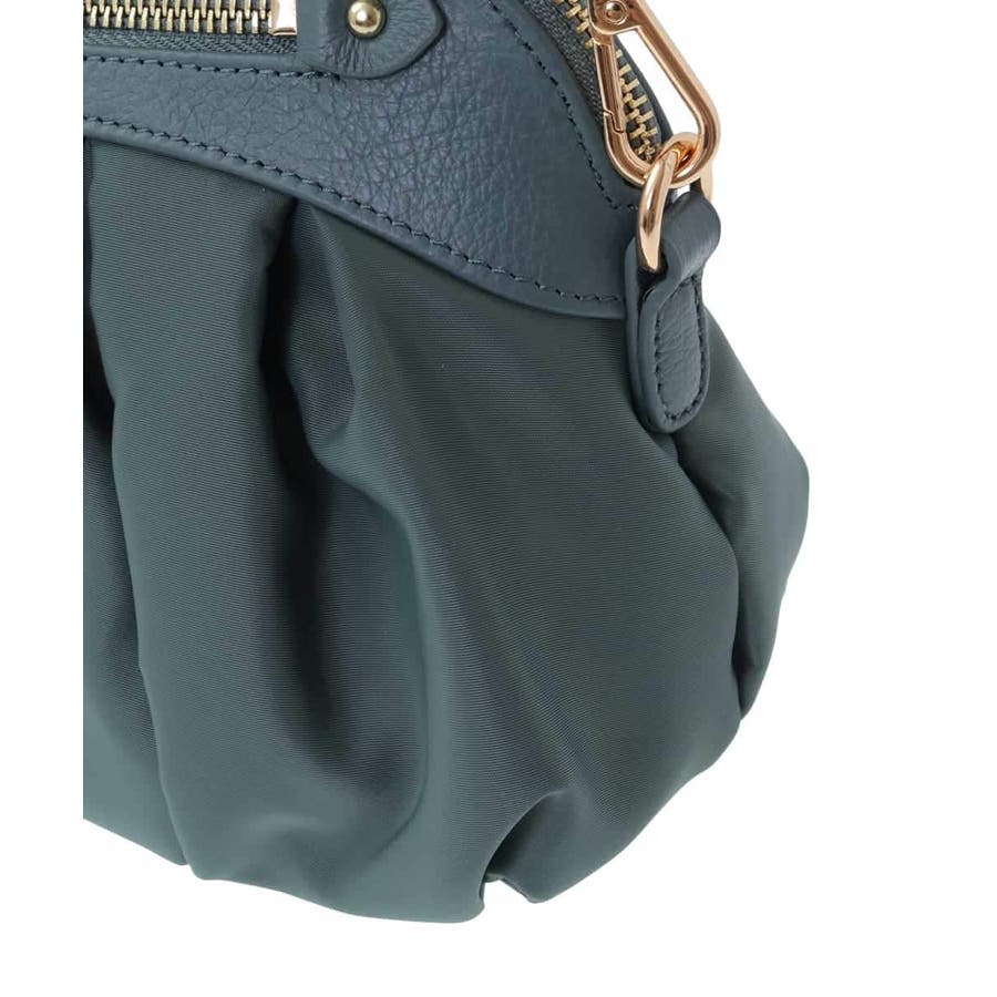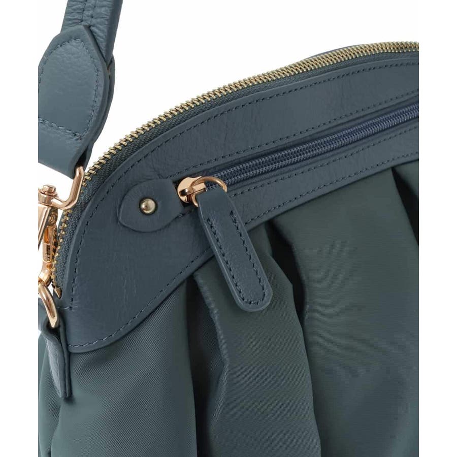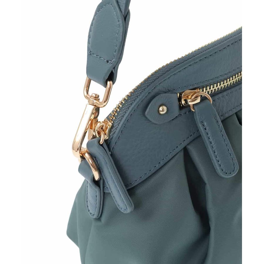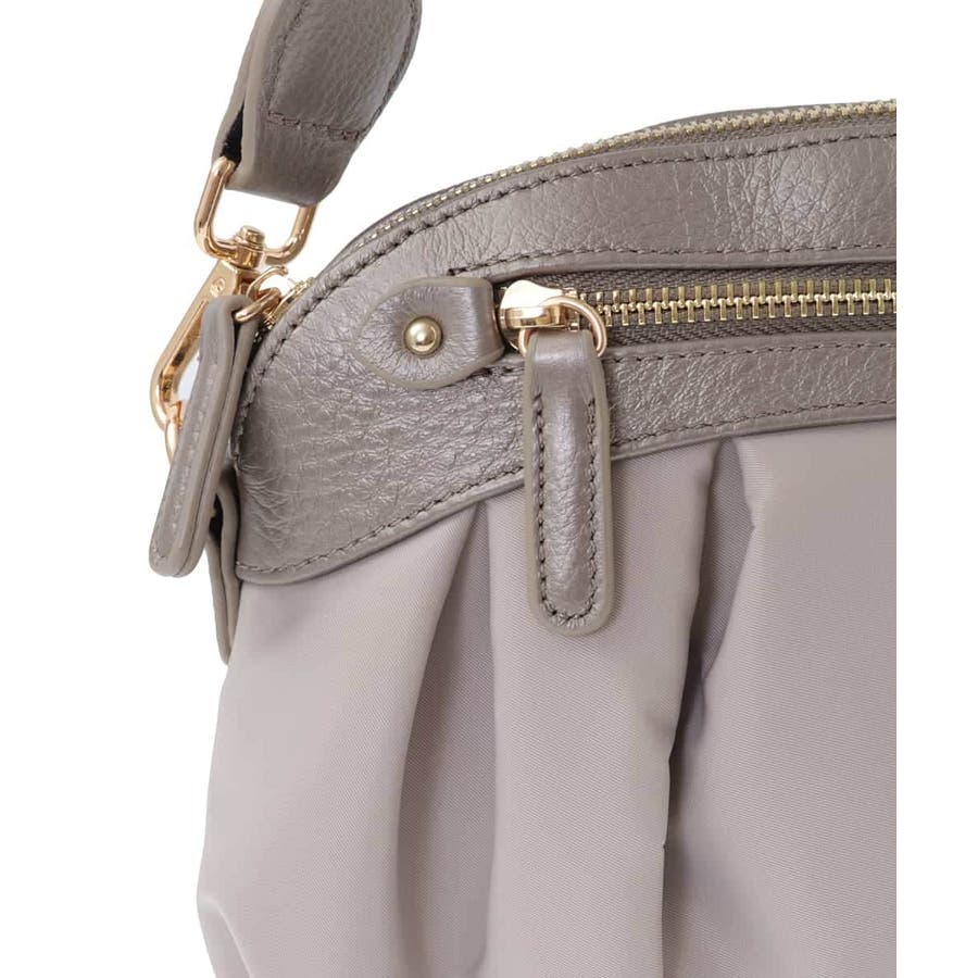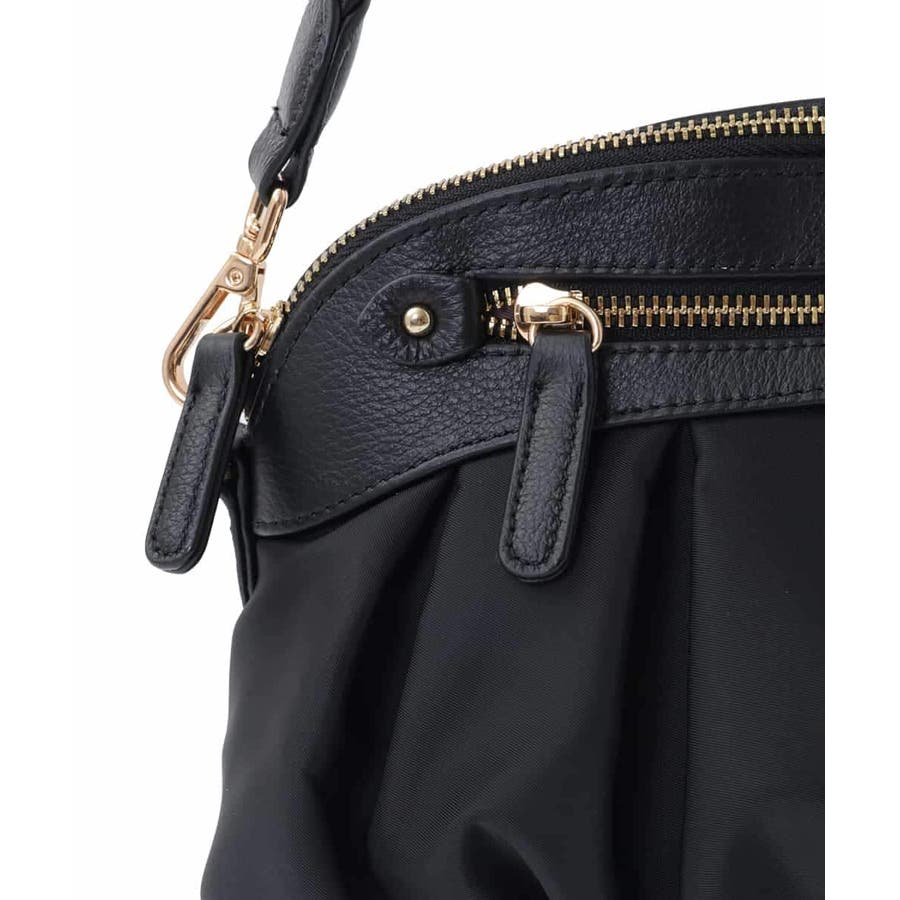 撥水加工を施したナイロンベース生地に、上品なカウレザーを異素材ドッキングしたコンパクトバッグ。