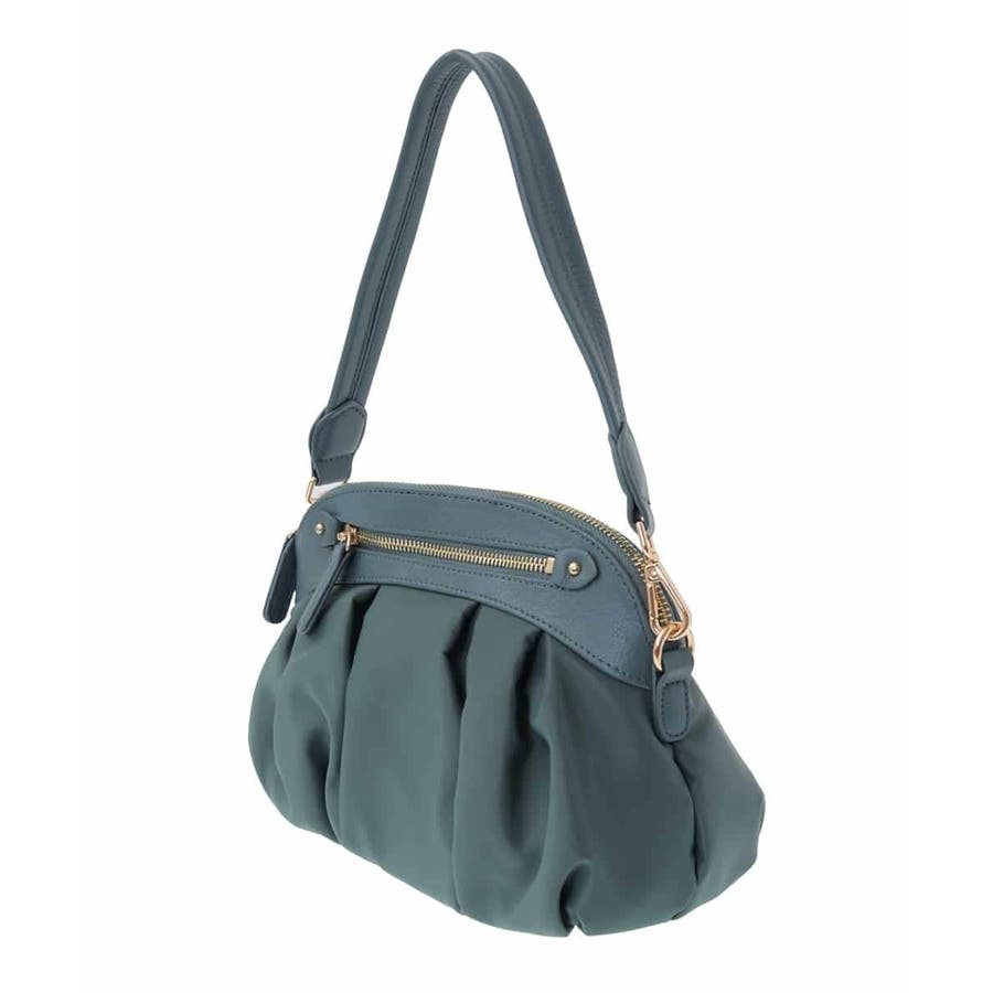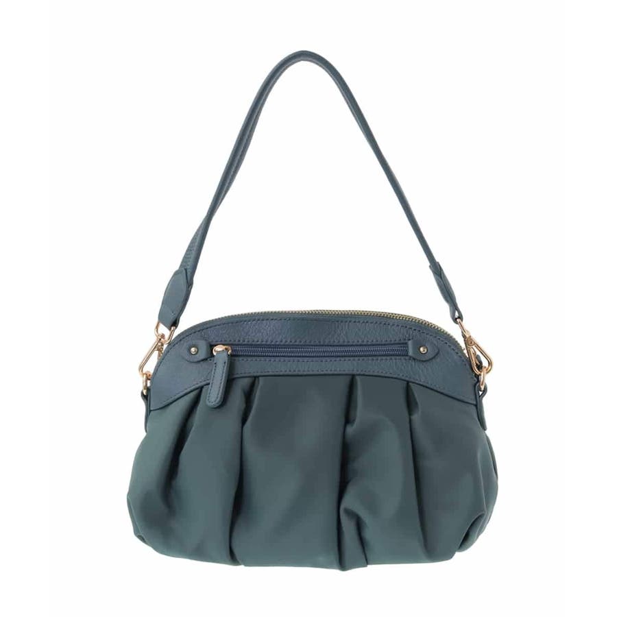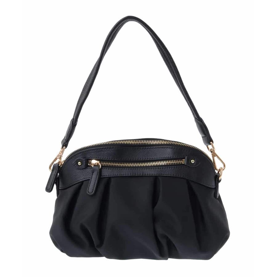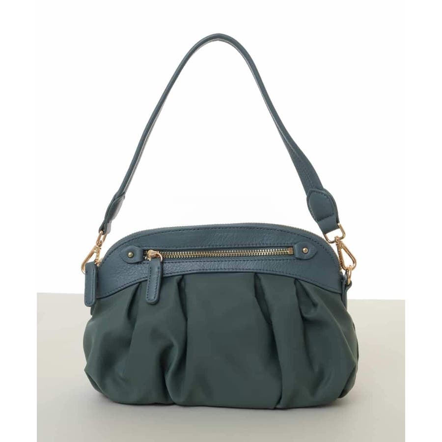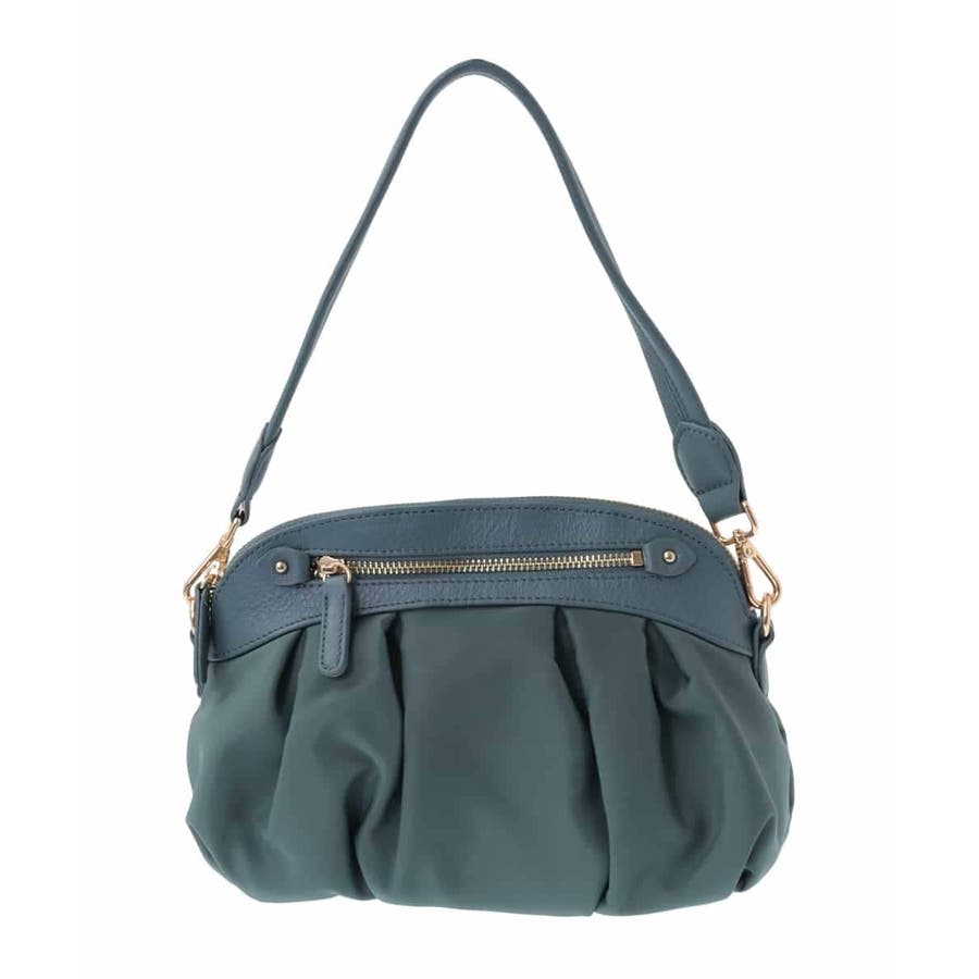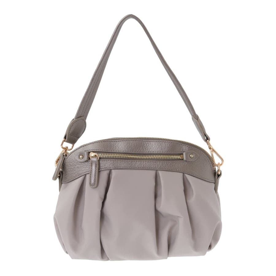 撥水加工を施したナイロンベース生地に、上品なカウレザーを異素材ドッキングしたコンパクトバッグ。