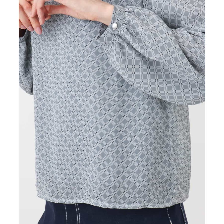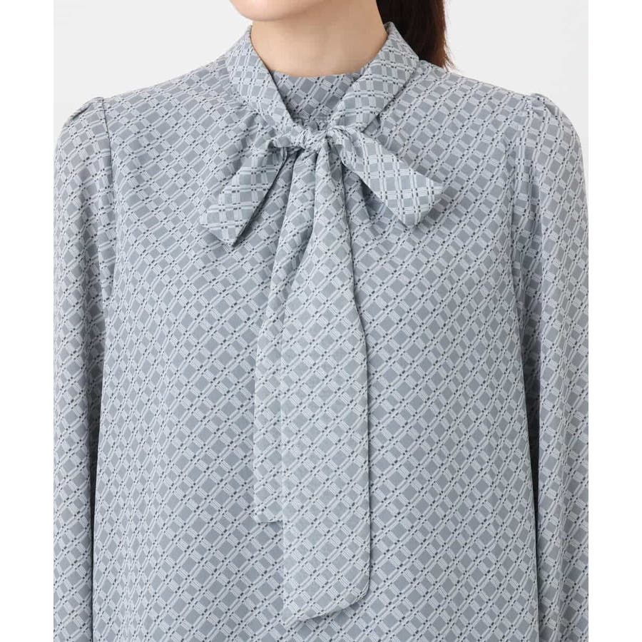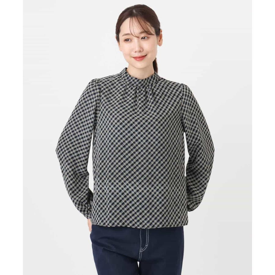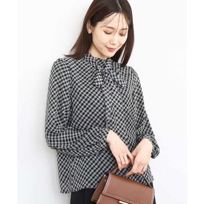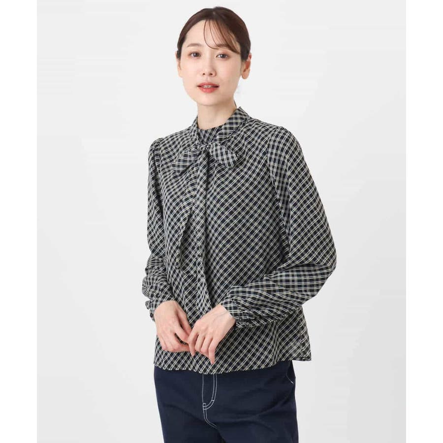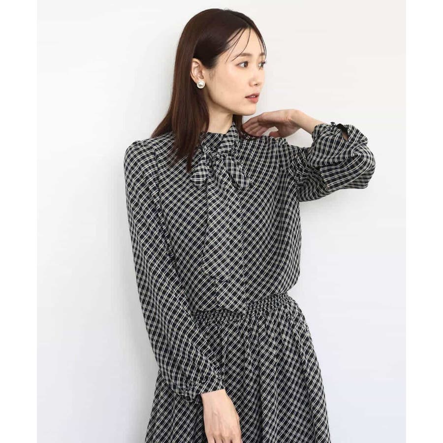 上品な印象のチェック柄のシフォンブラウス。取り外し可能のボウタイ付きで2wayで着こなし可能です。タイを外すと低めのスタンドネックで首元がクラシカルな印象に。