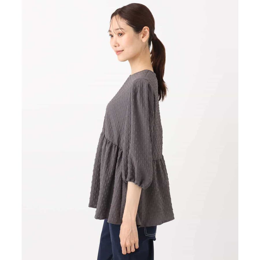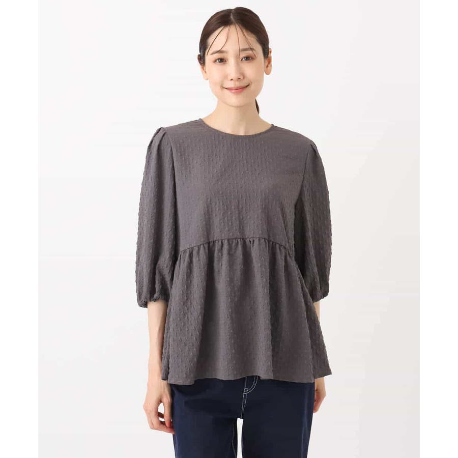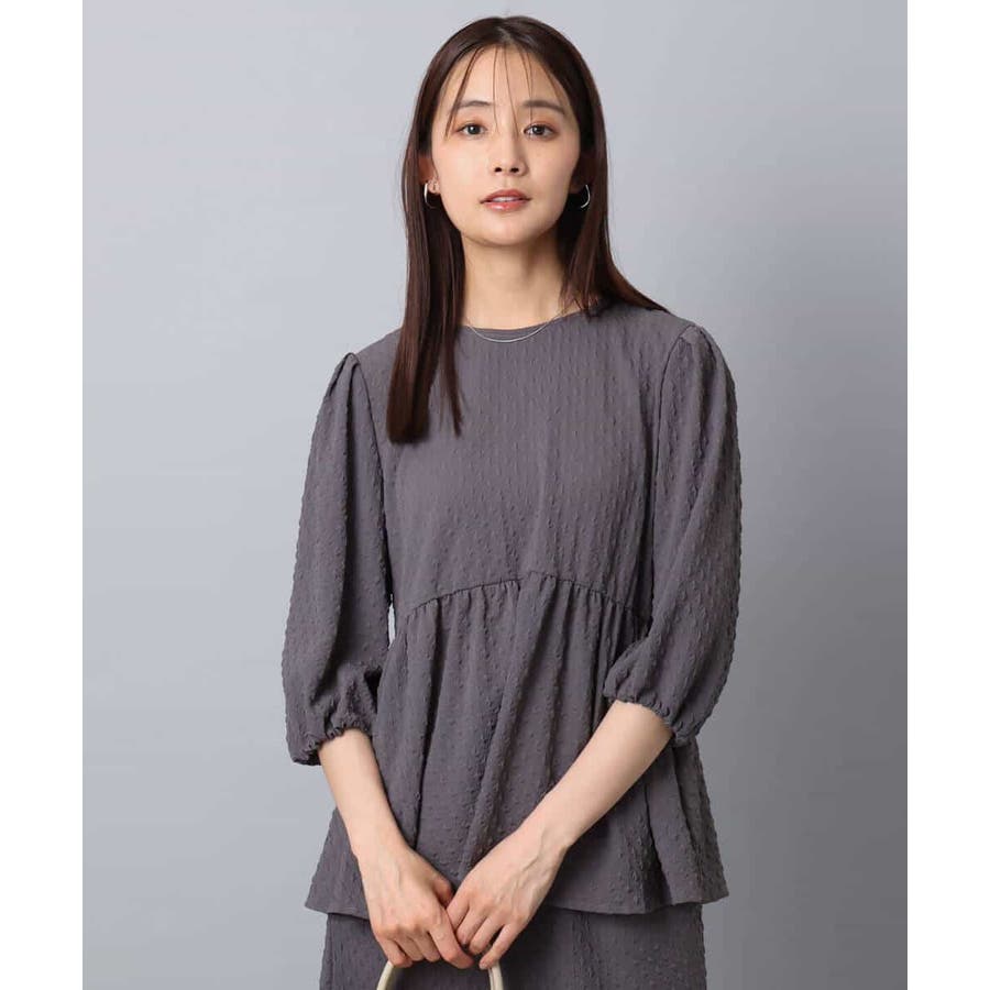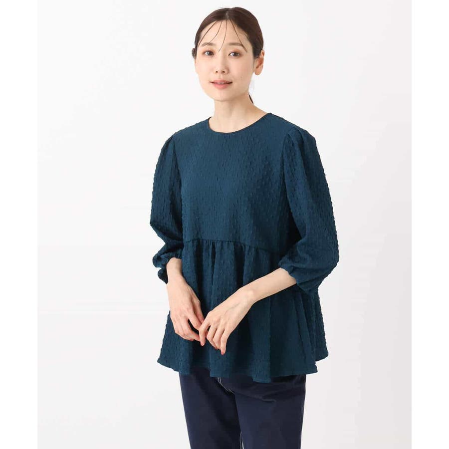 ペプラムの切り替え位置を高めにすることですっきり見えが叶うデザインに仕上げたブラウス。凹凸のある生地がシンプルなシルエットに映えポイントに。肘が隠れる袖丈は着用できるシーズンが長いのも嬉しい。