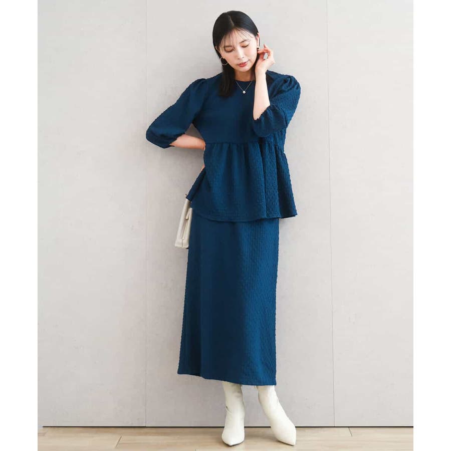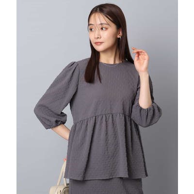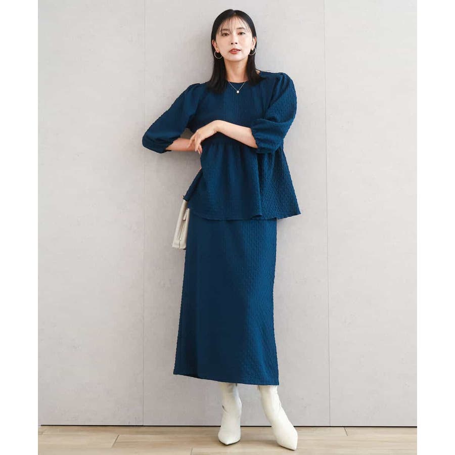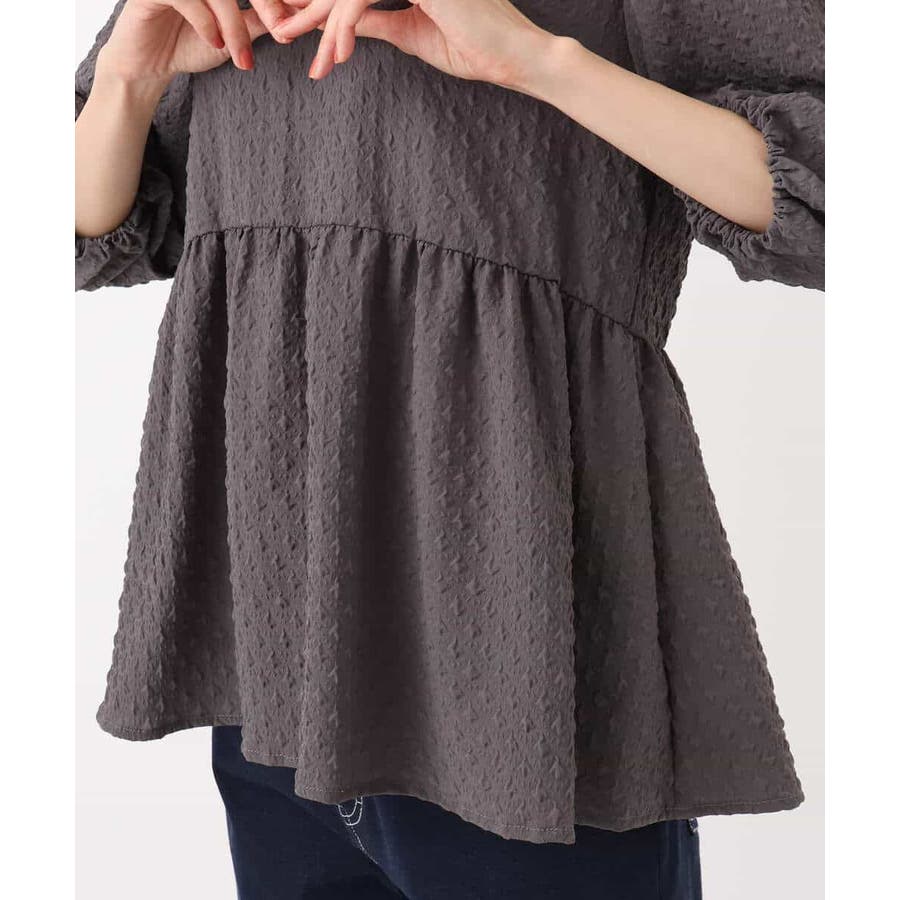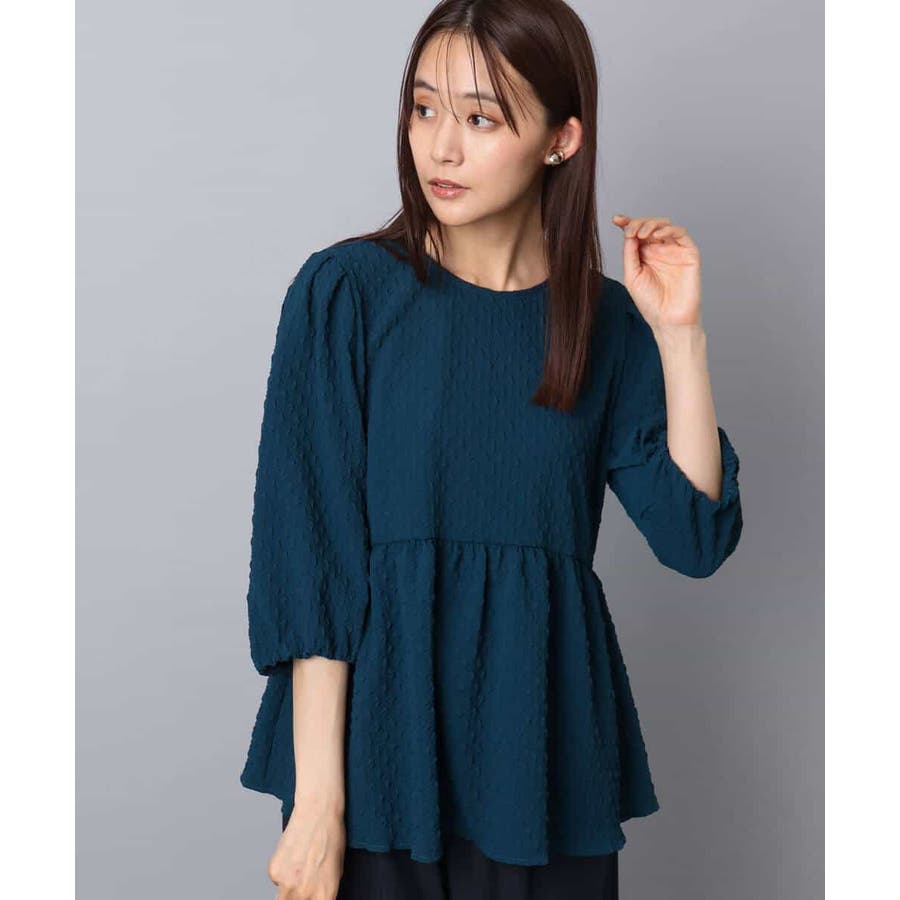 ペプラムの切り替え位置を高めにすることですっきり見えが叶うデザインに仕上げたブラウス。凹凸のある生地がシンプルなシルエットに映えポイントに。肘が隠れる袖丈は着用できるシーズンが長いのも嬉しい。