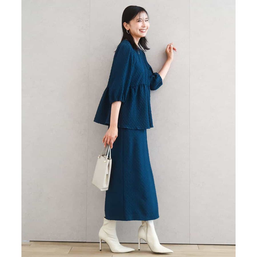 ポコポコ凹凸のある素材感がオシャレ見えするブラウスとスカートをセットアップで着用しております。肌にまとわりつきにくく、軽くサラリとした質感なので、まだ暑さが残る季節の変わり目にもおすすめです。(肌寒い時は暖かめのインナーで温度調節しても良いと思います。)