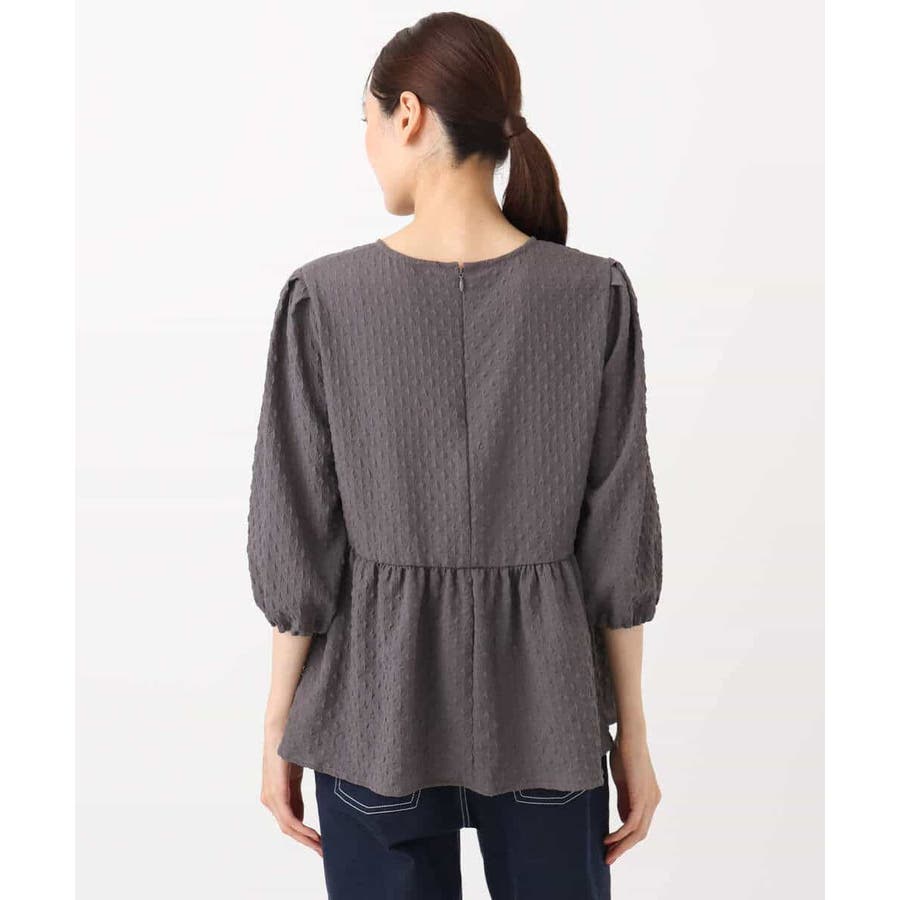 凹凸のあるエンボス素材がポイント!シンプルなシルエットに華やかさがあるブラウスです。ペプラムの切り替え位置が高めになっており、すっきりと見せながら体型カバーも◎袖は肘まで覆い気になる部分をカバーしてくれます。