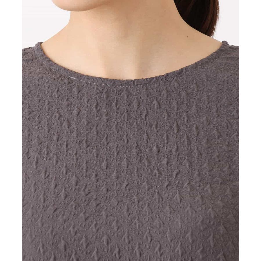 エンボス加工を施した素材を使用。ジャガードのような見え感ですが、とても軽いところがポイントで、生地表面の凹凸により、肌にまとわりつかず快適に着用できます。
