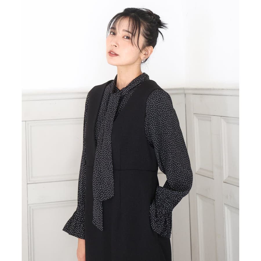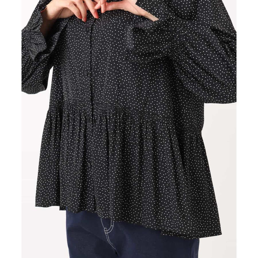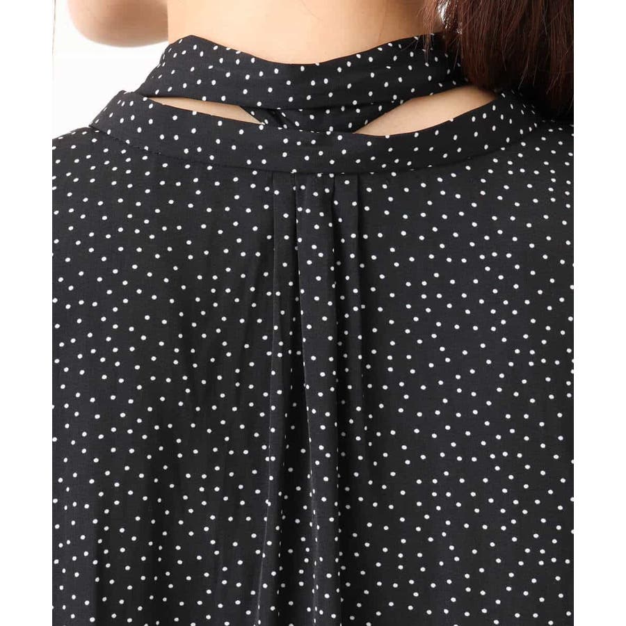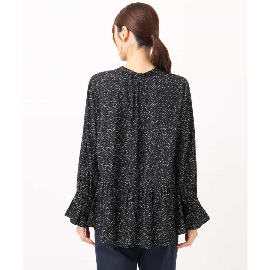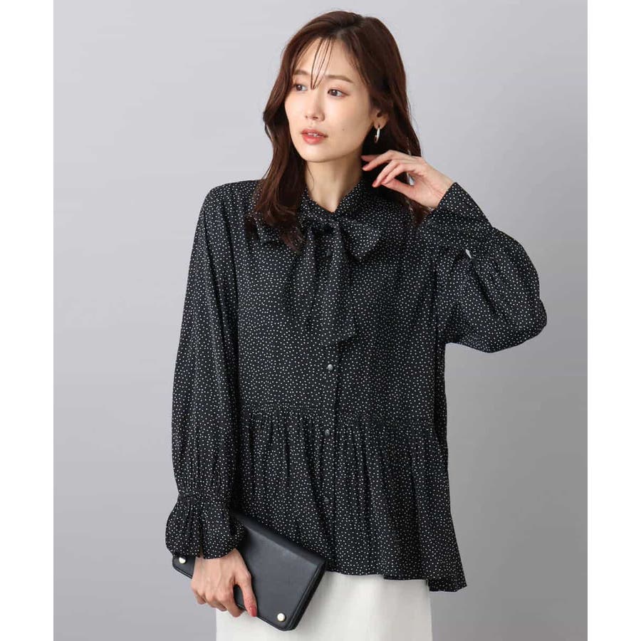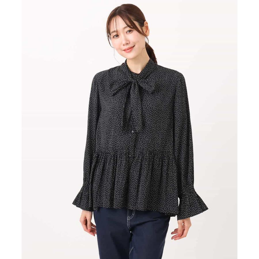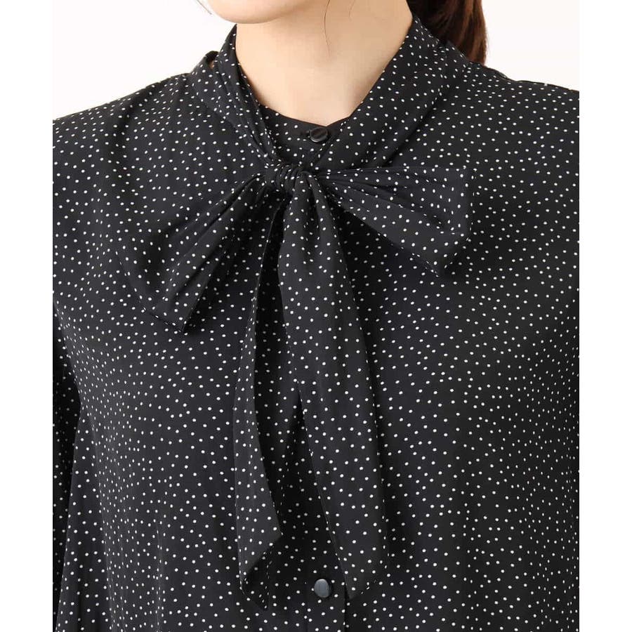 一枚着としてはもちろん、ニットやカーディガンを重ねても楽しめるブラウス。アイボリーは無地、ブラックは大人見えする変形ドット柄の展開です。ウエスト下部分に繊細なギャザーを寄せてデザインポイントに。ヒップが隠れる着丈は安心感も◎ボウタイは取り外し可能。