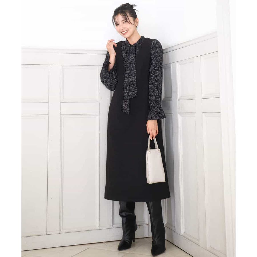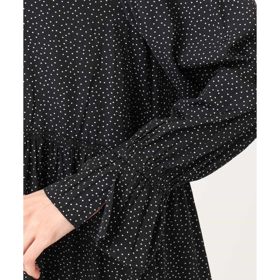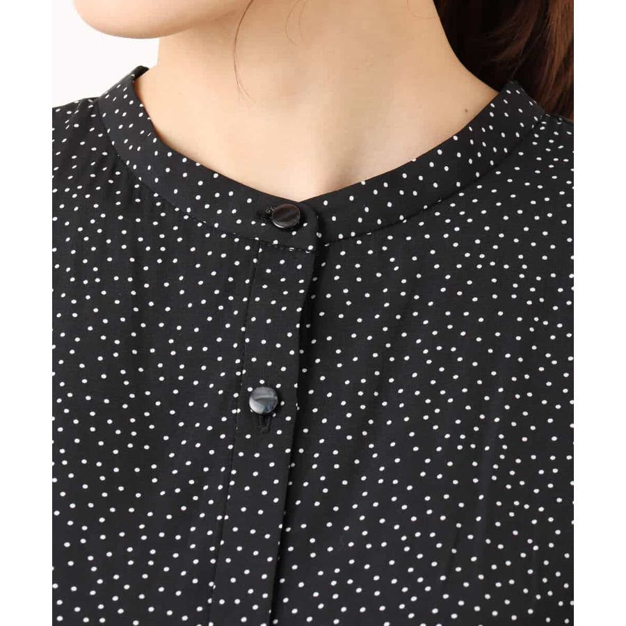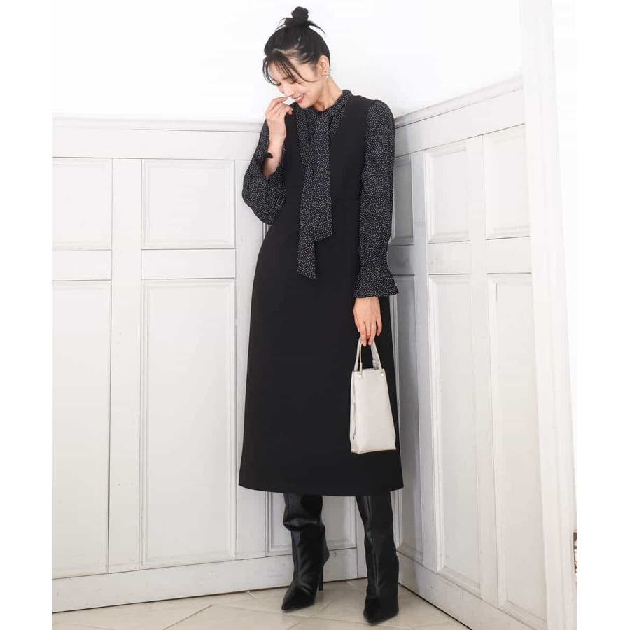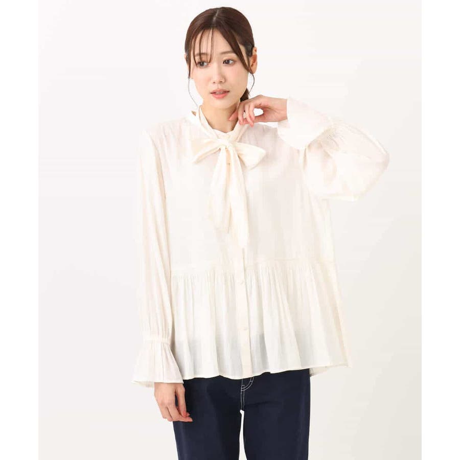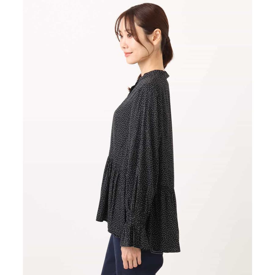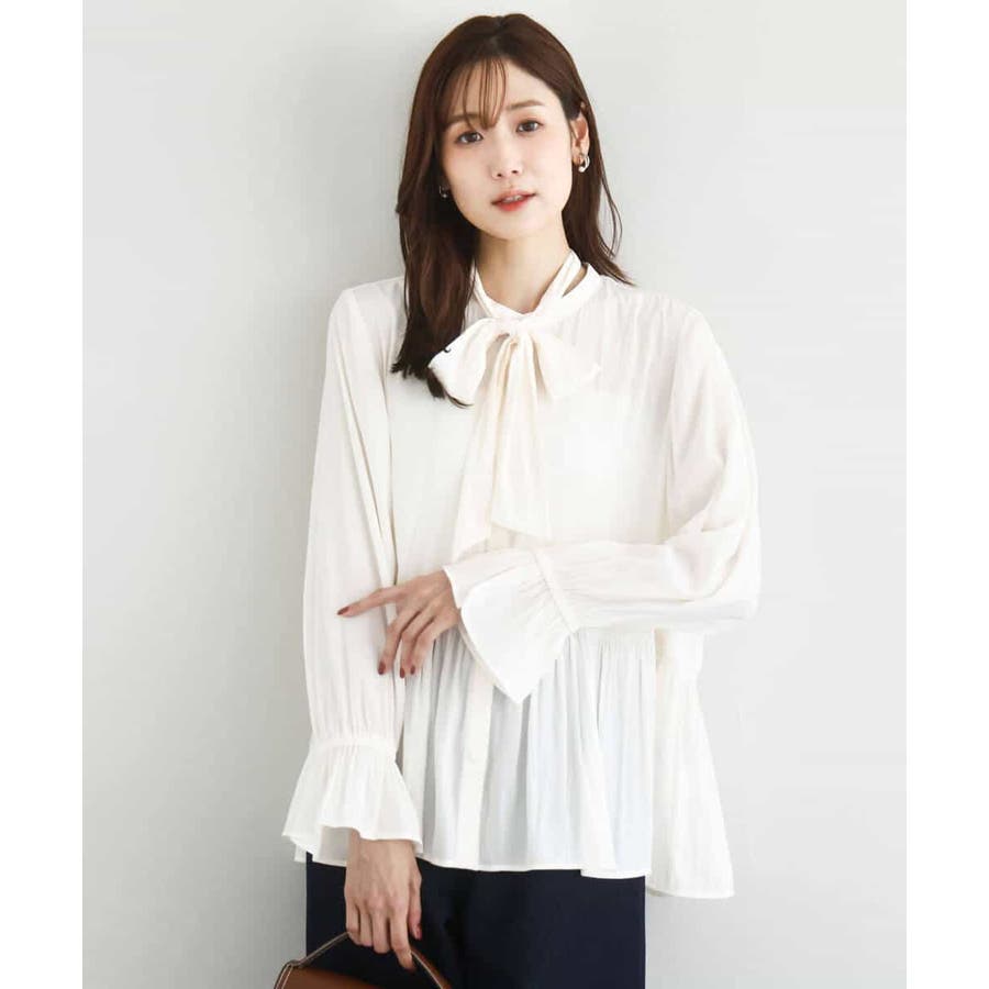 一枚着としてはもちろん、ニットやカーディガンを重ねても楽しめるブラウス。アイボリーは無地、ブラックは大人見えする変形ドット柄の展開です。ウエスト下部分に繊細なギャザーを寄せてデザインポイントに。ヒップが隠れる着丈は安心感も◎ボウタイは取り外し可能。