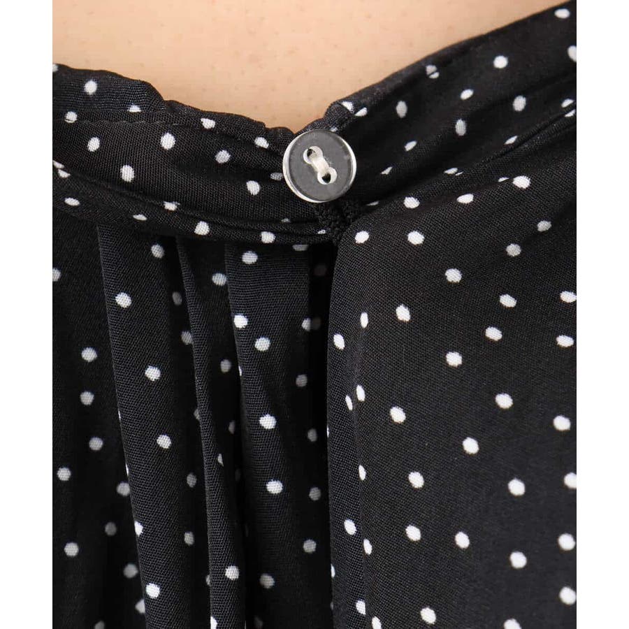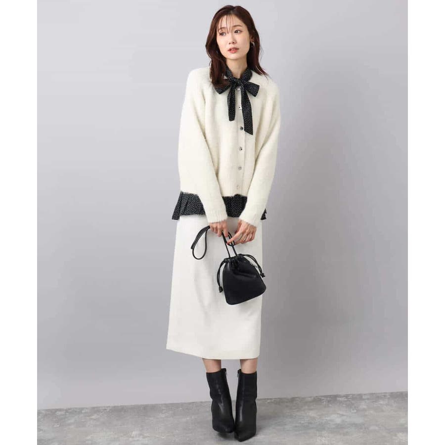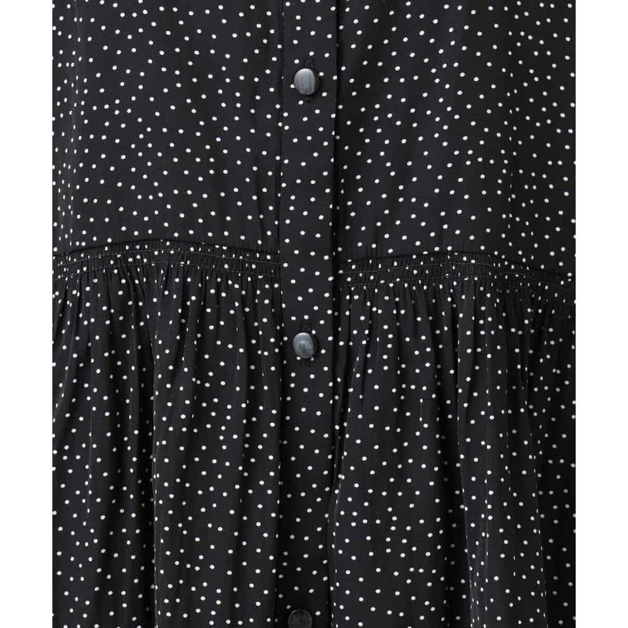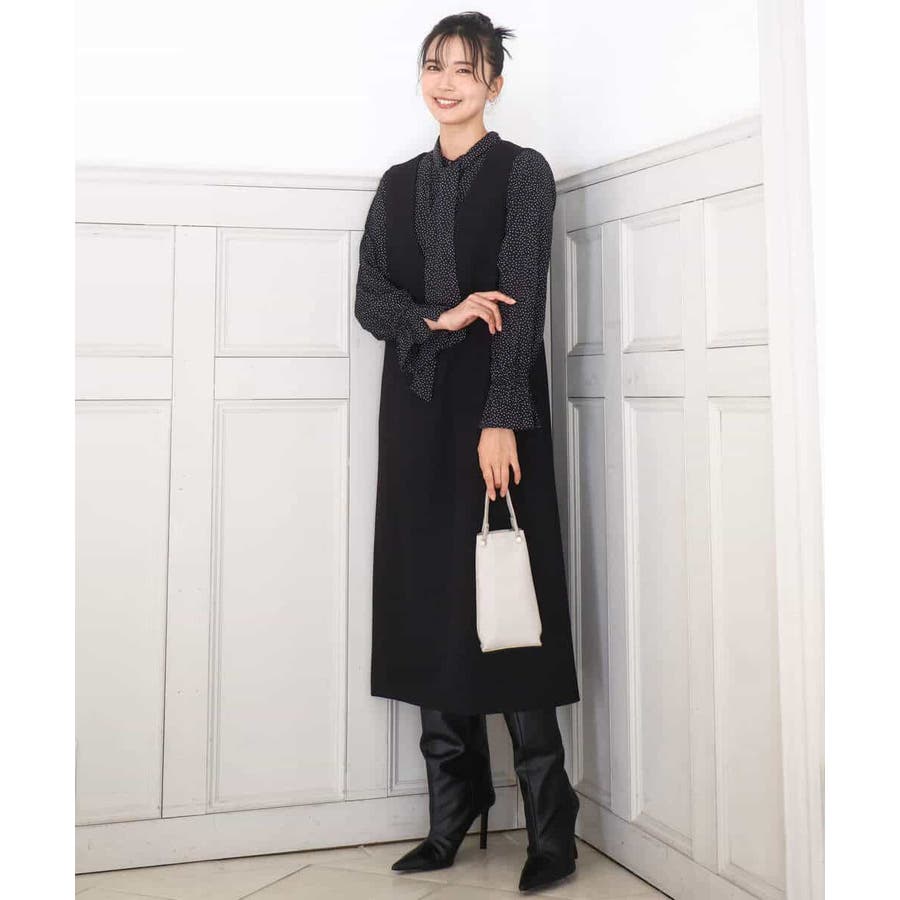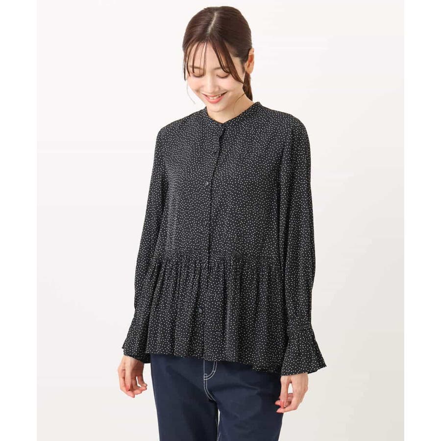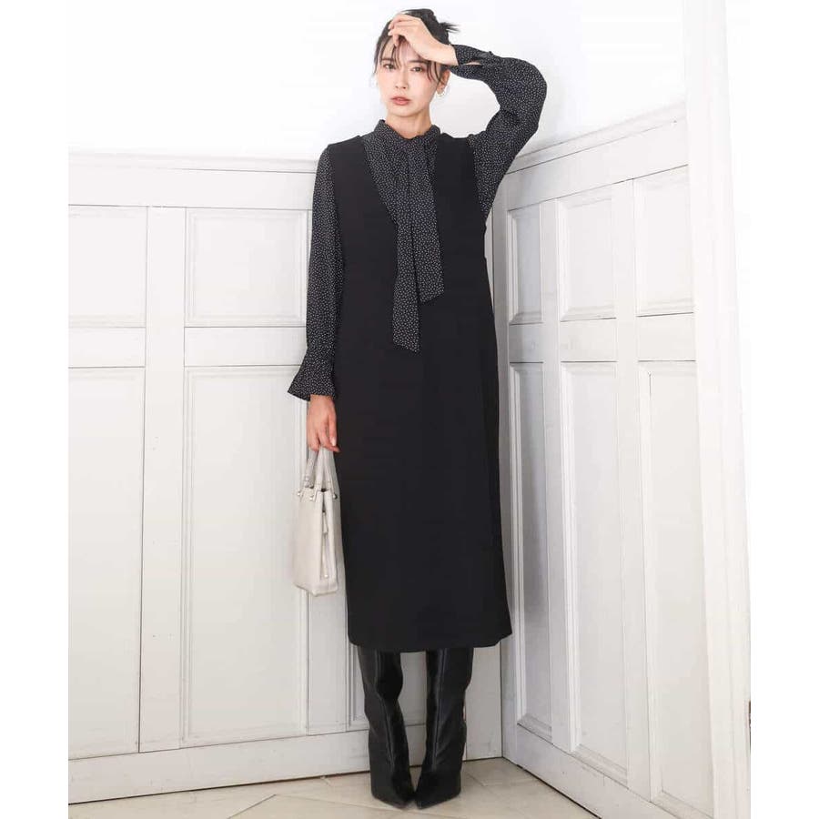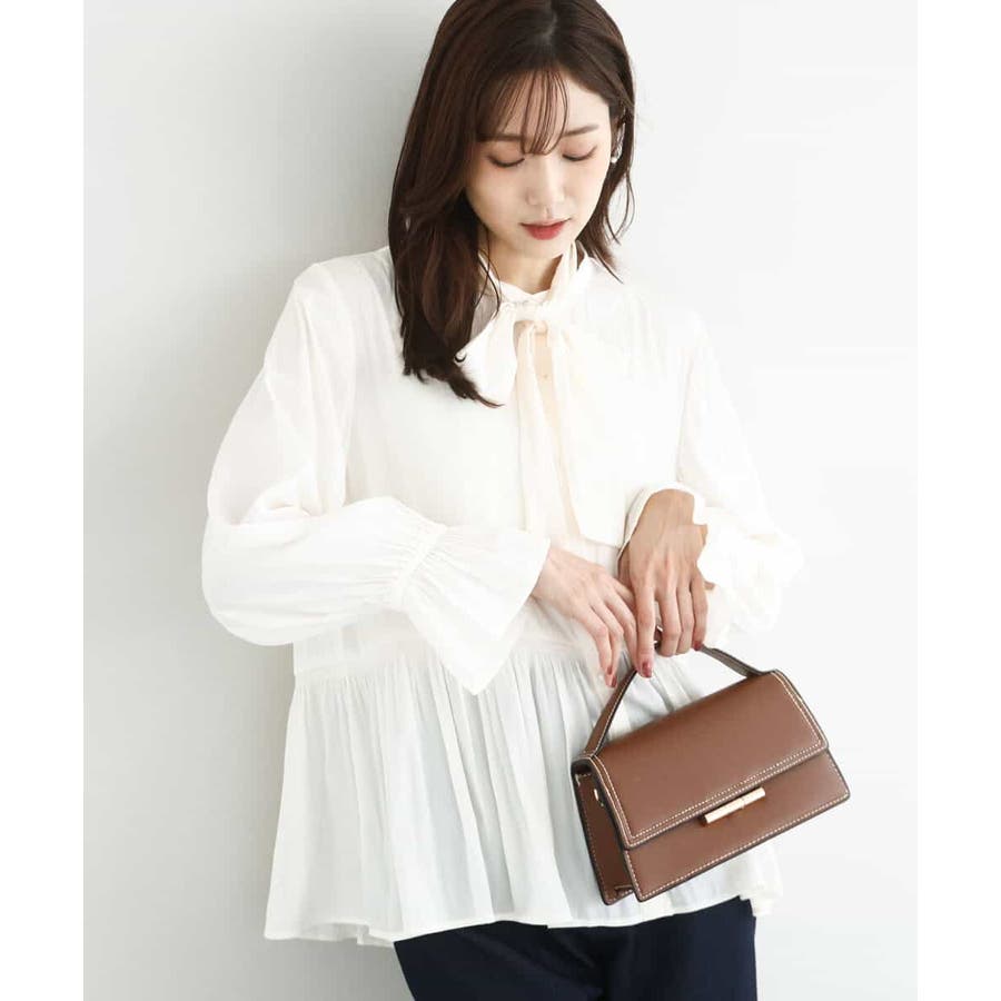 一枚着としてはもちろん、ニットやカーディガンを重ねても楽しめるブラウス。アイボリーは無地、ブラックは大人見えする変形ドット柄の展開です。ウエスト下部分に繊細なギャザーを寄せてデザインポイントに。ヒップが隠れる着丈は安心感も◎ボウタイは取り外し可能。