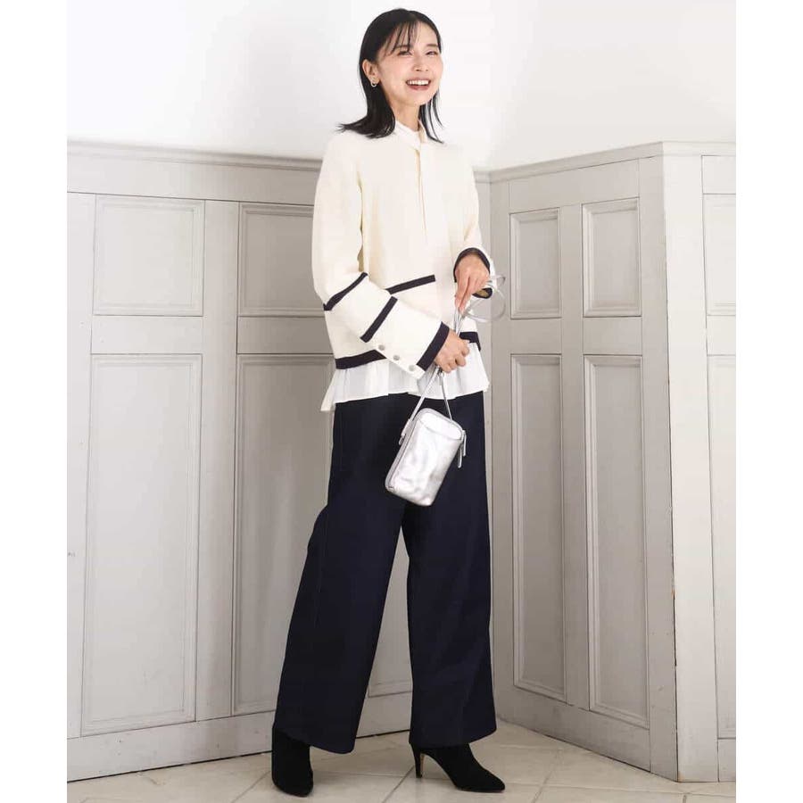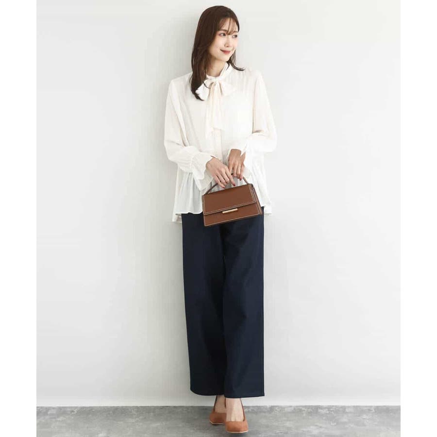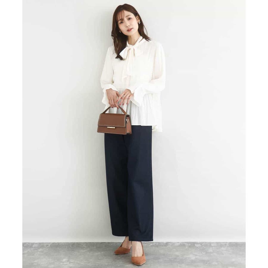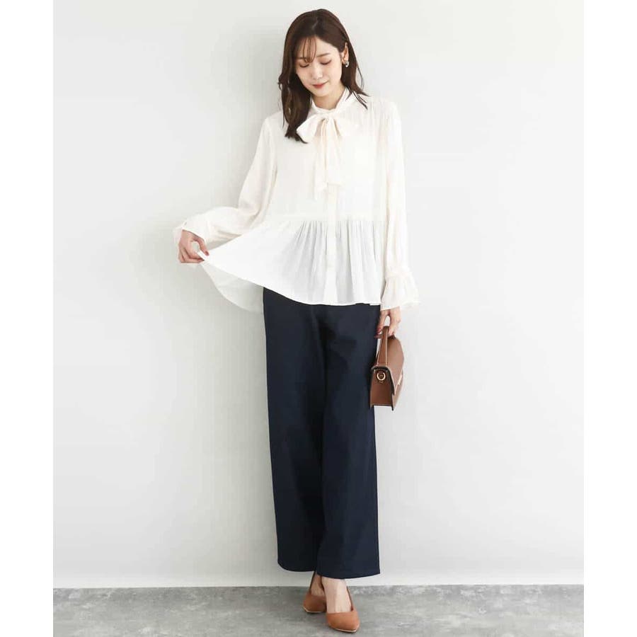 ウエスト下からギャザーで広がるペプラムシルエットは、パンツやナロースカートと好相性。ラクチンなのにきれい見えが叶います。ほかにもジャンスカのインナーに着こなしたり、ニットやカーディガンと重ねたりと、ボウタイデザインがコーディネートのアクセントになってくれるはず。