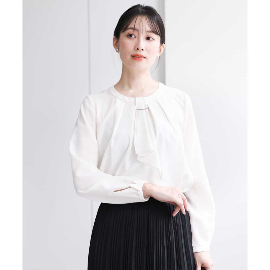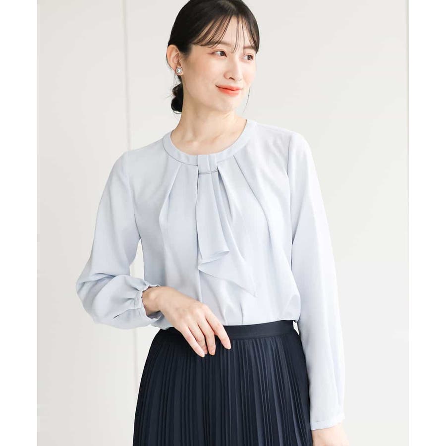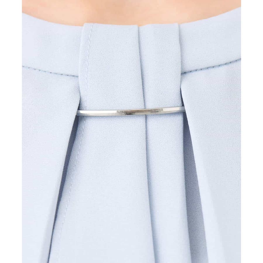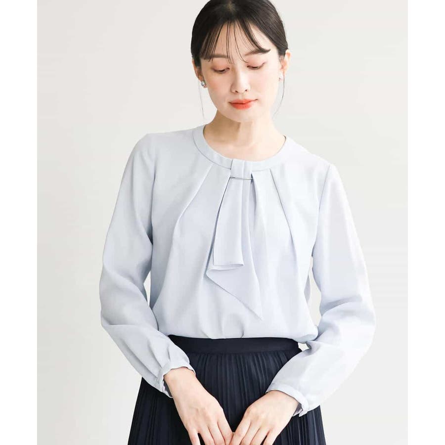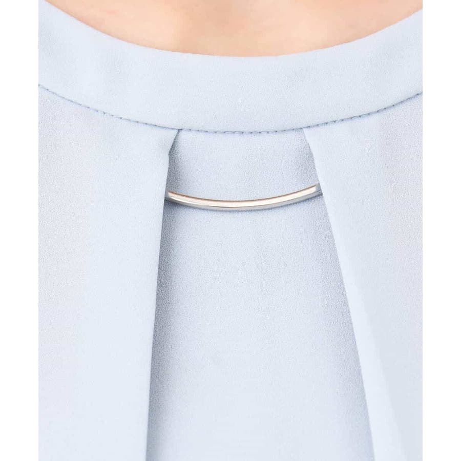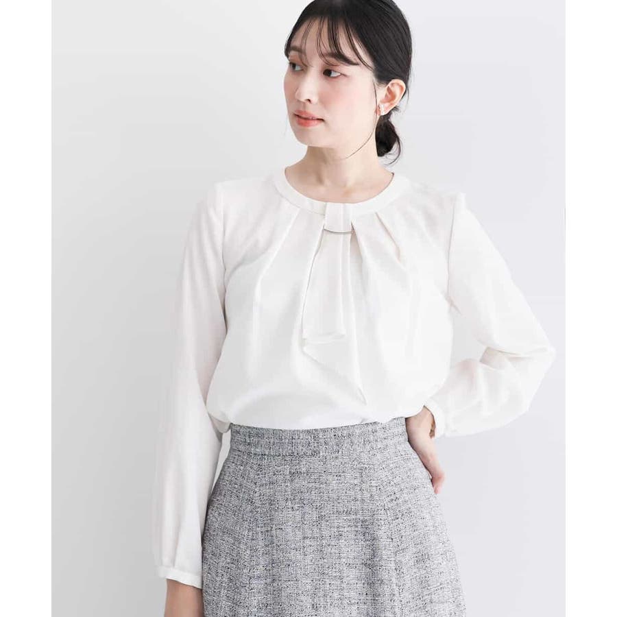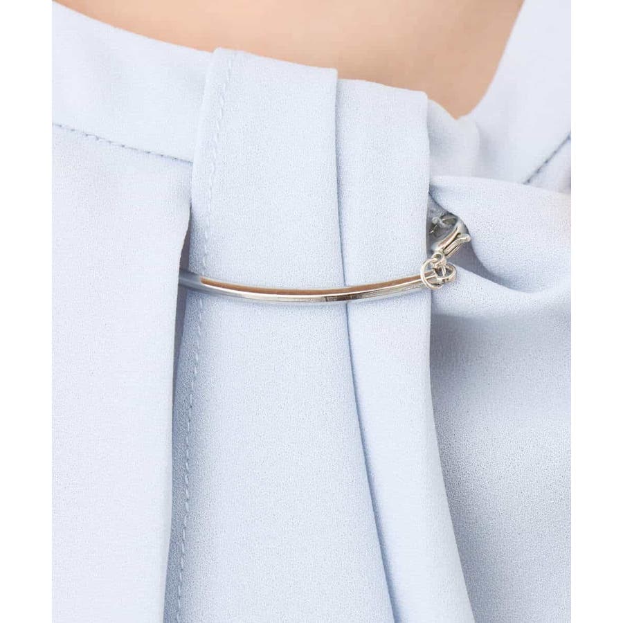 きれいめブラウスはオフィスシーンからセレモニーまで幅広く着回せます。例えばジャケットを羽織るときはボウタイ部分を内側に隠しメタルバーのみや何もなしのシンプルな状態で、一枚で着こなすときはボウタイで華やかに、とコーデに合わせてぜひ着こなしの違いを楽しんでください。