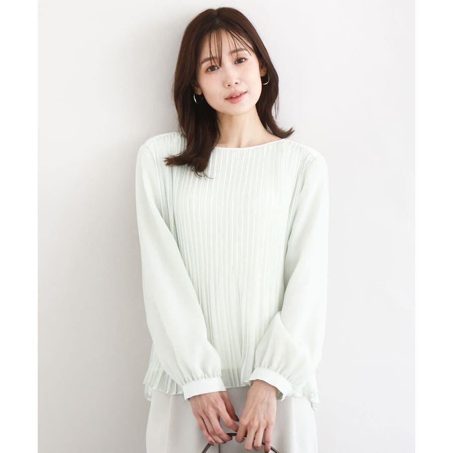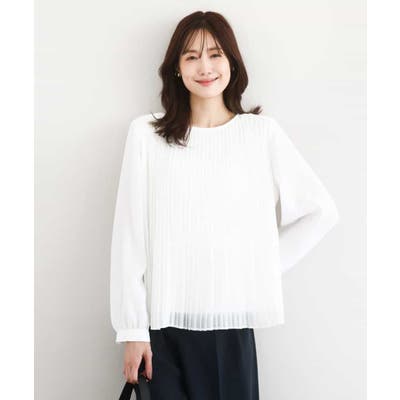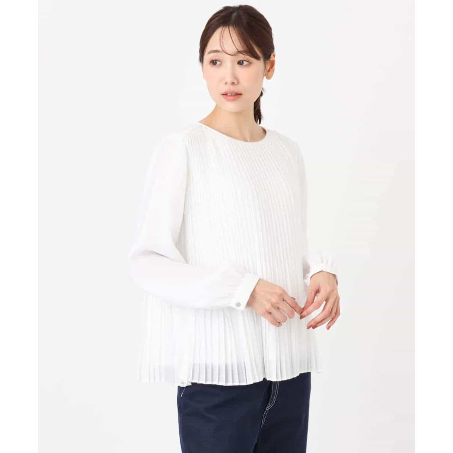 2段階にプリーツを切り替えたブラウス。ボトムにアウトで着てもきちんと感のある丈感げ、体型カバーも叶う便利なブラウスです。
