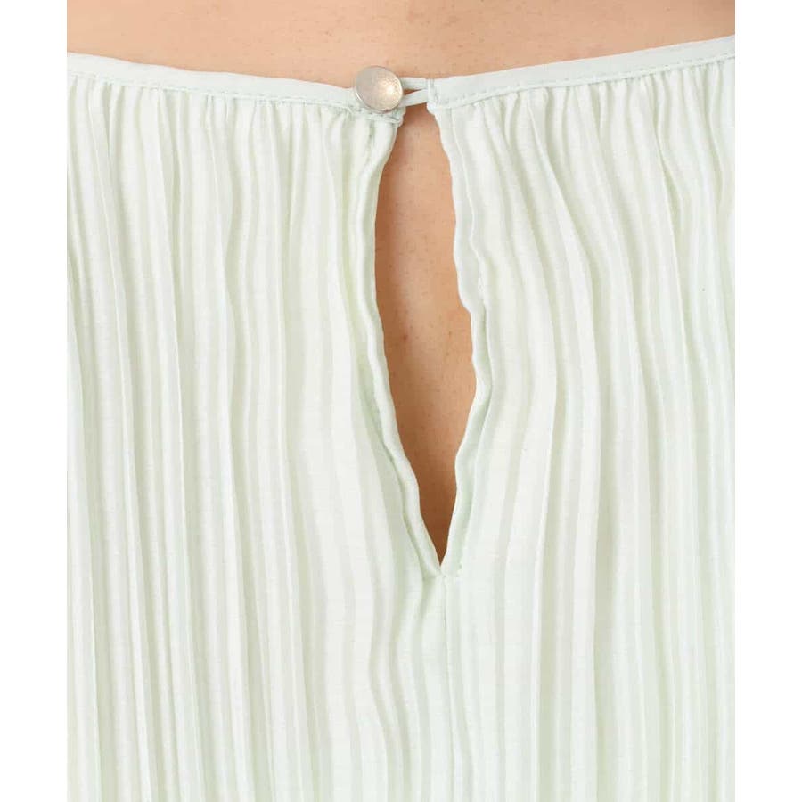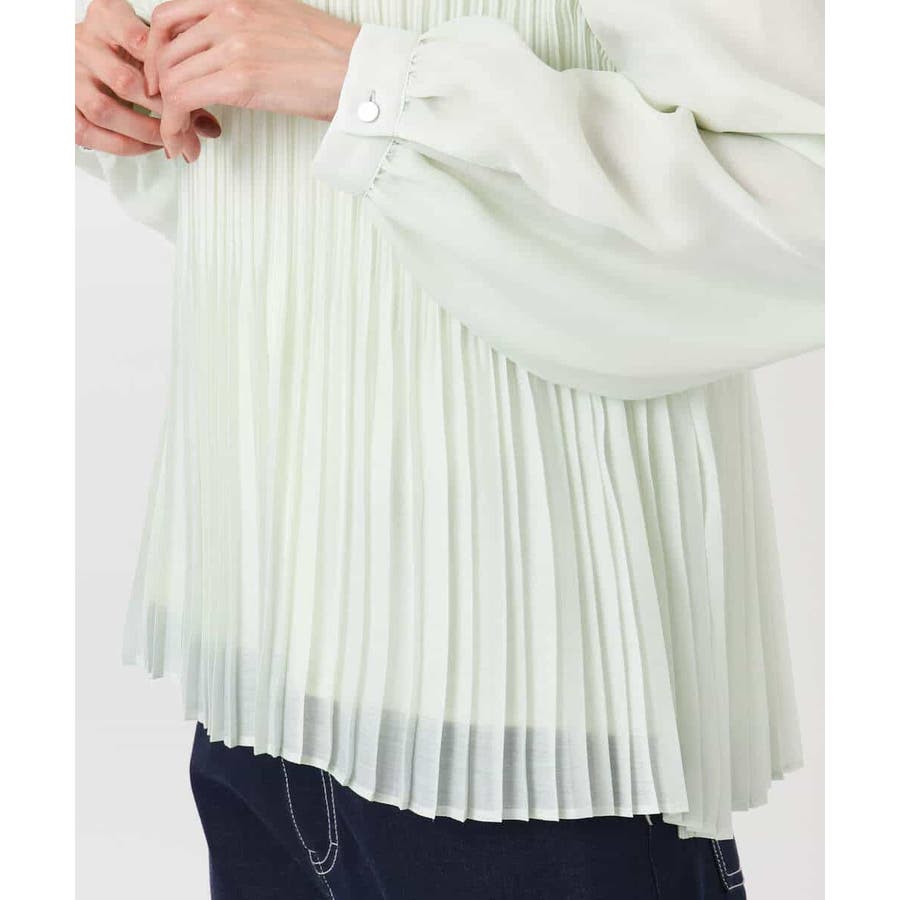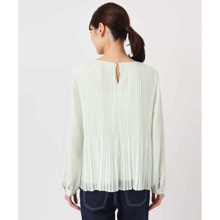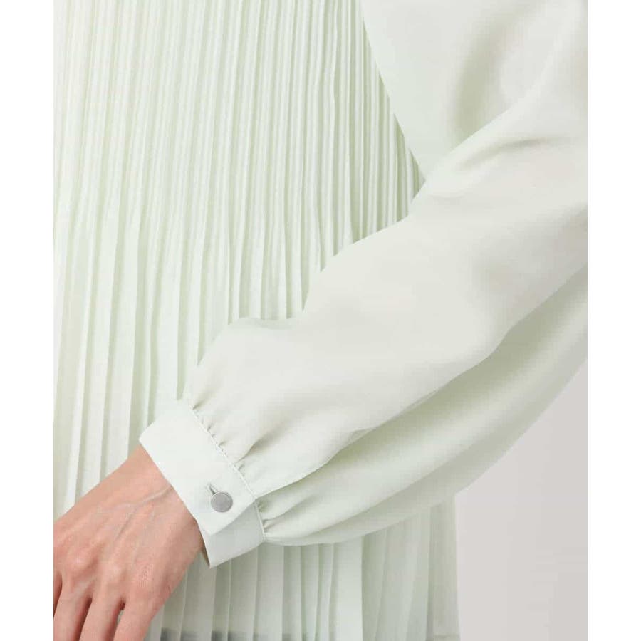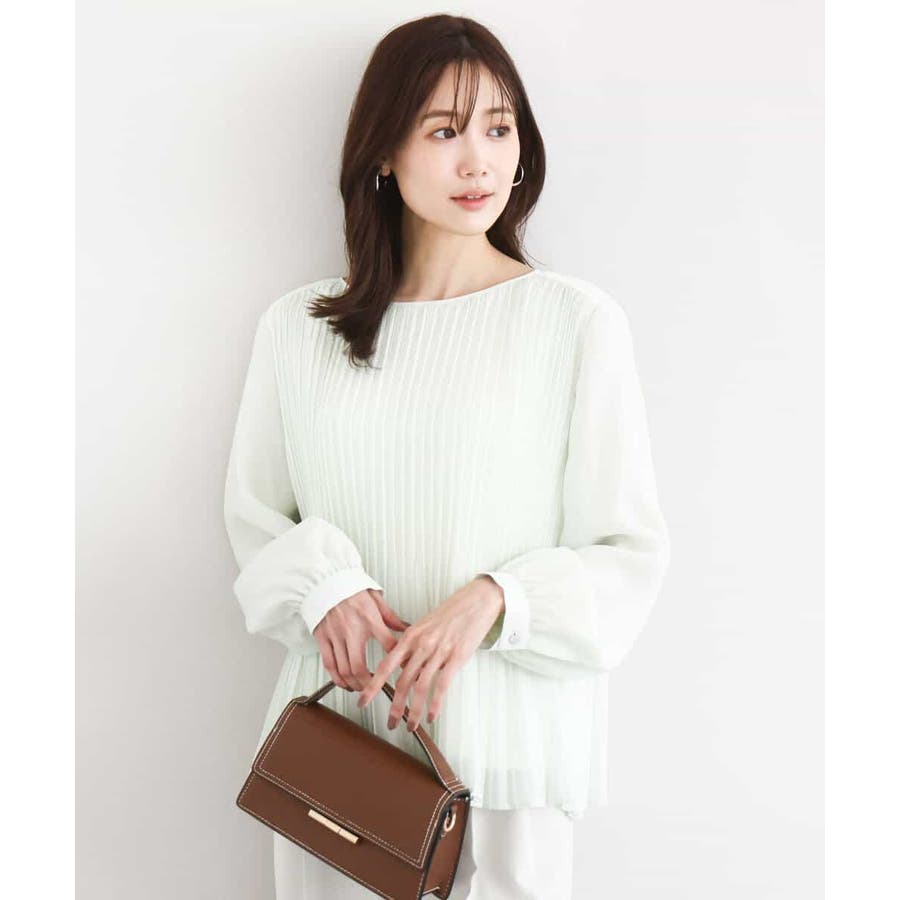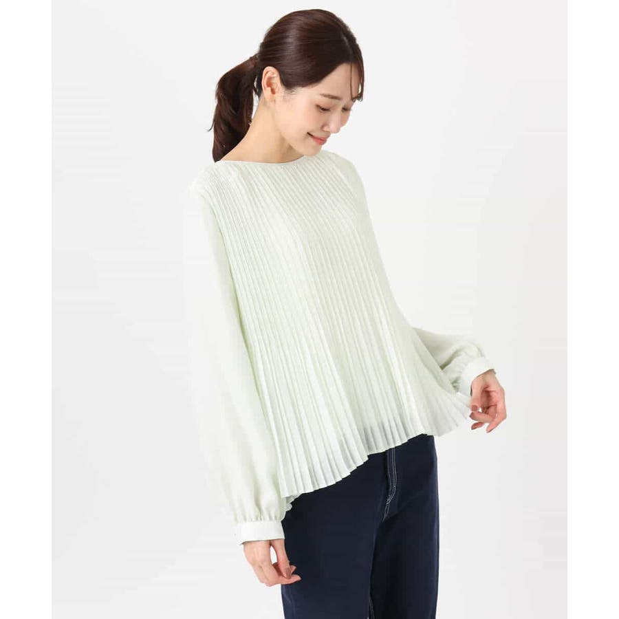 細かいプリーツデザインで、1枚でさっと着てもこなれた印象になるお仕事ブラウス。 裾にかけて少し広がるシルエットなので、お腹周りや腰周りを自然にカバーしてくれて、パンツ合わせもすっきり見えました。 さりげなく入ったシルバーラメが上品で、ほどよい光沢感が大人っぽい雰囲気にしてくれます。腕周りの透け感も強くないので、ビジネスシーンでも安心して着られそうです◎ 今回はライトグリーン(30)を着用しましたが、写真よりややグリーン感がしっかりある印象。パステル調の明るいグリーンで、顔周りがぱっと華やかになりました。春にぴったりで、ぜひおすすめしたい一枚です。