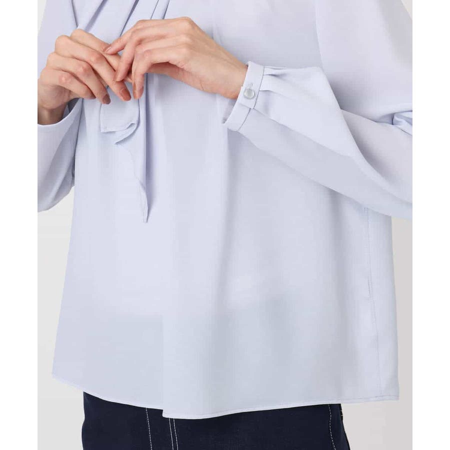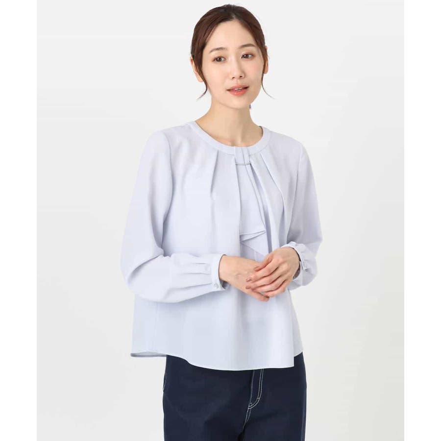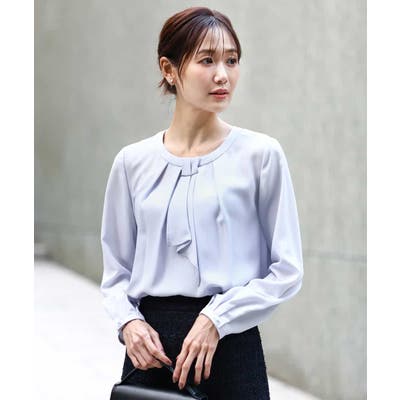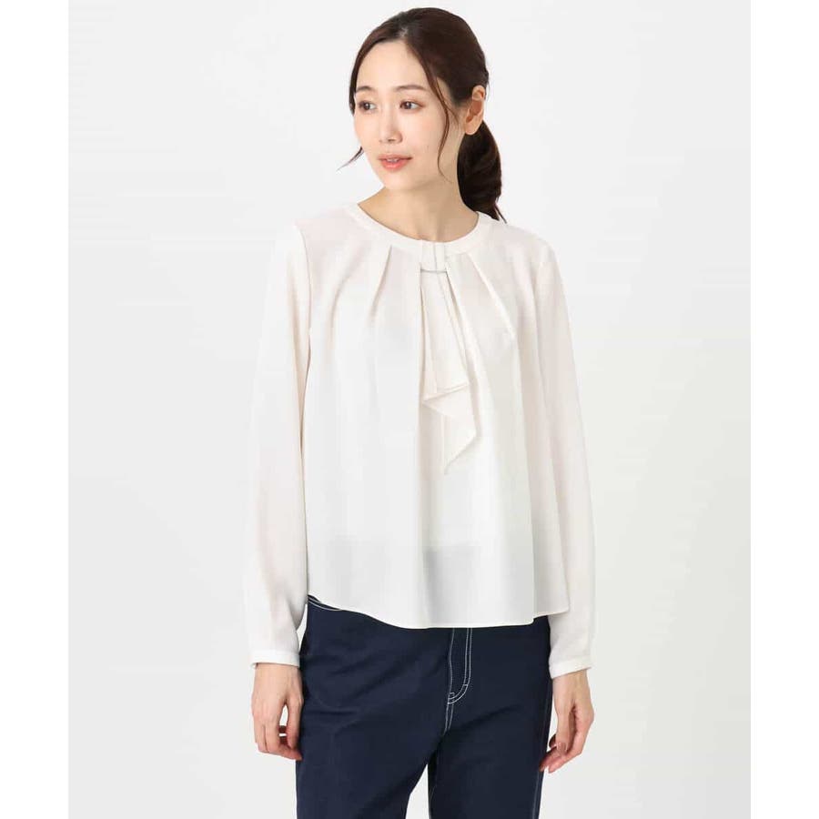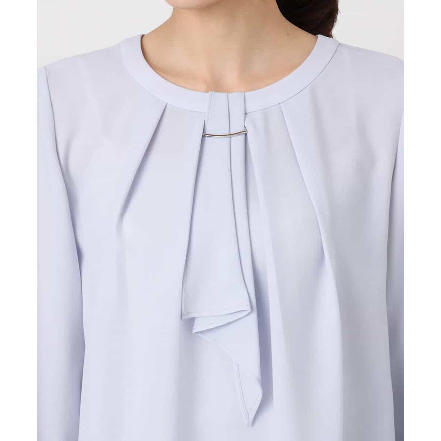 毎年人気のマルチwayブラウスが今年も登場。 一枚でボウタイデザインにしたり、シンプルなクルーネックとして着たりと、いろんな着こなしを楽しめるのが魅力です。クルーネックデザインなので、どんなタイプのジャケットとも合わせやすいのがポイントです。さらっとなめらかな素材感で、着心地も快適です。 季節を選ばず着られる素材なので、一枚持っていると重宝すること間違いなしです。