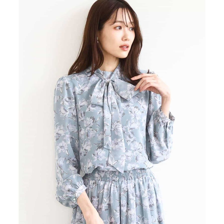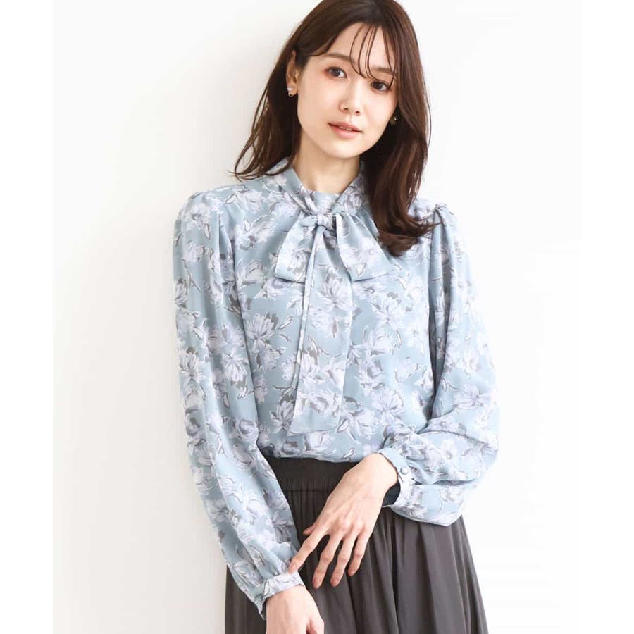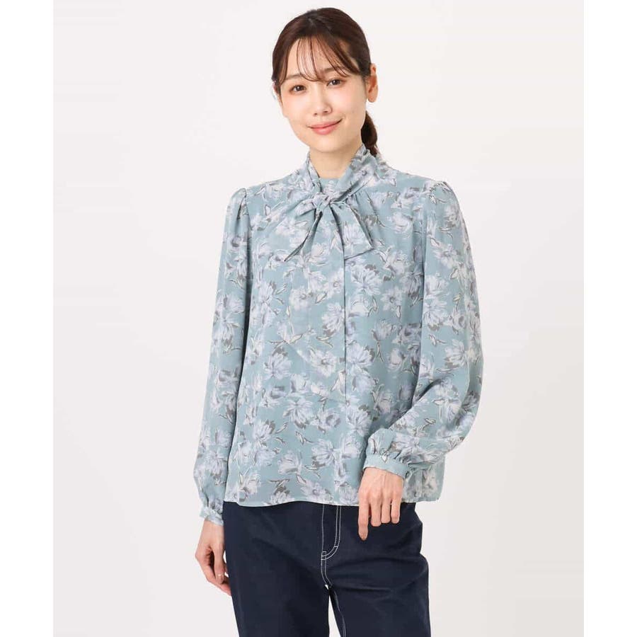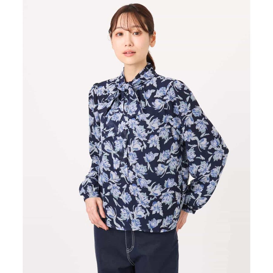 繊細なタッチで表現された花柄のシフォンブラウス。程よいスタンドネックに取り外し可能なボウタイ付き。