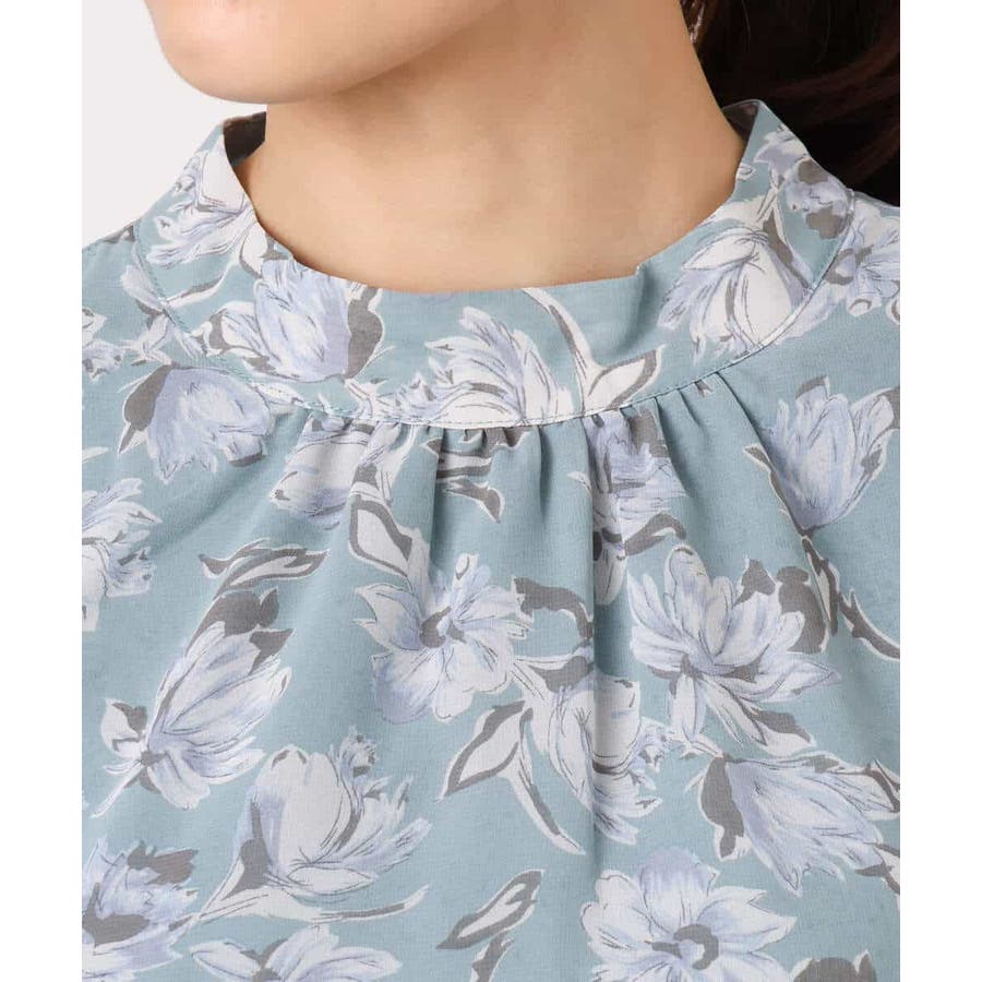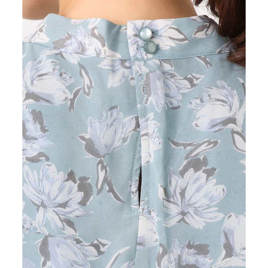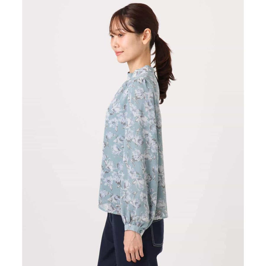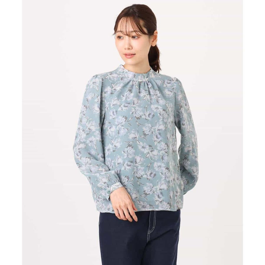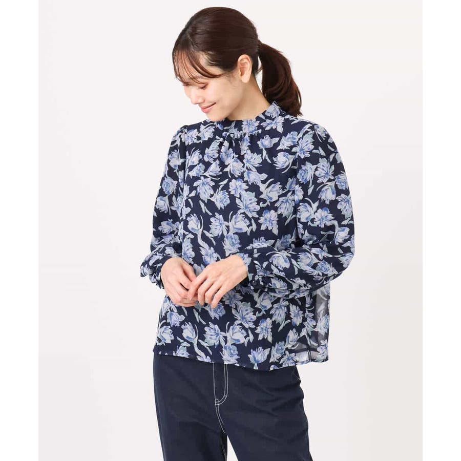 繊細なタッチで表現された花柄のシフォンブラウス。程よいスタンドネックに取り外し可能なボウタイ付き。