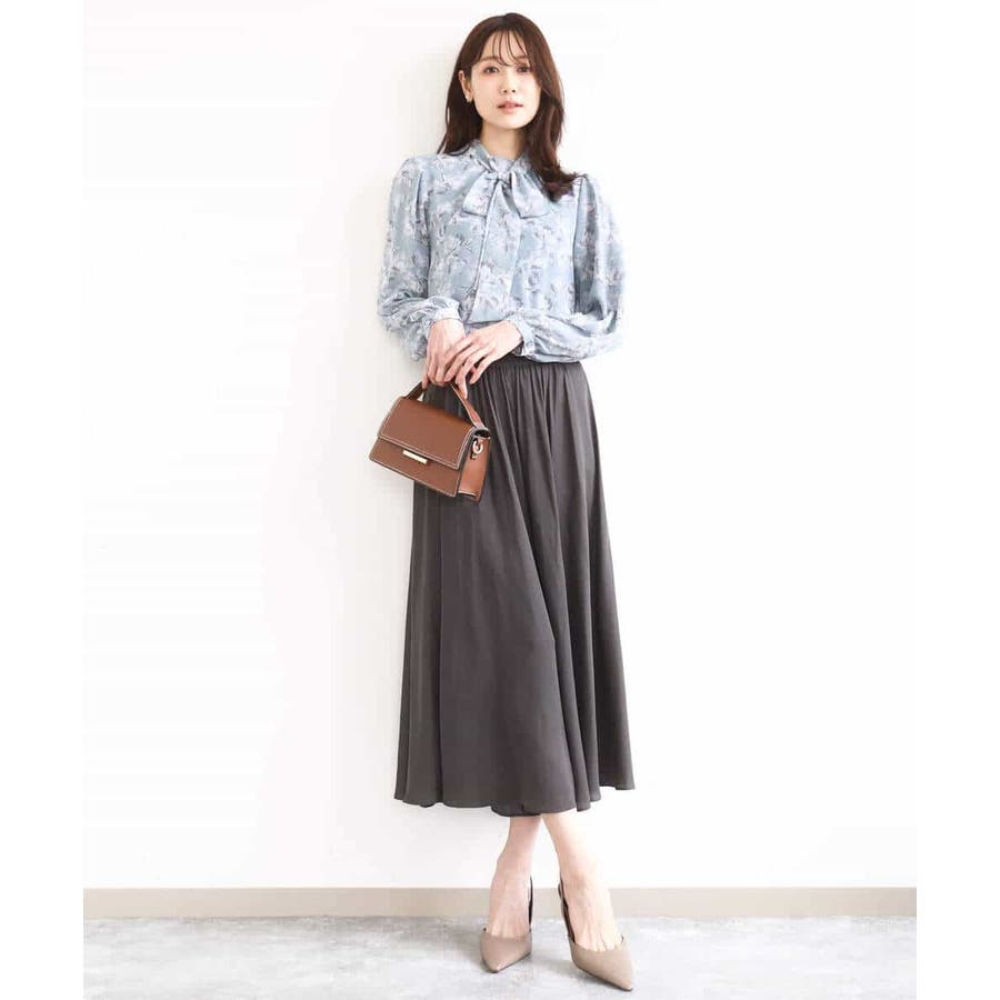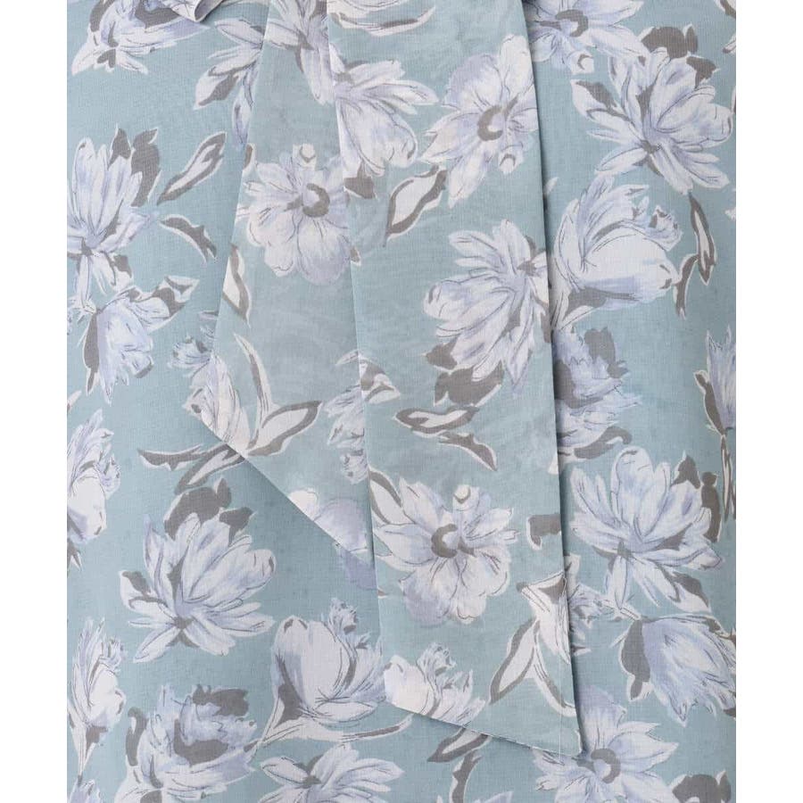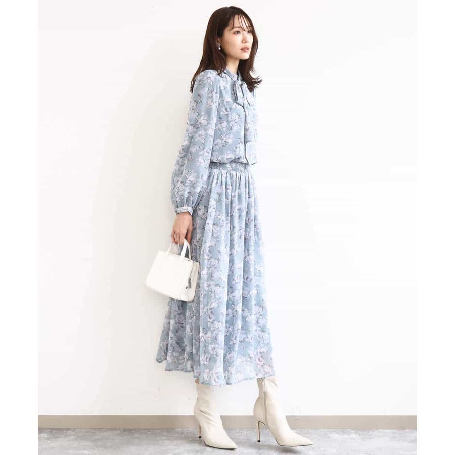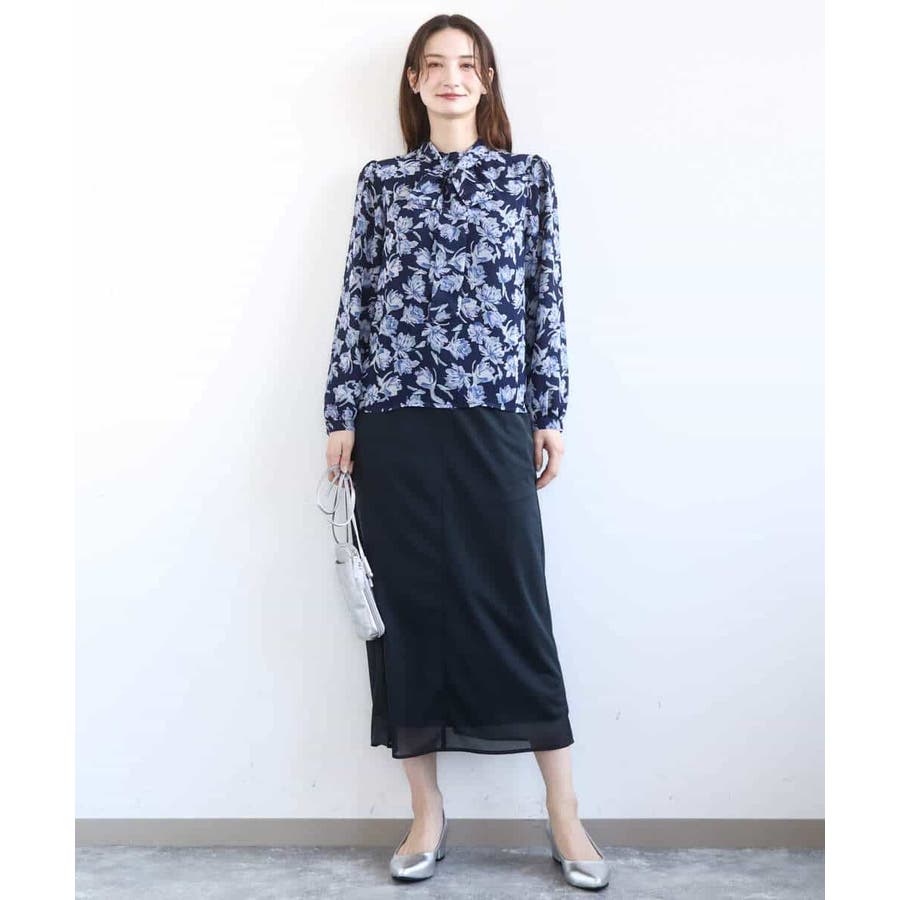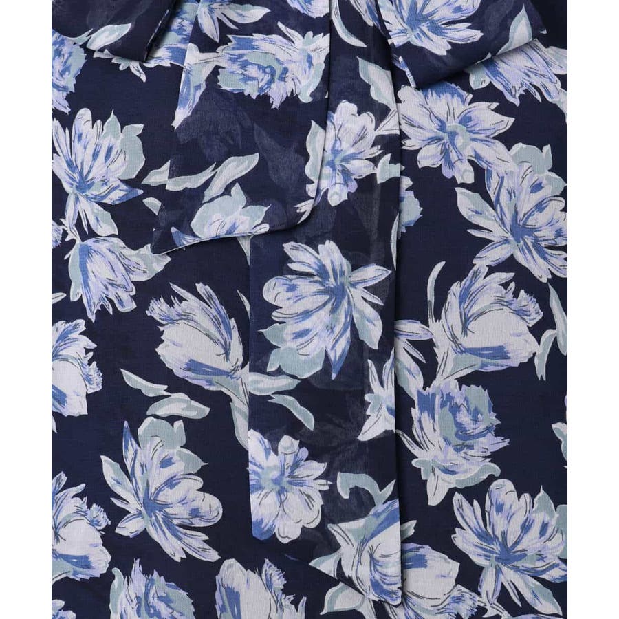大胆な花柄プリントが目を引く、シフォンブラウス。繊細なタッチの花柄で、一枚でも大人っぽく上品な印象に仕上がります。ブルーベースのカラーが春らしく、シフォン素材ならではの透け感が軽やか。これからの季節にぴったりな一枚です。リボンは取り外し可能なので、あり・なしで雰囲気を変えて楽しめるのもポイント。着丈は152cmの私で、ヒップにかかるくらいの長さでした。 同素材のスカートとあわせてワンピースのように着こなすスタイルもおすすめです。