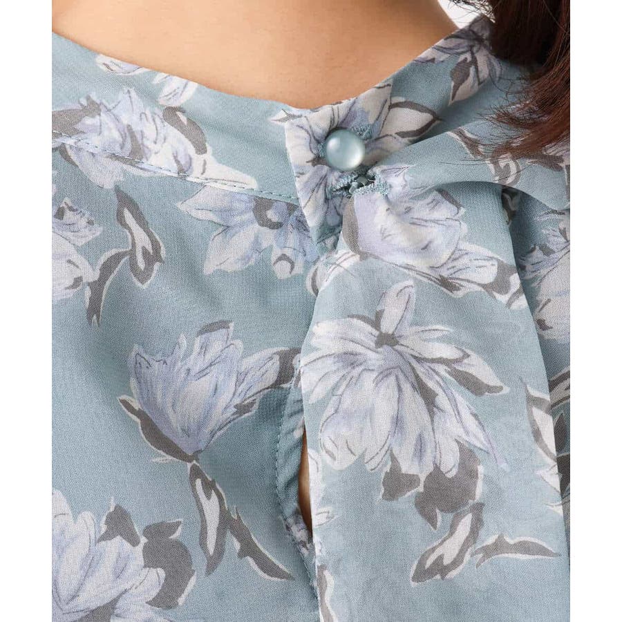 ボウタイ付き花柄シフォンブラウス/洗える