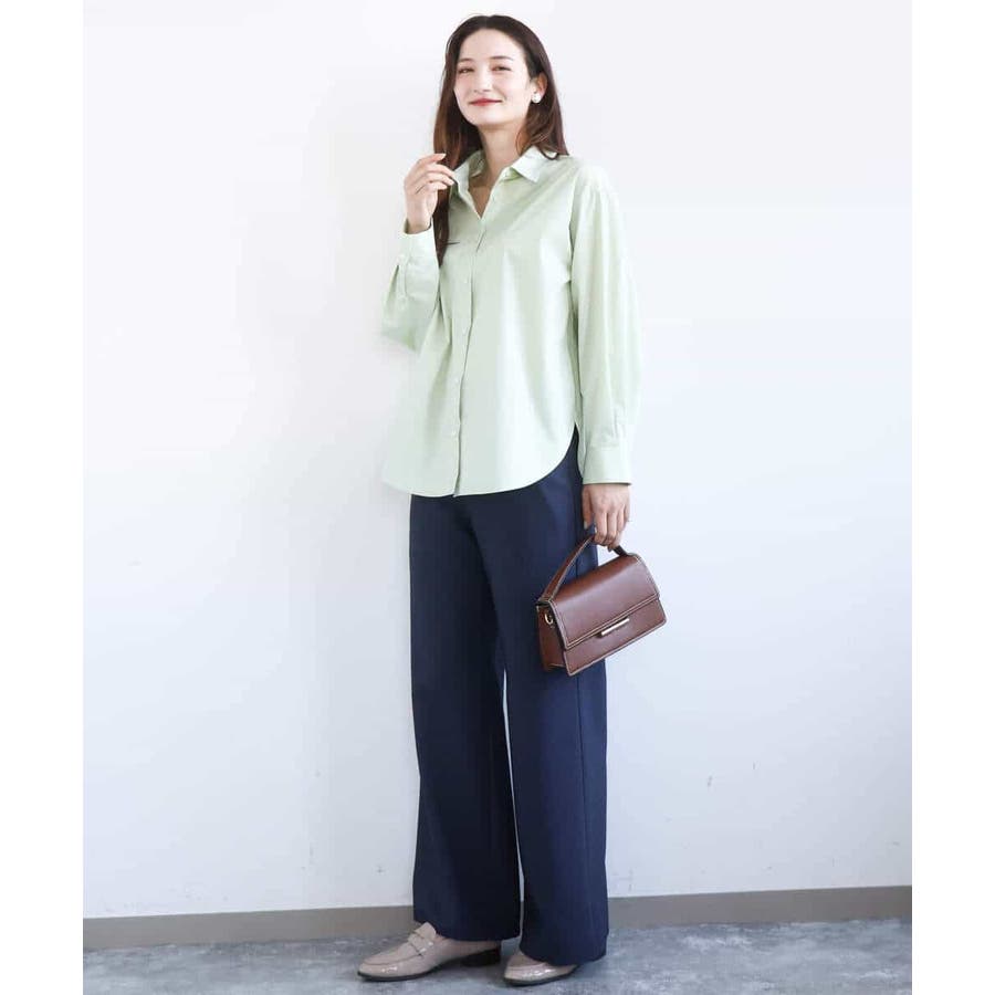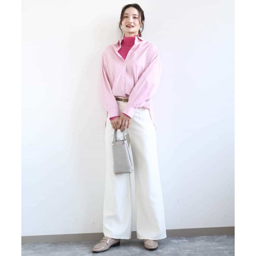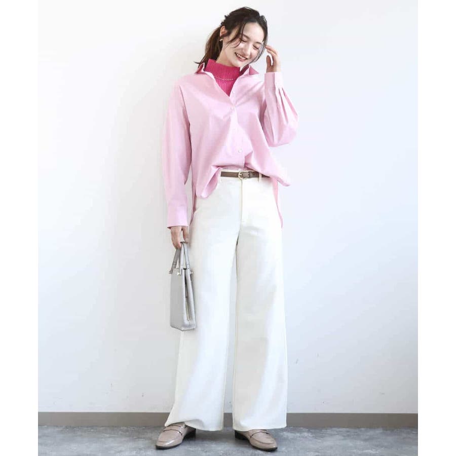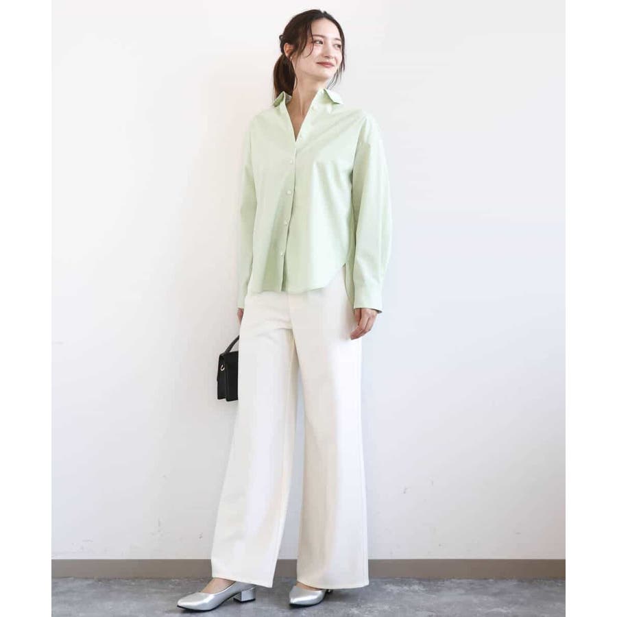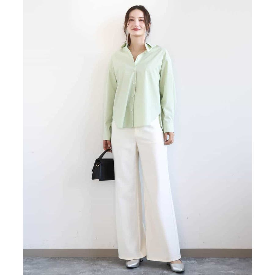 前身頃と後見頃の長さの違いがあまり気にならなかったのが良かったです。前身頃は股下、後ろ見頃はお尻がすっぽり隠れる長さでお腹とお尻をカバーできたのがうれしいポイント。素材はコットンが半分ほど入っていますが、着用感はハリ感があり、コットンの柔らかさ故のカジュアル感はあまり感じず、オフィスでも使えそうです。色ものはすべてパステルカラーなので着用に抵抗感なく、春カラーとして取り入れやすいアイテムです。