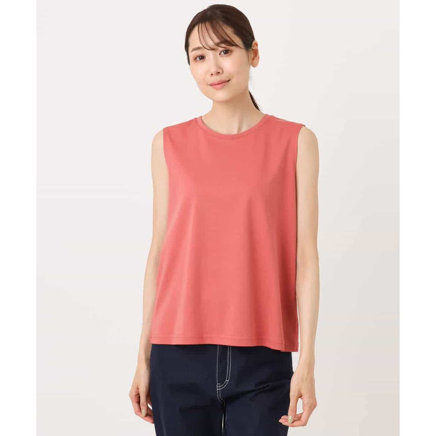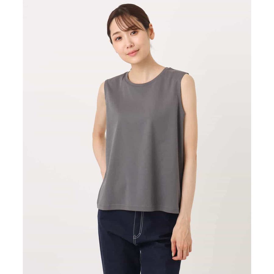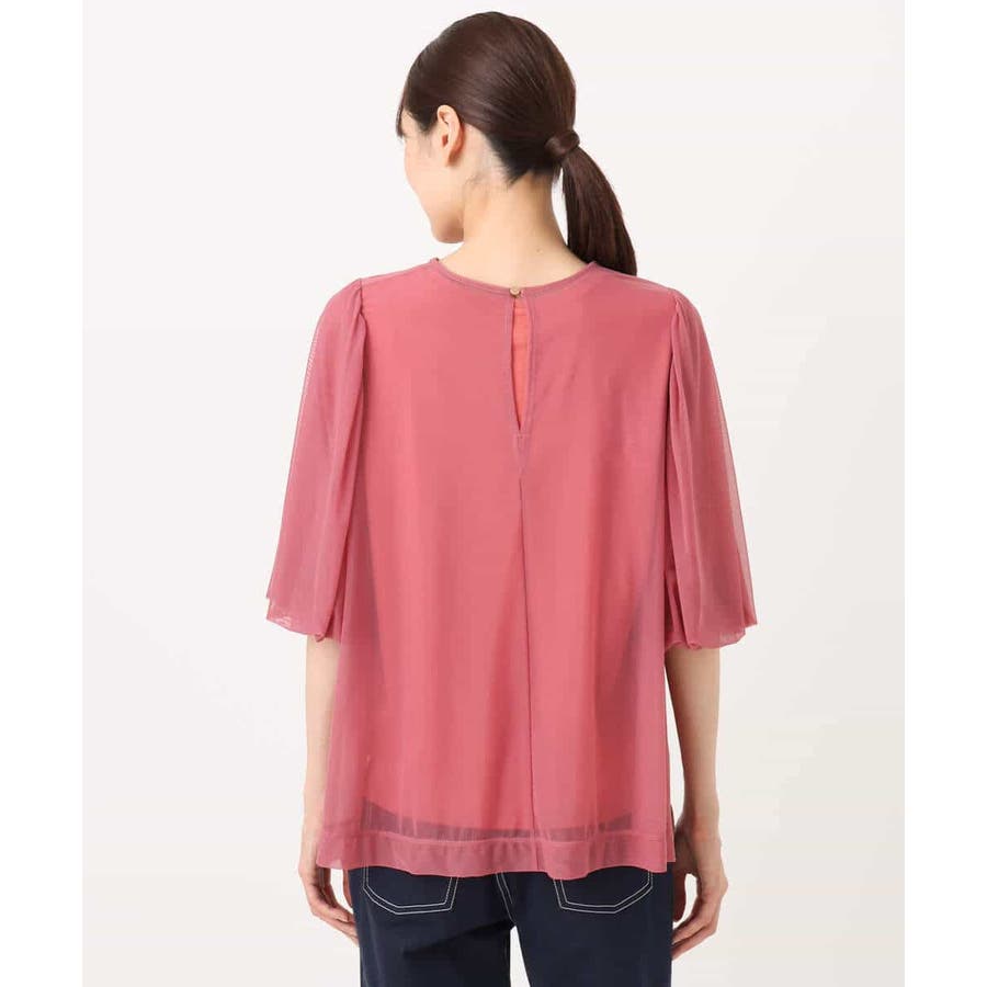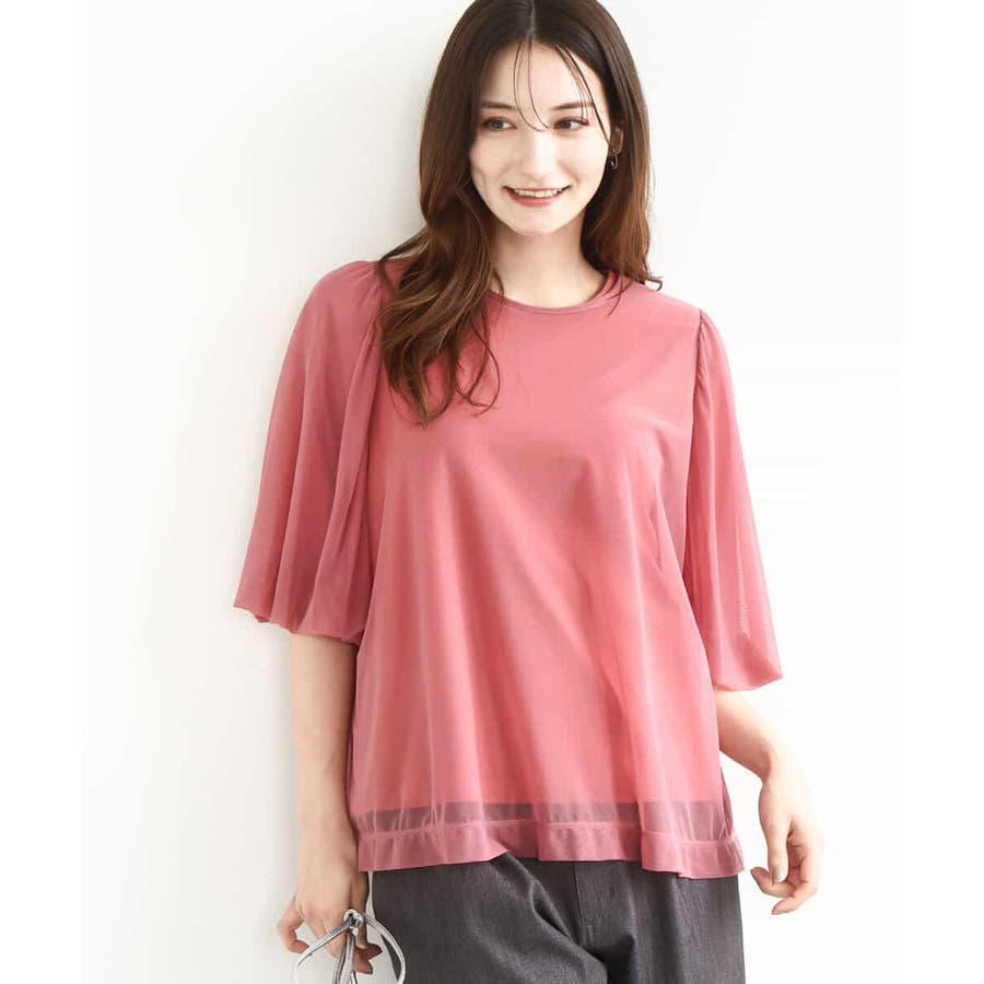 ブラウスは透け感のあるやわらかなチュール素材。タンクトップは扱いやすいコットン100の接触冷感機能付き素材を使用。