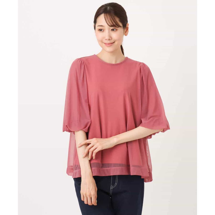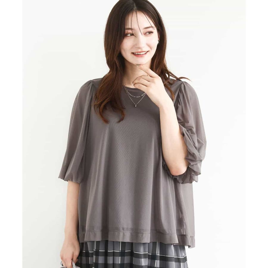 ボリューム感のあるバルーンスリーブのチュールブラウスは、柔らかな素材感で軽やかに。シンプルなタンクトップもセットなのでインナーに悩まず安心◎肘まで隠れる袖丈が嬉しいポイント!