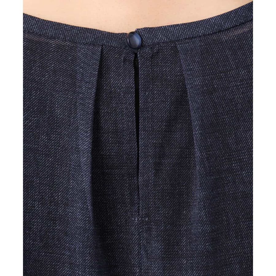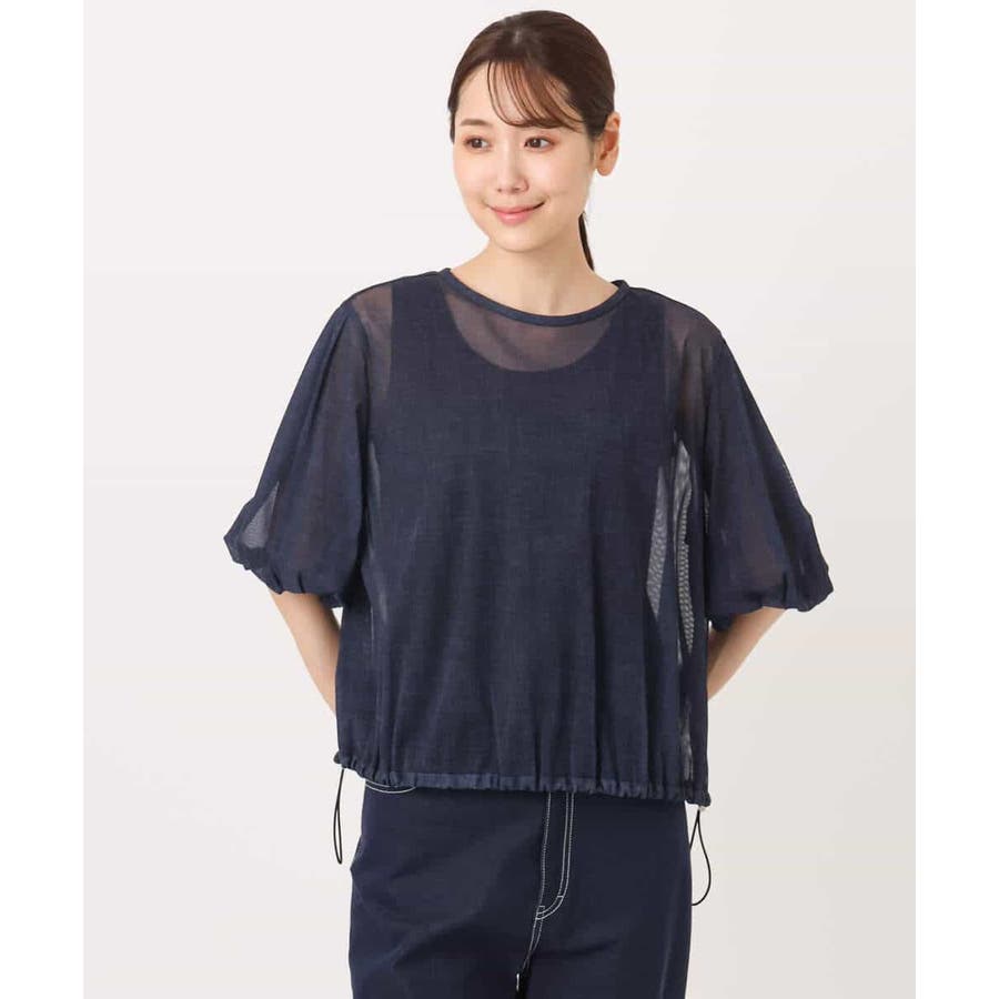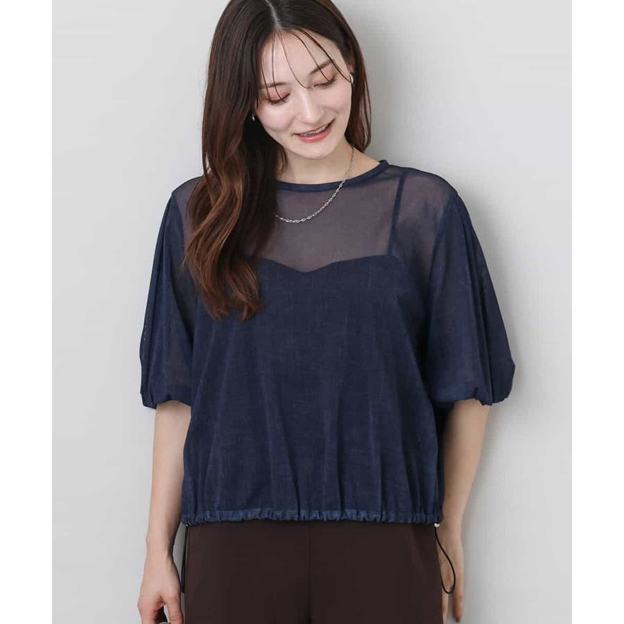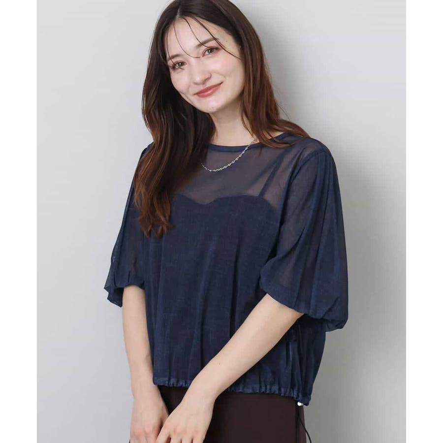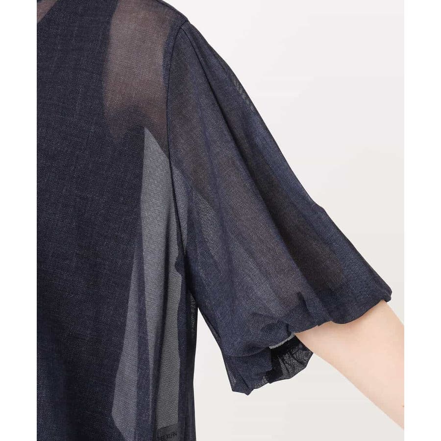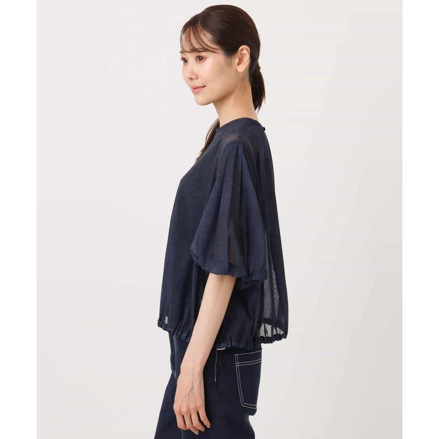 ハリのあるシアー素材がトレンド感あるブラウスです。デニムの様に見える生地でおしゃれ度が高い一枚です。ボトムのシルエットやデザインによって裾のドロスト紐で調整が可能です。ボリュームがある袖は腕が細見えしますよ。ネイビーカラーなら甘くなり過ぎなく大人可愛い印象になります。インナーは必須です。合わせるインナーはダークカラーだと落ち着いた雰囲気に。ライトカラーだと透けが引き立ってカジュアルな印象になりますよ。着こなしやインナーで変化が楽しめます。