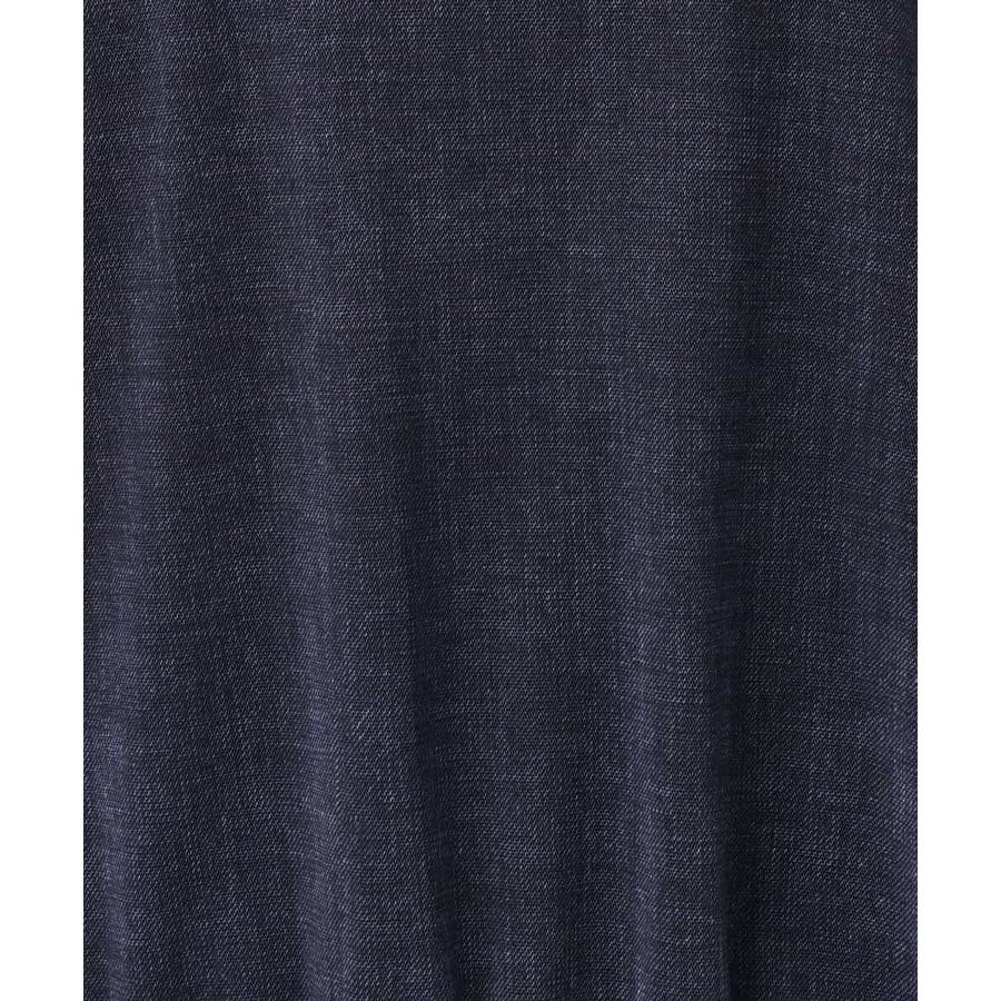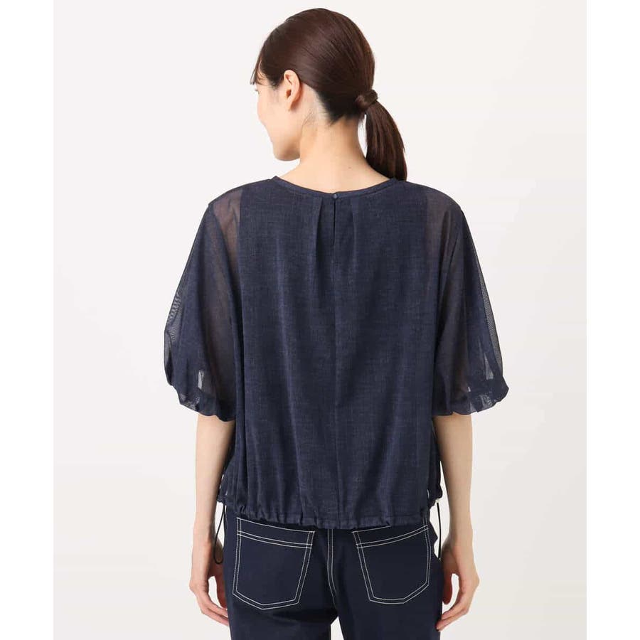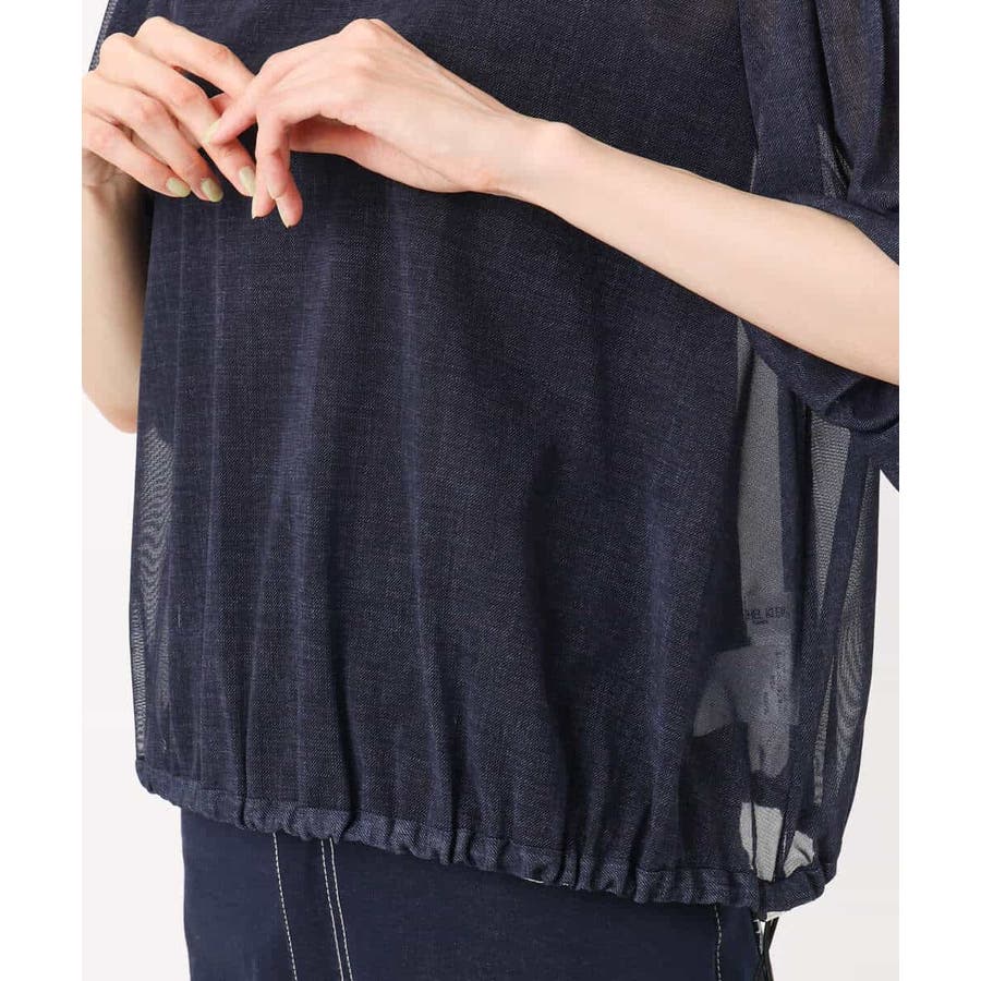 透け感のあるデニム調の素材がトレンドライクなブラウス。裾のドローコードを絞ることでシルエット変化が楽しめるマルチなアイテムです。デザイン自体はゆったりとしており、二の腕や身頃もふんわりとさりげないカバーしてくれます。
