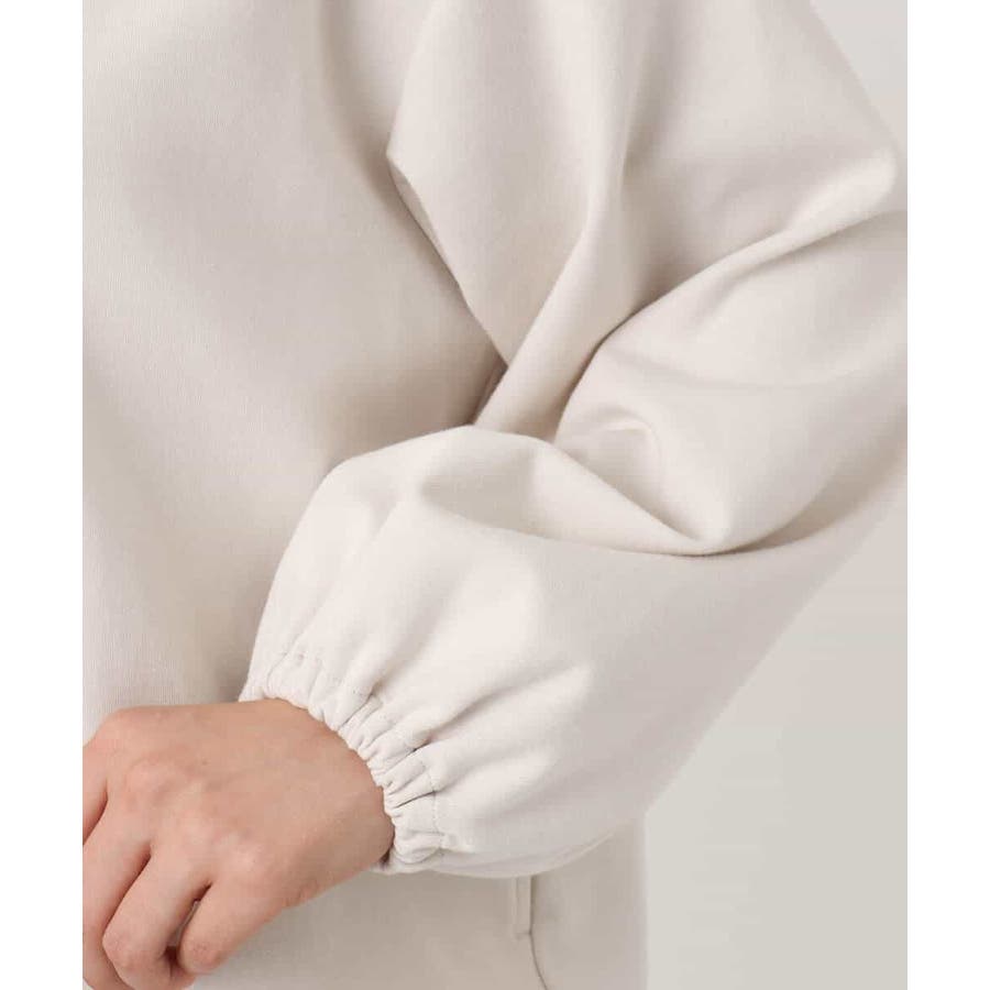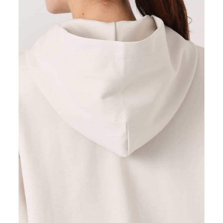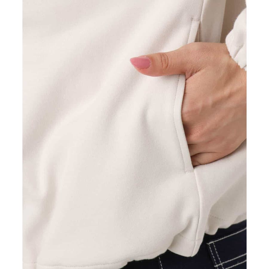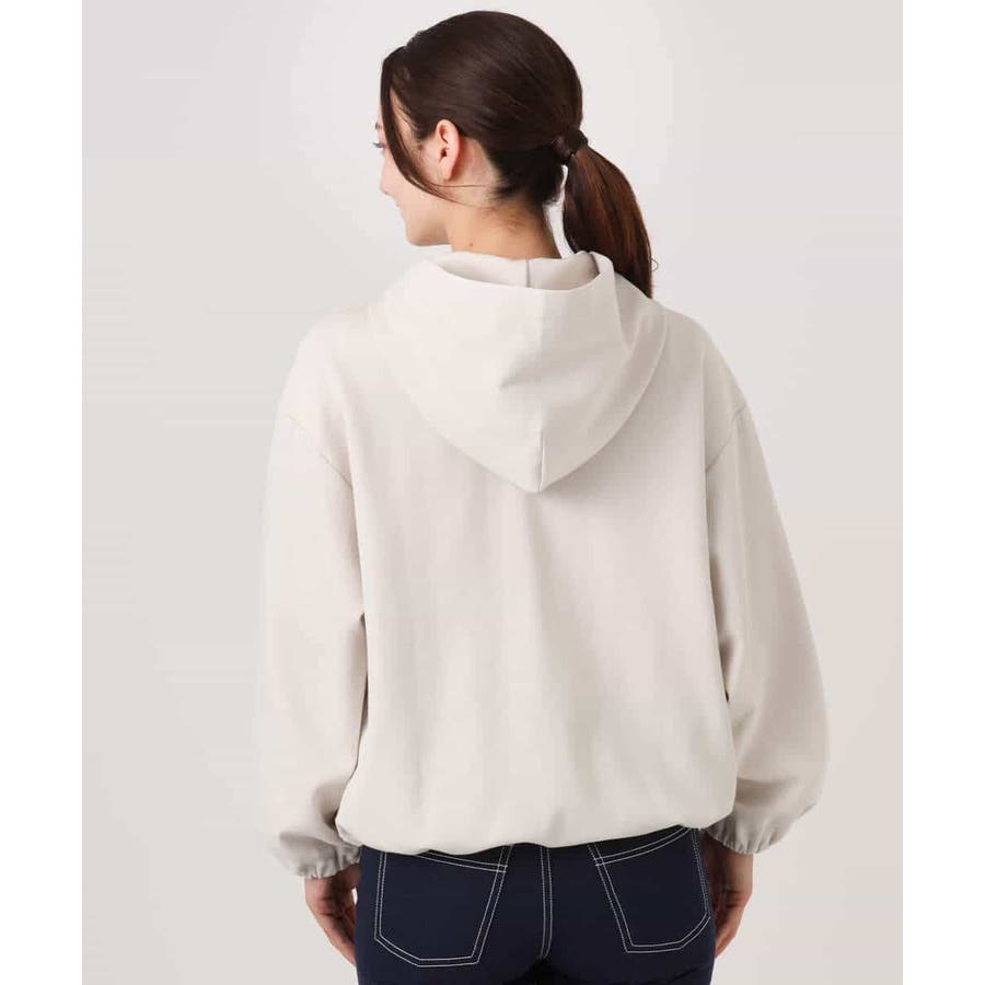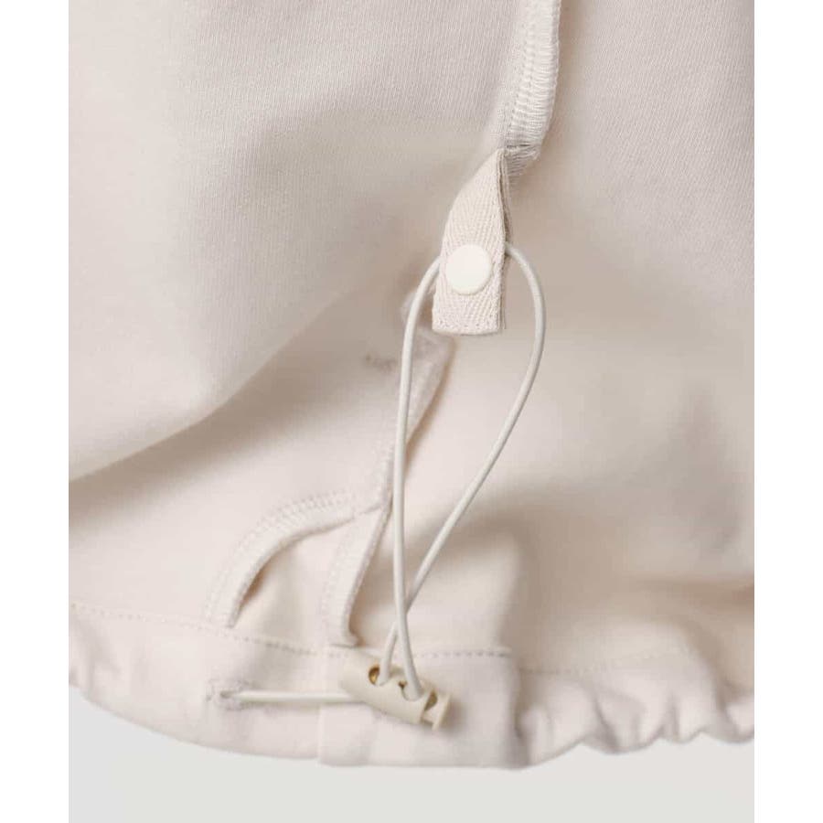 裾のドローコードを絞り、丈感を調整することで雰囲気を変えて着こなせるパーカー。丸みのあるシルエットが大人カジュアルな雰囲気に。