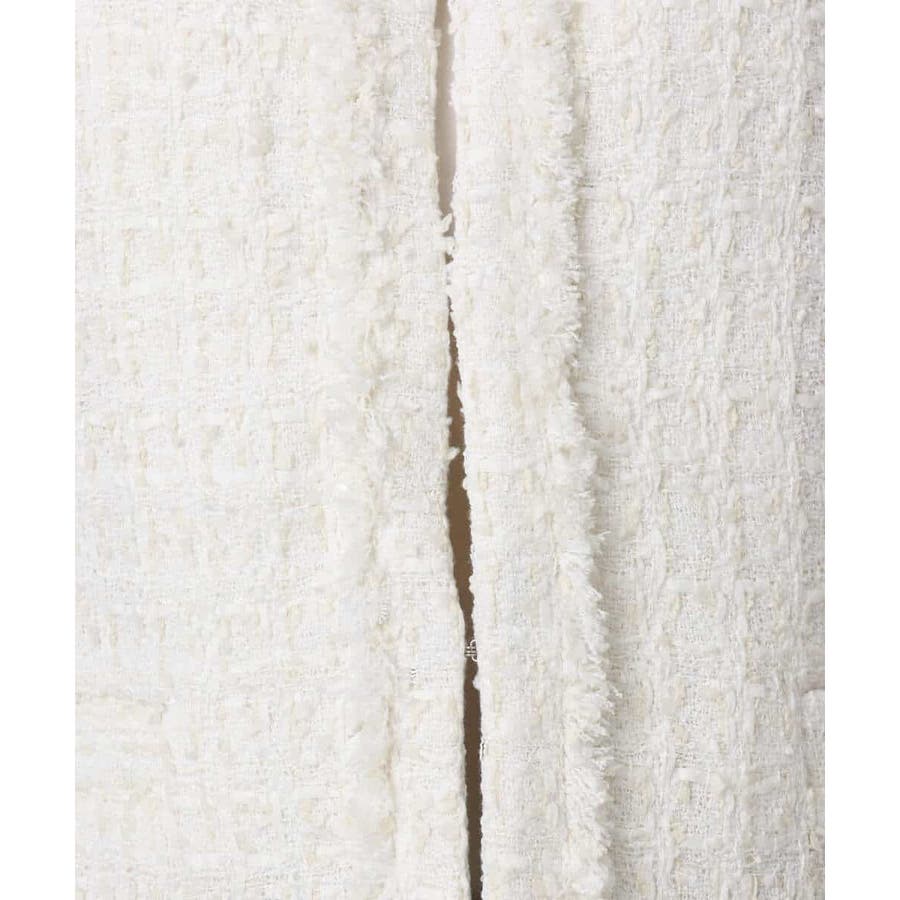 素材を活かしたシンプルなデザインのノーカラージャケット。衿ぐりから前端にフリンジを施して華やかな印象に。対のスカートとバランスを取りやすい着丈に仕上げました。