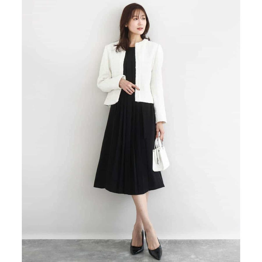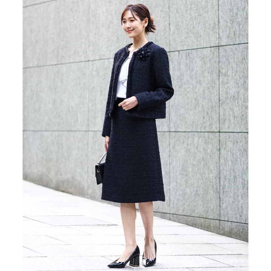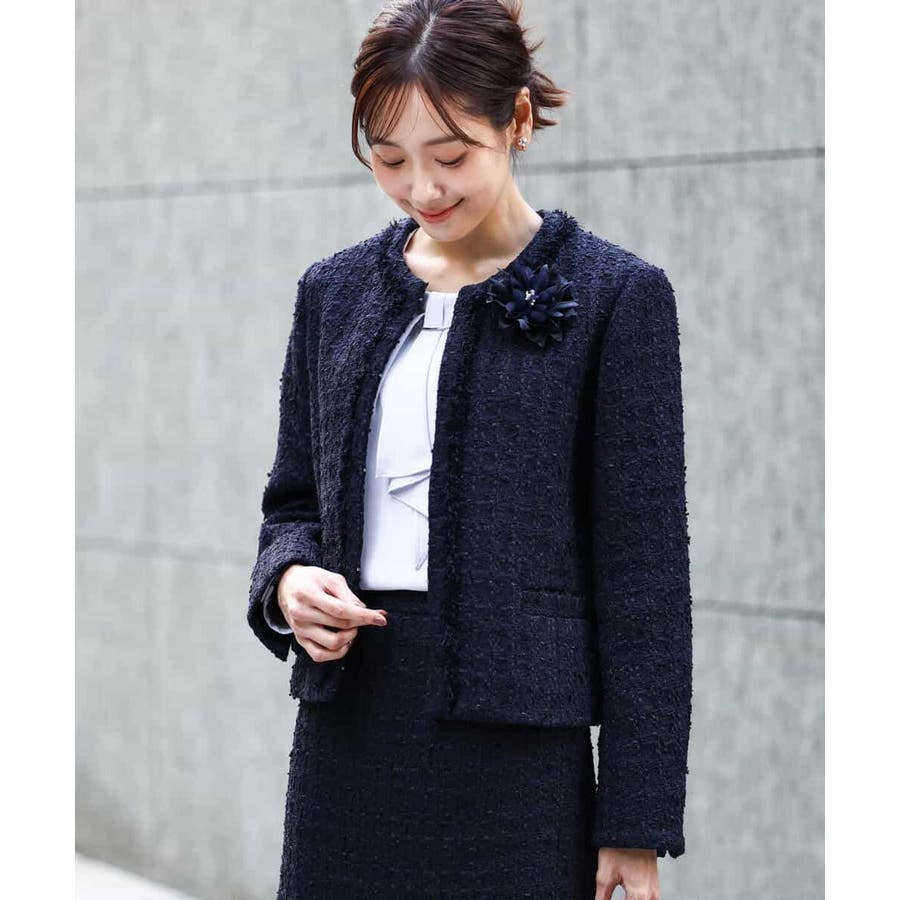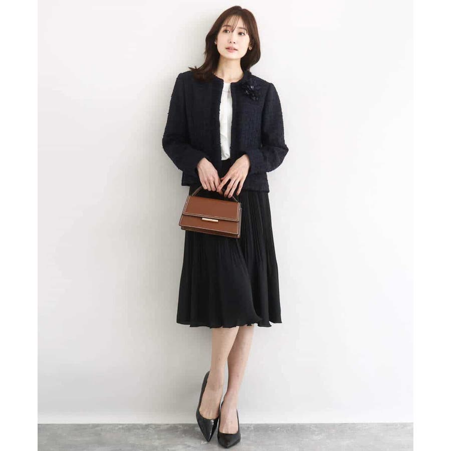 華やかなセレモニーシーンには同素材のスカートとセットアップとして。もちろん単品ジャケットとしても着こなしやすく、お手持ちのワンピースなどにもバランスよく着合わせられます。卒業式、入学式、食事会など特別な日を華やかに彩っていただけるセレモニーセットアップです。