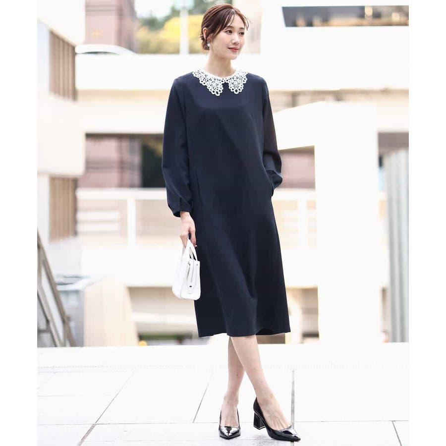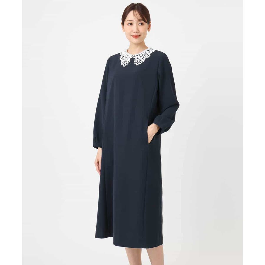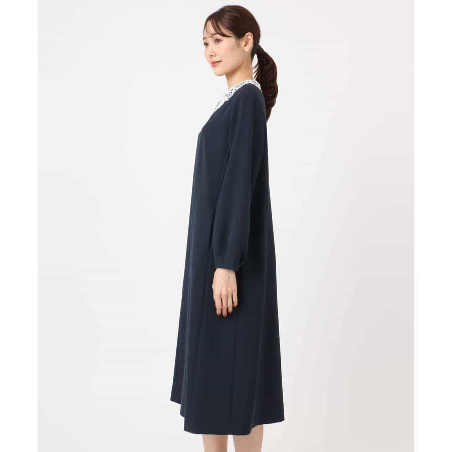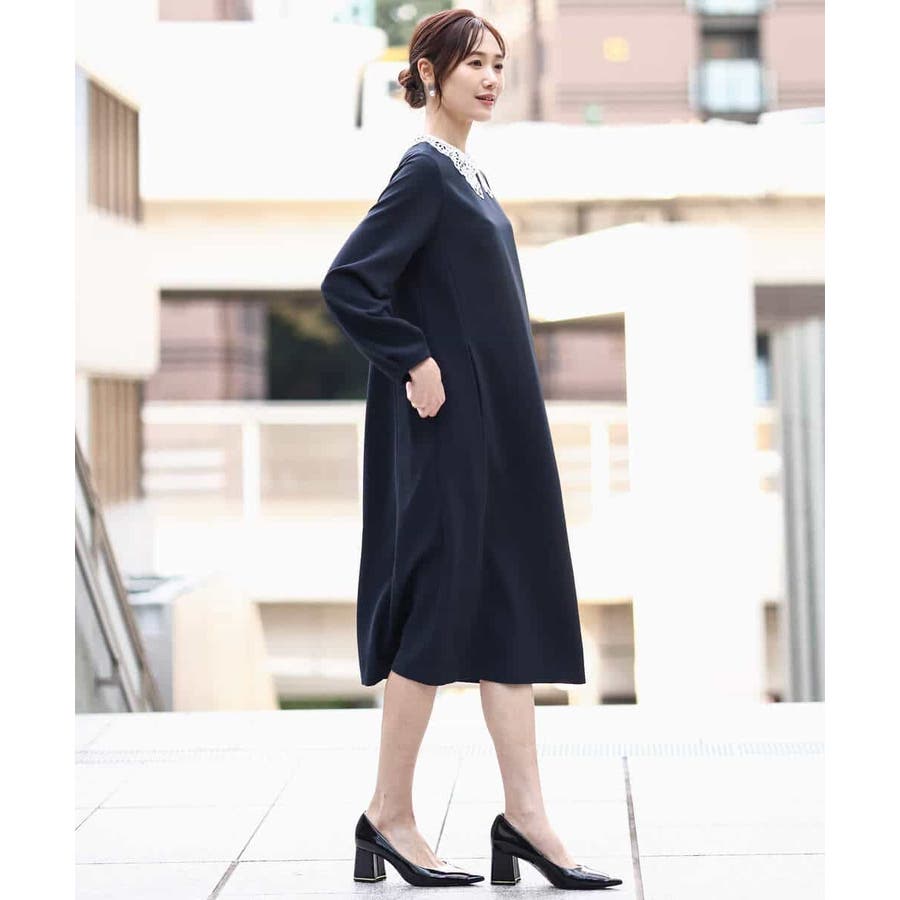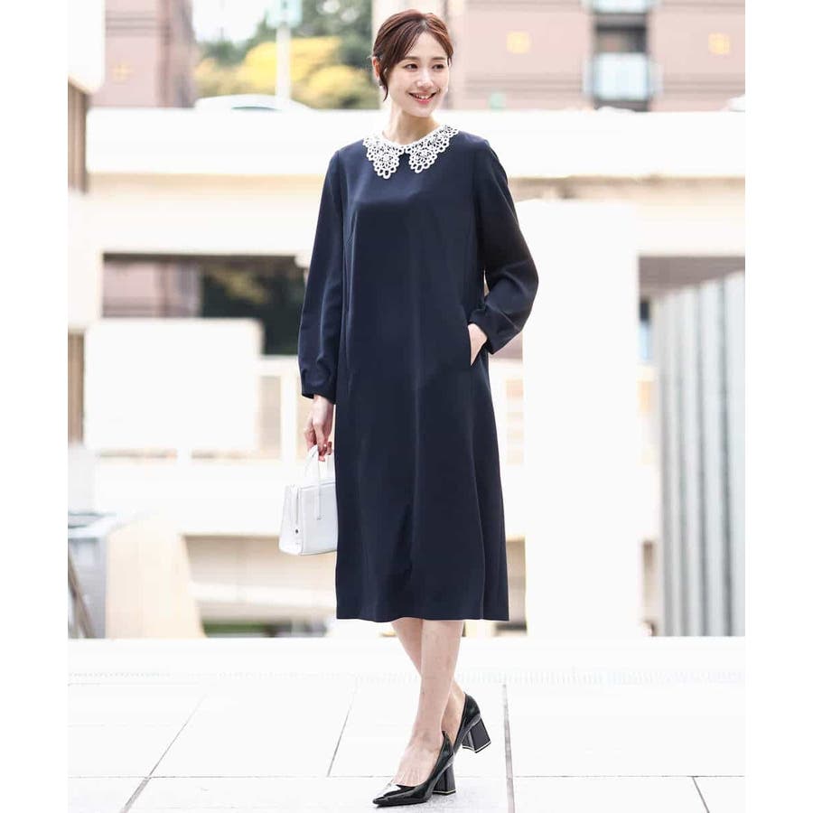 ホワイトのレース衿がアクセントのワンピース。レースは取り外し可能なデザインで、衿を外すとシンプルなサックワンピースとして着用できます。シルエットは程よくゆとりがあり、体のラインを拾いにくいサイズ感に仕上げています。