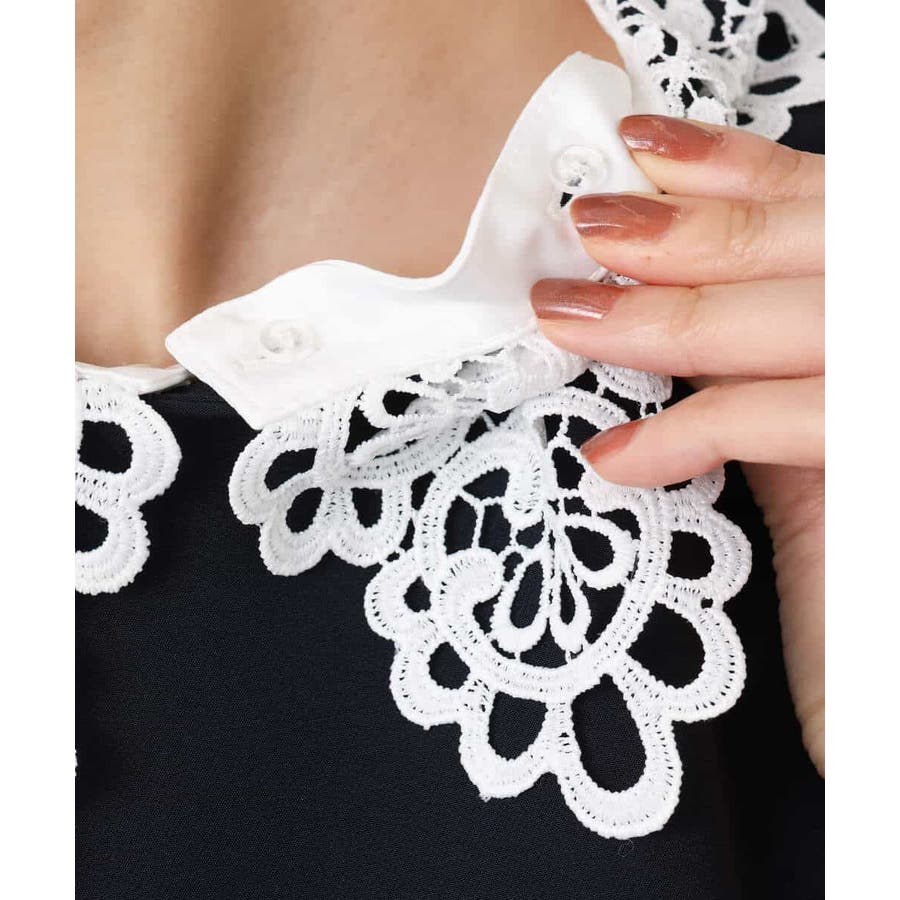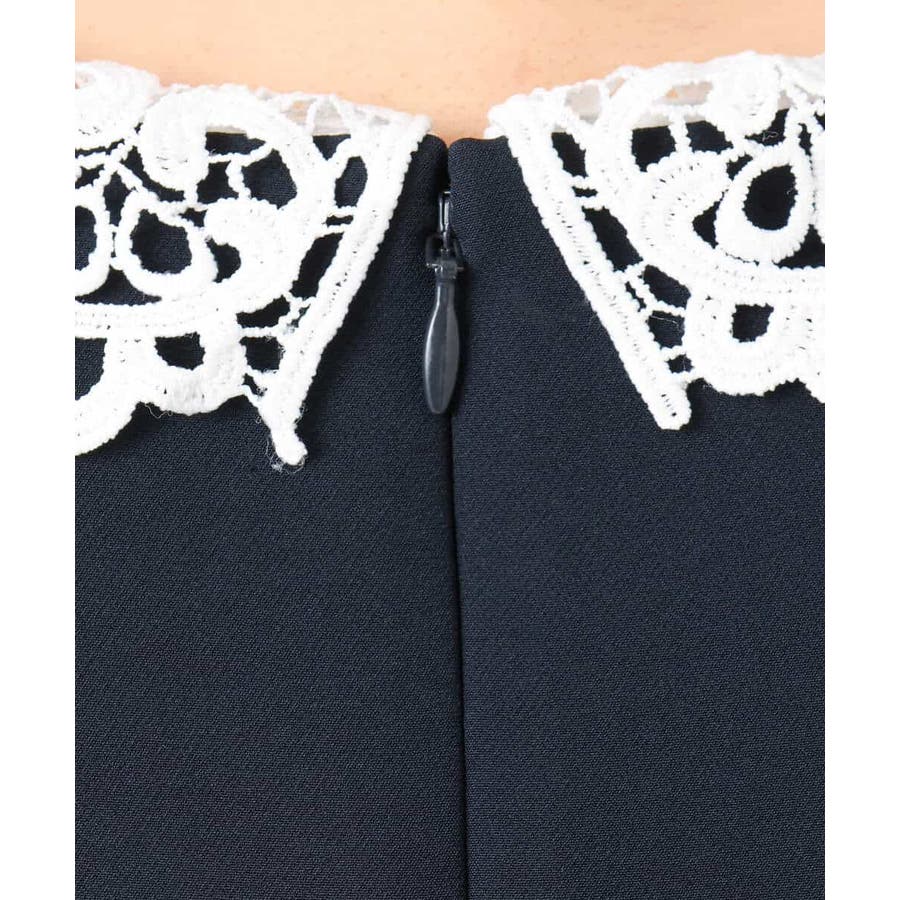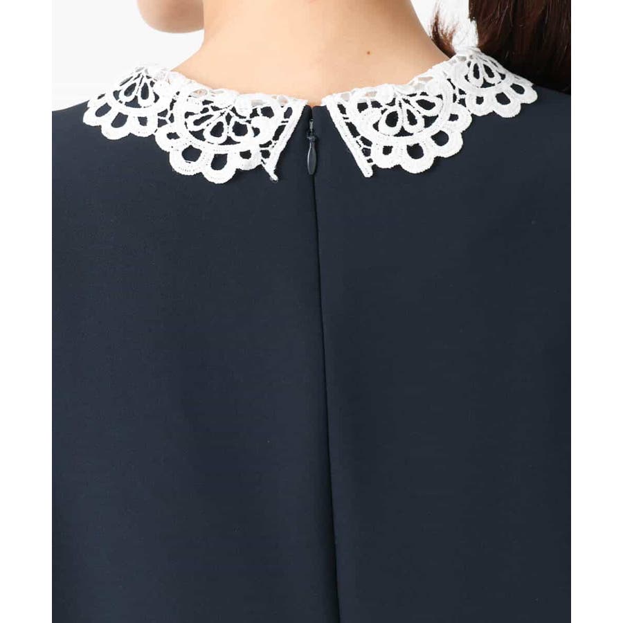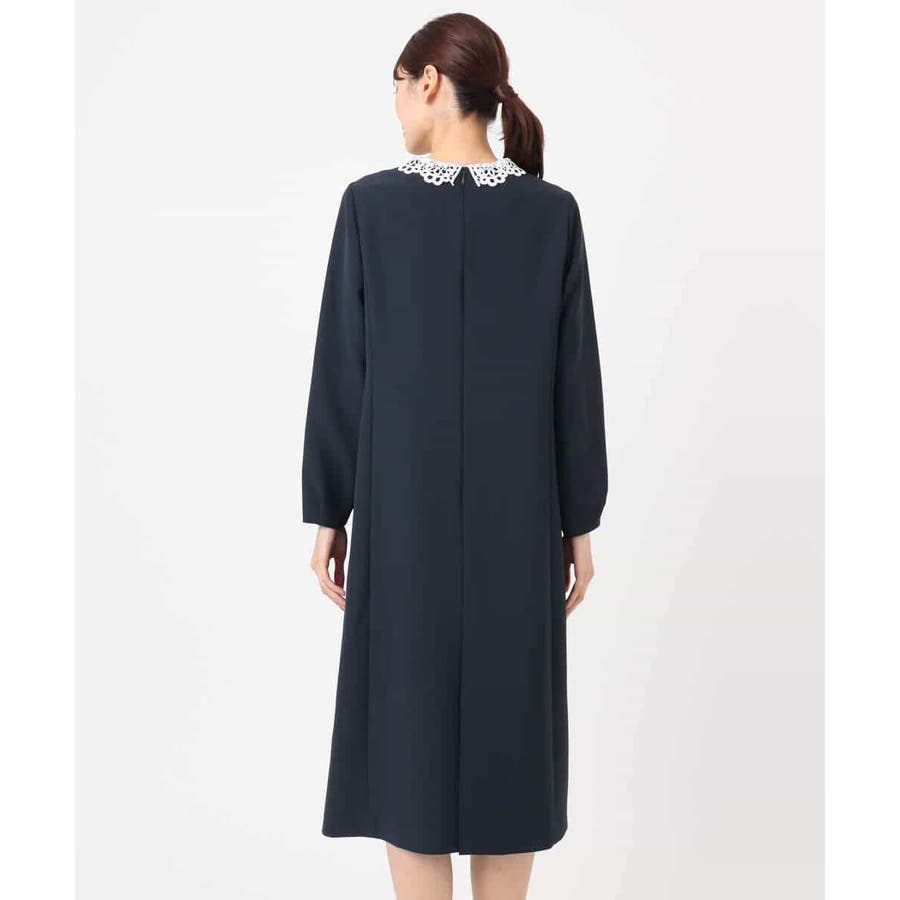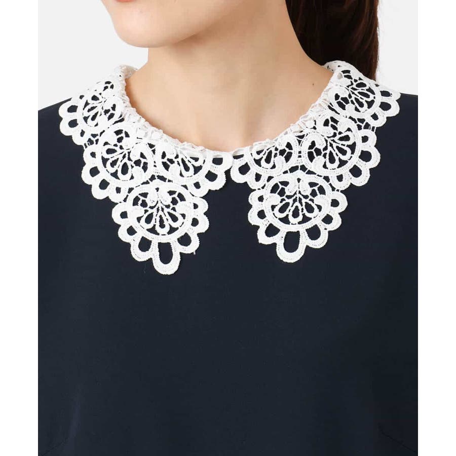 ホワイトのレース衿がアクセントのワンピース。レースは取り外し可能なデザインで、衿を外すとシンプルなサックワンピースとして着用できます。シルエットは程よくゆとりがあり、体のラインを拾いにくいサイズ感に仕上げています。