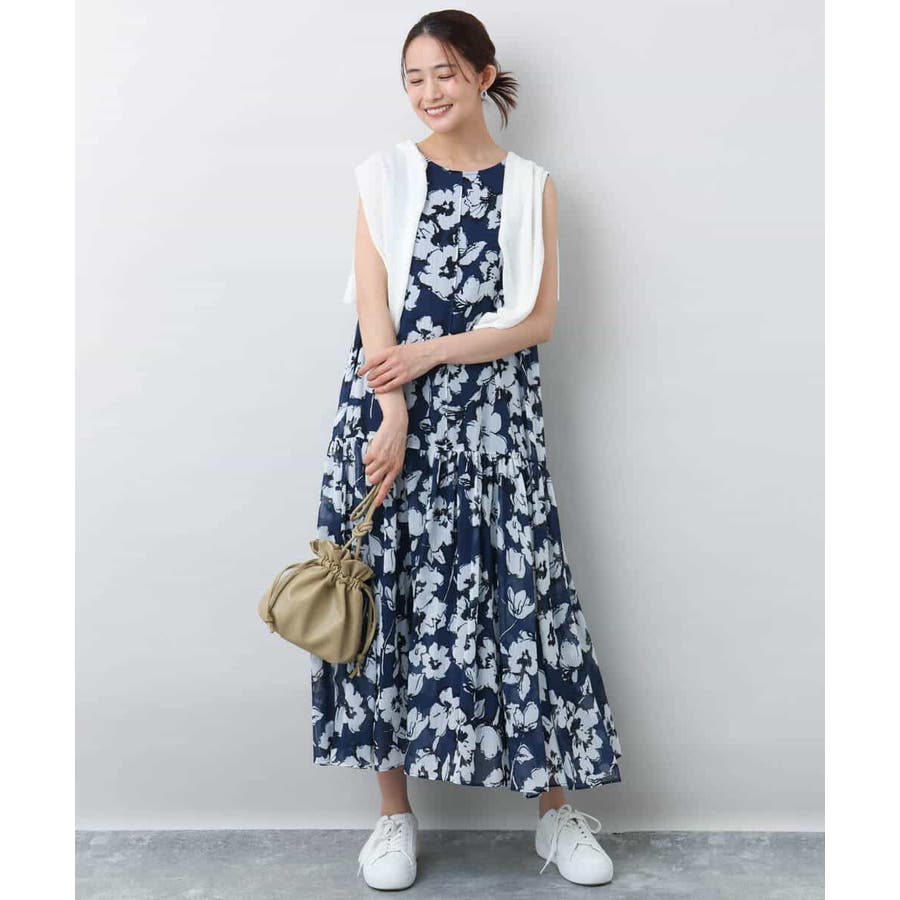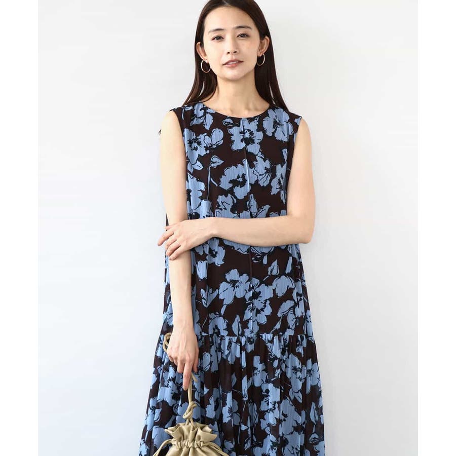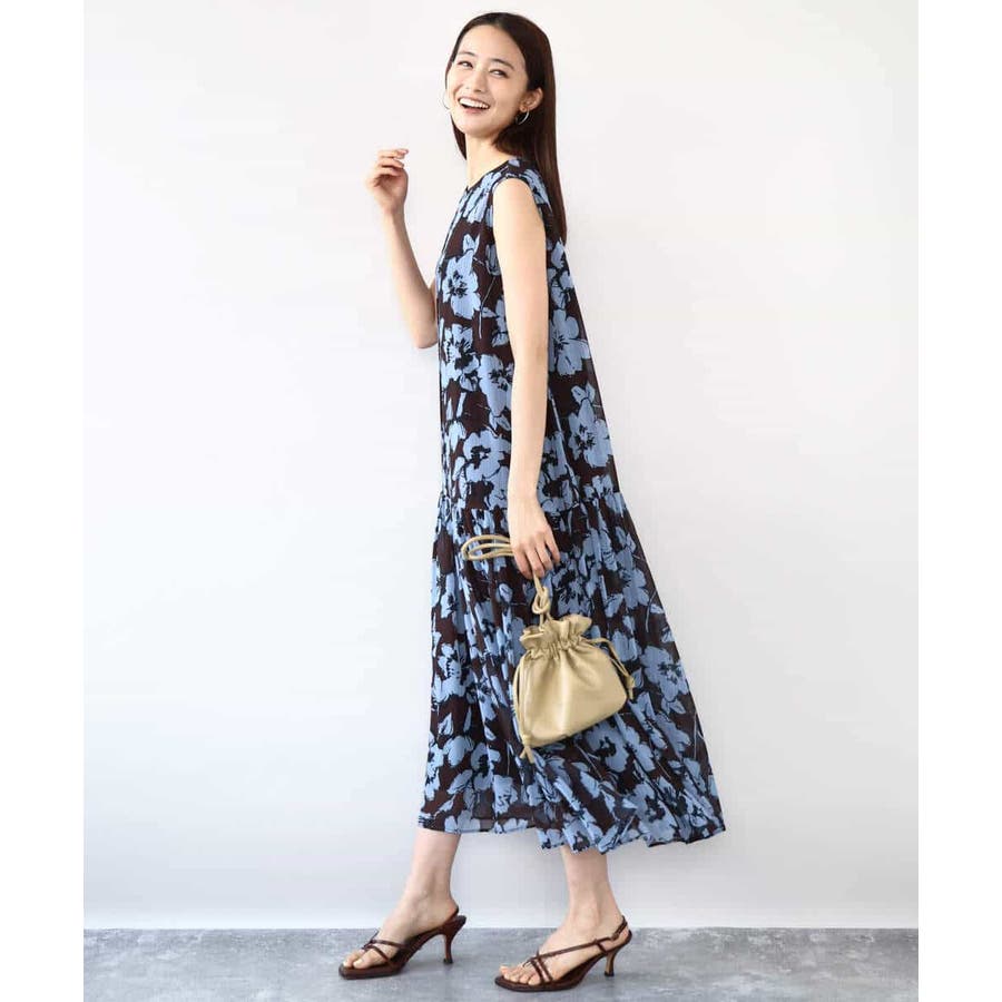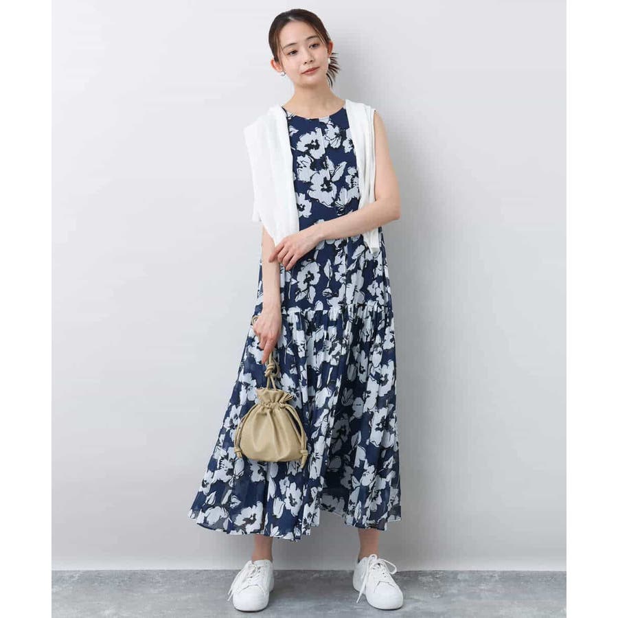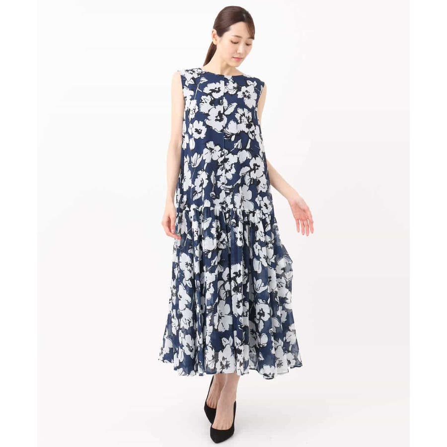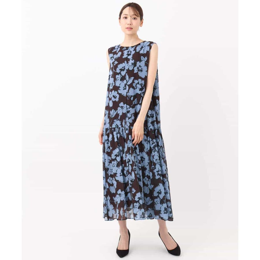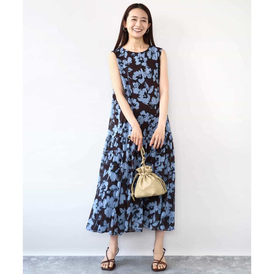 ニュアンスの効いた大きな花柄が大人の華やかさをプラスするワンピース。ノースリーブデザインですが腕がきれいに見えるように肩幅部分のサイズ感にもこだわりました。ゆったりとしたティアードデザインも大人な印象に。
