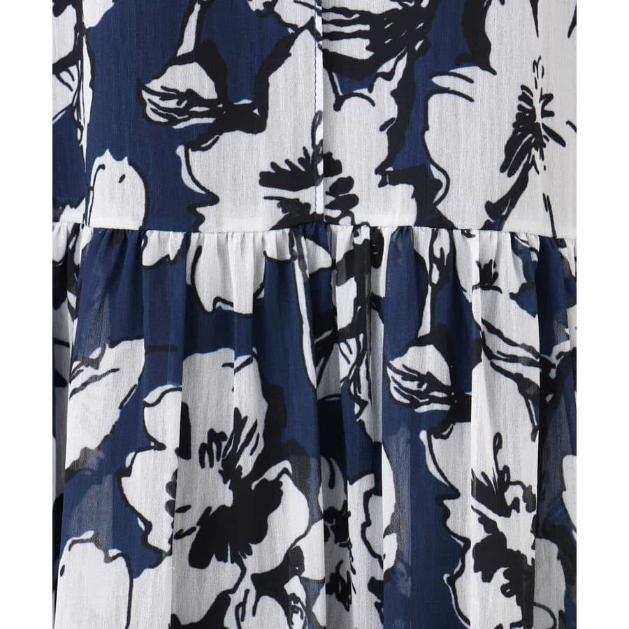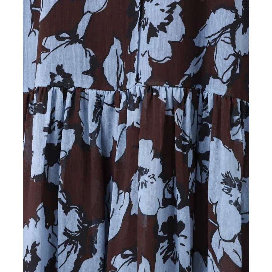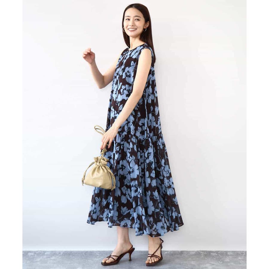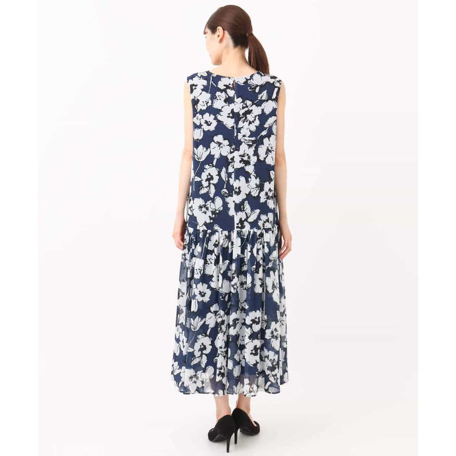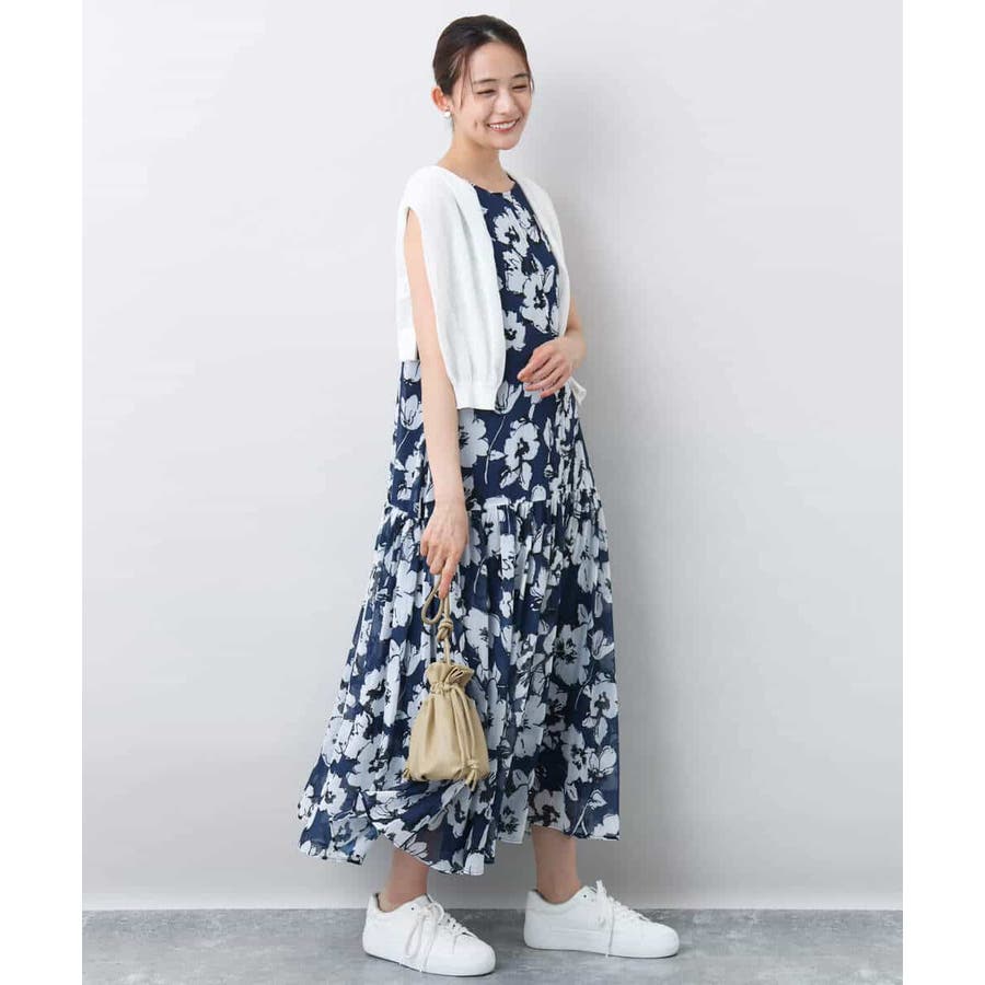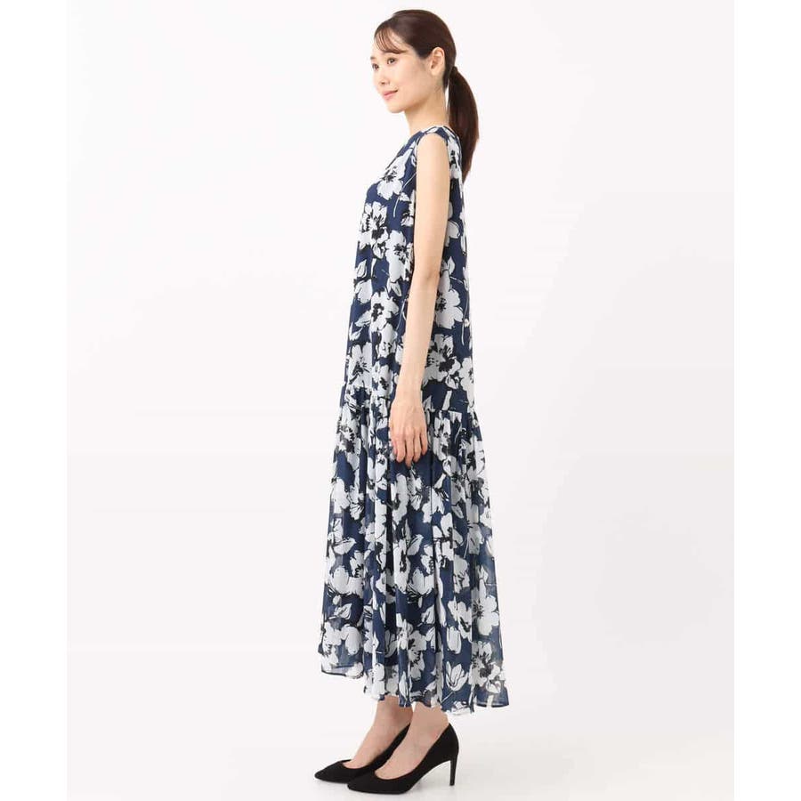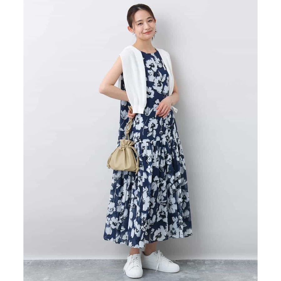 ニュアンスの効いた大きな花柄が大人の華やかさをプラスするワンピース。ノースリーブデザインですが腕がきれいに見えるように肩幅部分のサイズ感にもこだわりました。ゆったりとしたティアードデザインも大人な印象に。