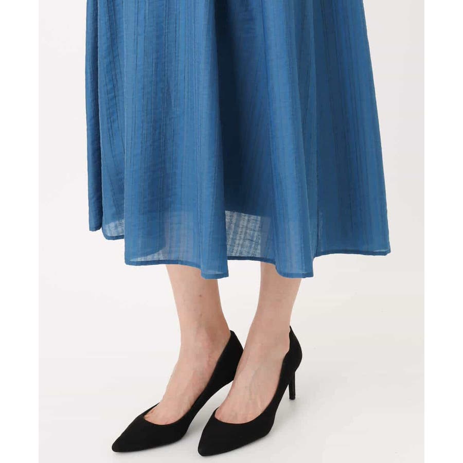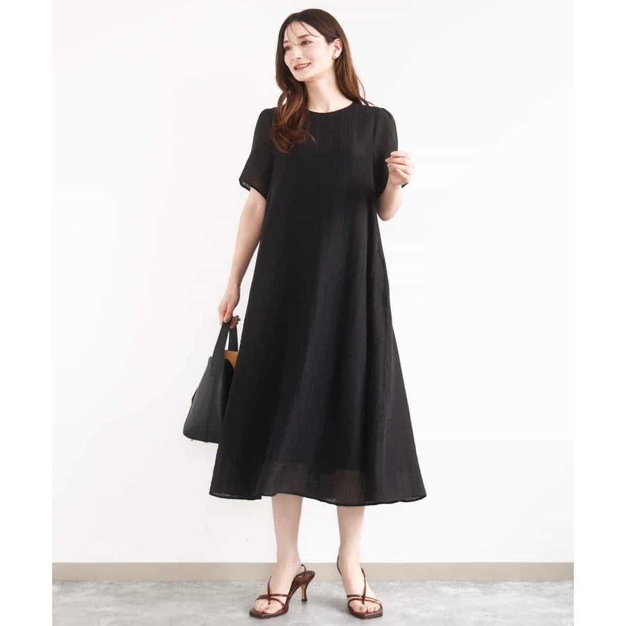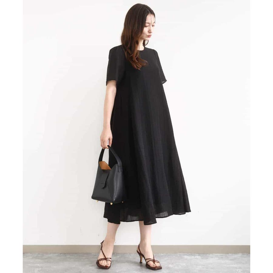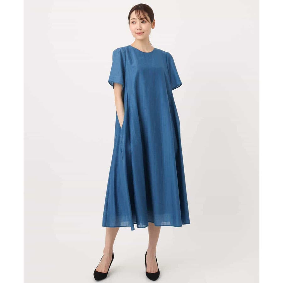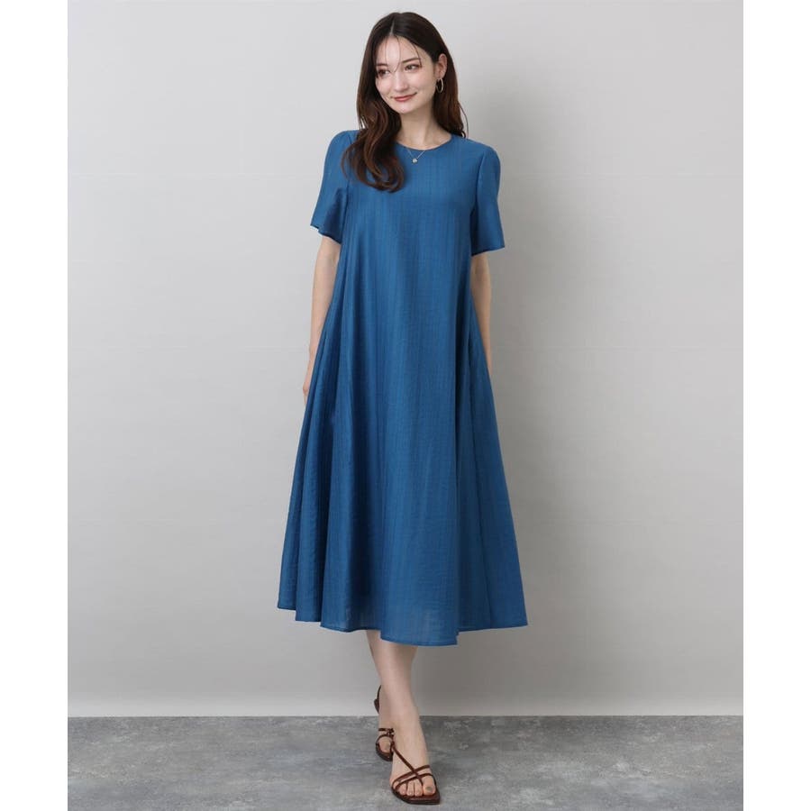 カジュアルにもきれいめにも着回せる、幅広いシーンで便利なフレアーシルエットワンピースです。素材にはややシャリ感があり、清涼感のあるドライタッチな手触り。ほんのりとハリもあるので、身体にまとわりつかずにきれいなシルエットが決まります。サイズ感はゆったりめでとってもらくちんでしたが、落ちすぎない肩のラインでカジュアルすぎずに着られました。ドビーストライプの上品で清潔感のある印象が、おでかけからお仕事まで着回せるこの季節におすすめの一枚です。