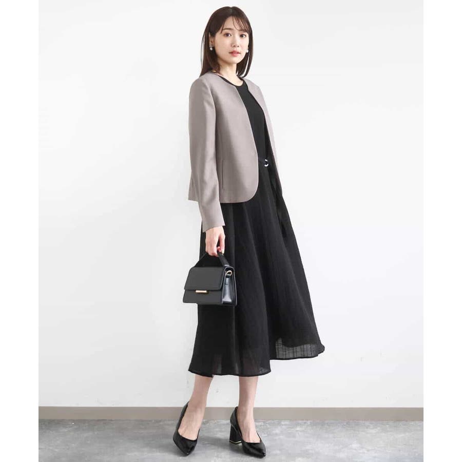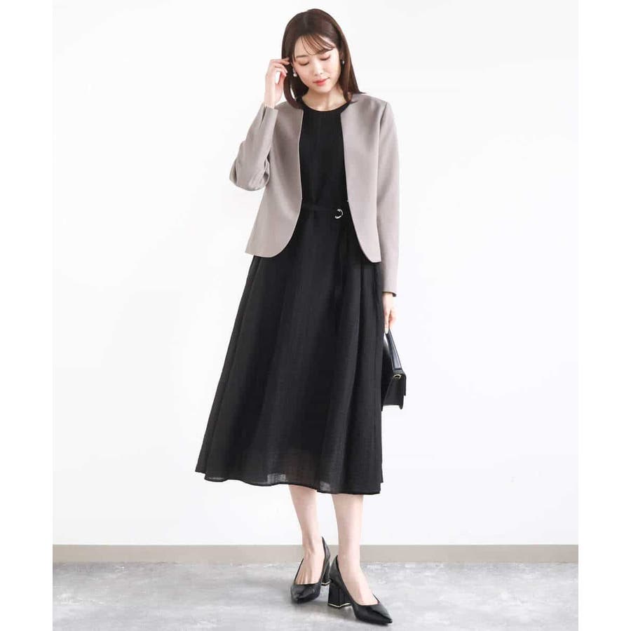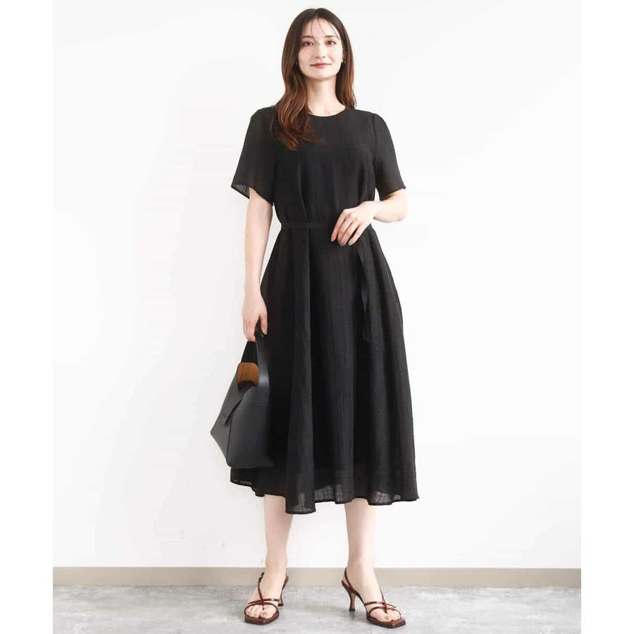 ややゆとりのあるシルエットですが、素材の効果できれいめに着こなせそうなワンピース。襟ぐりや腕の露出を押さえたデザインも◎。ほんのり透け感のあるドビーストライプ素材は裏地つきなのでインナーやペチコート要らずでさっと着られるのも嬉しい。付属の共布ベルトでウエストマークすればさらに上品さがUPしお食事会やお顔合わせなどのきちんとしたシーンにも着用いただけます。