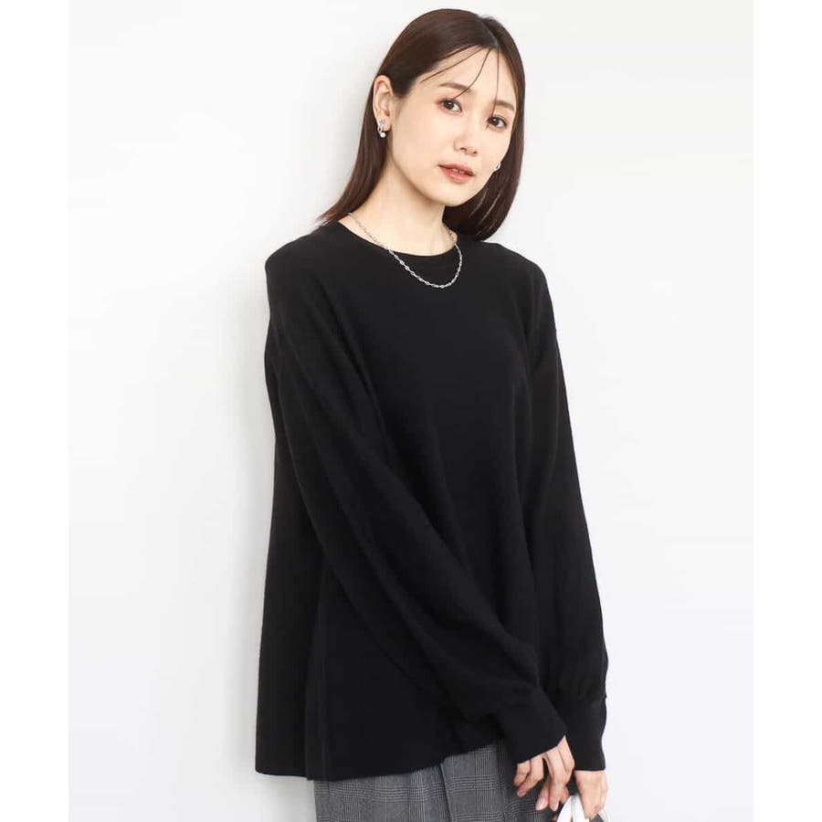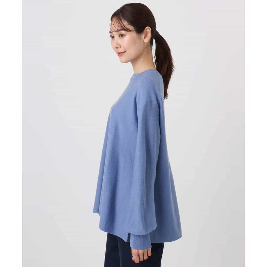 ニットならではの引き返し編みでフレアーシルエットに編み立てたプルオーバー。ヒップが隠れる丈感とフレアーな分量感がシンプルながらも一枚で決まるシルエットに。