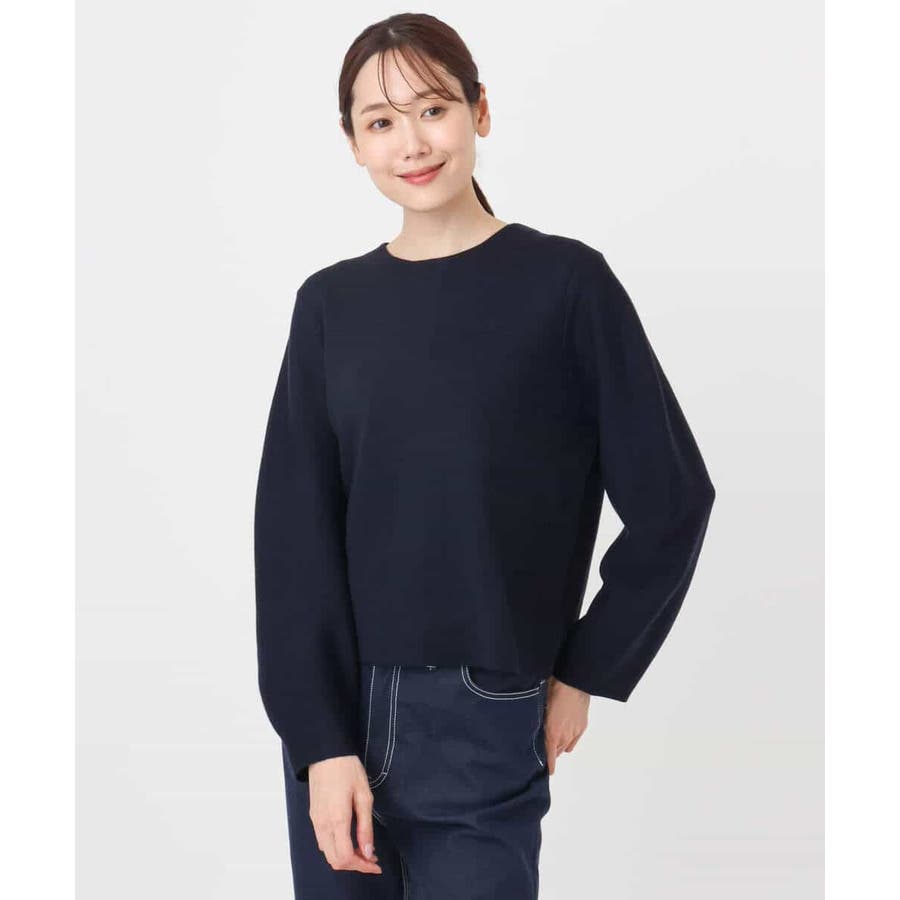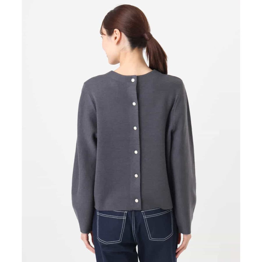 ニットならではの引き返し編みを使った立体的なシルエットが特徴のプルオーバー。パフスリーブに、後ろ釦のデザインがどの角度から見てもポイントに。