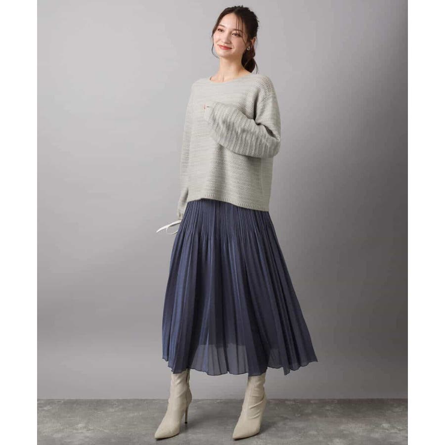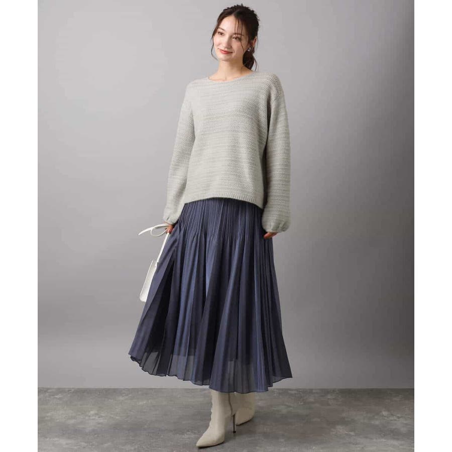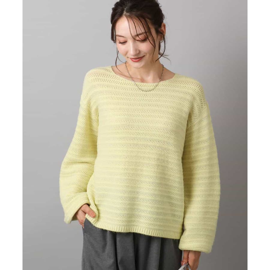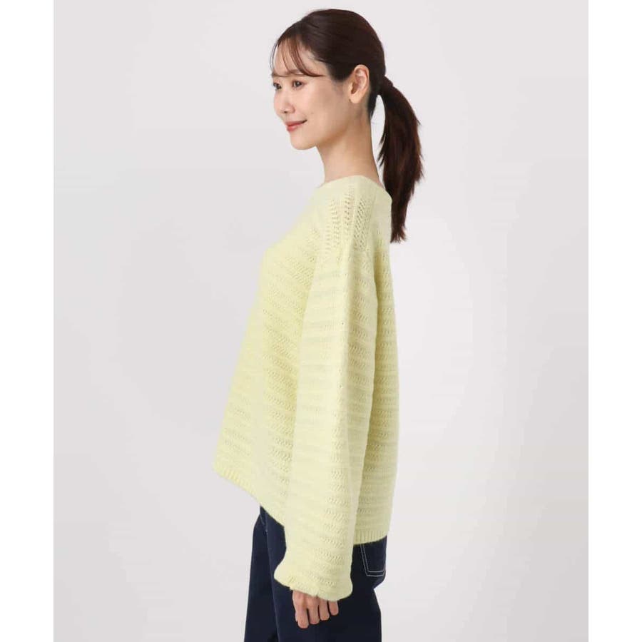 すっきりと見える衿ぐりと袖口のボリュームパフがデザインポイントのニット。編地でボーダーを表現したニットは手持ちにはない、買い足しアイテムとしてもおすすめです。