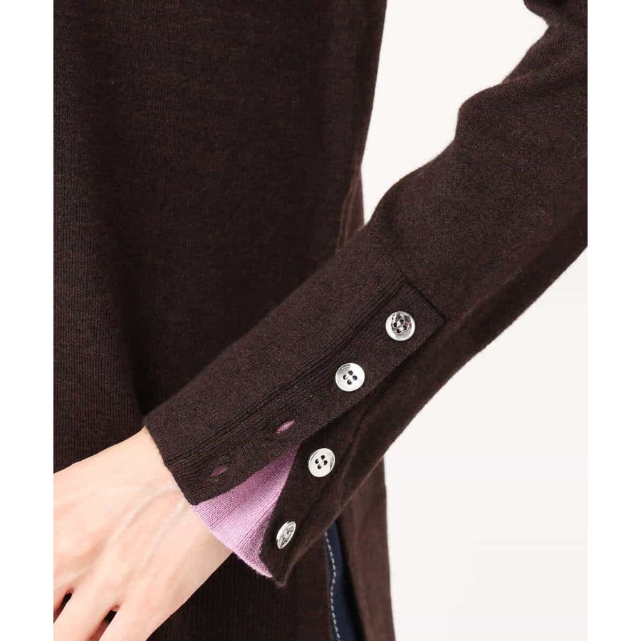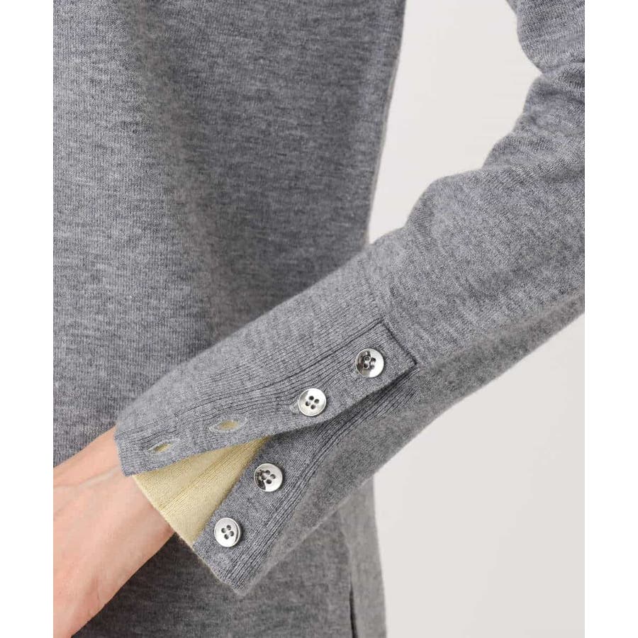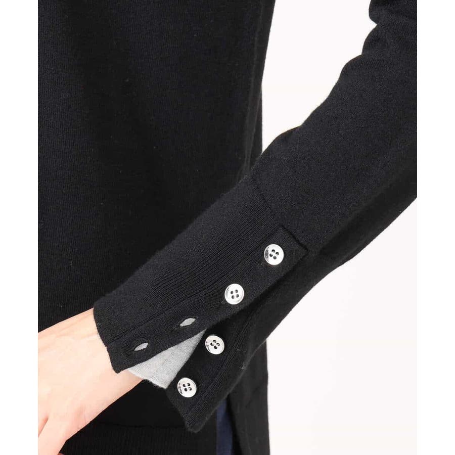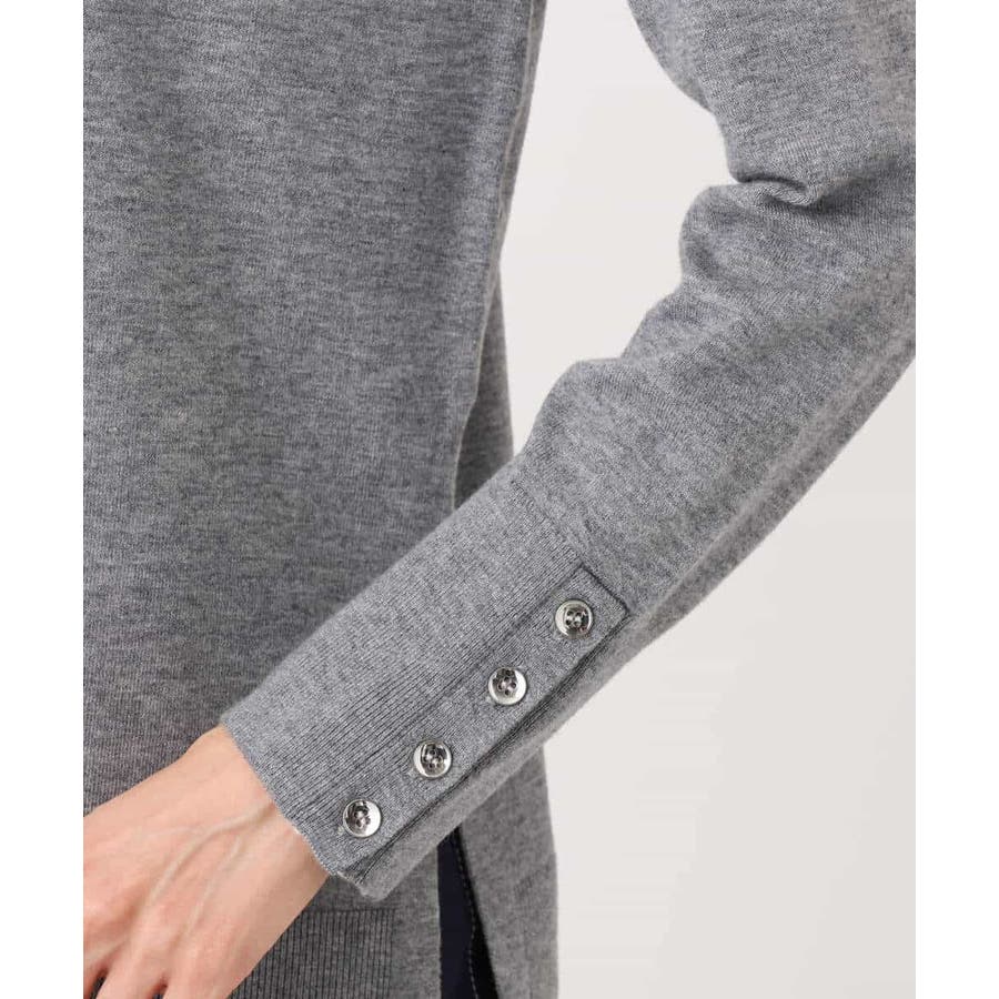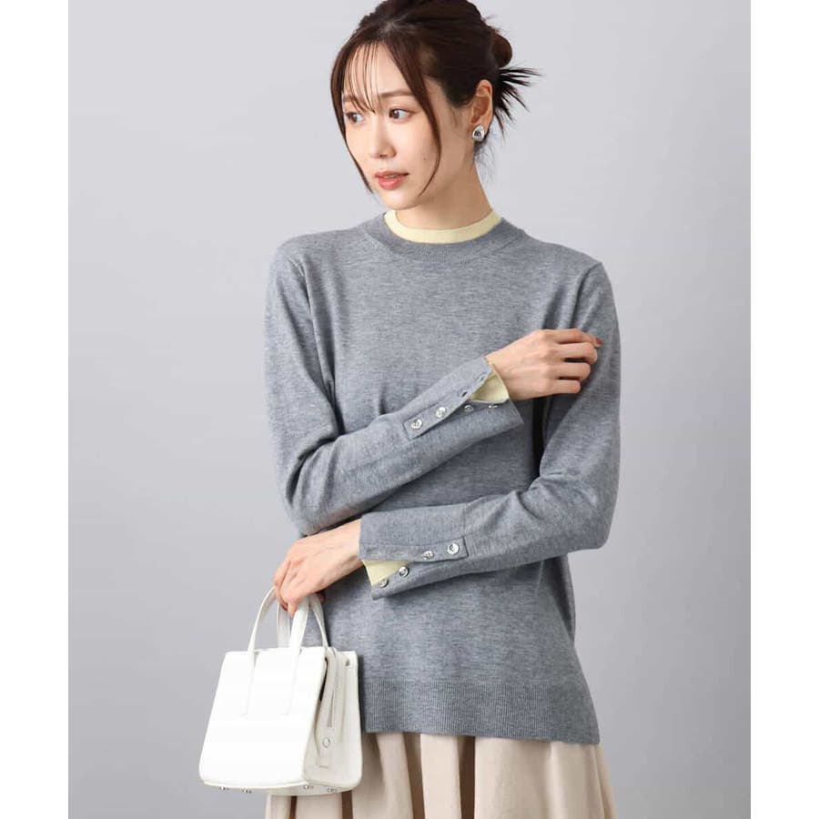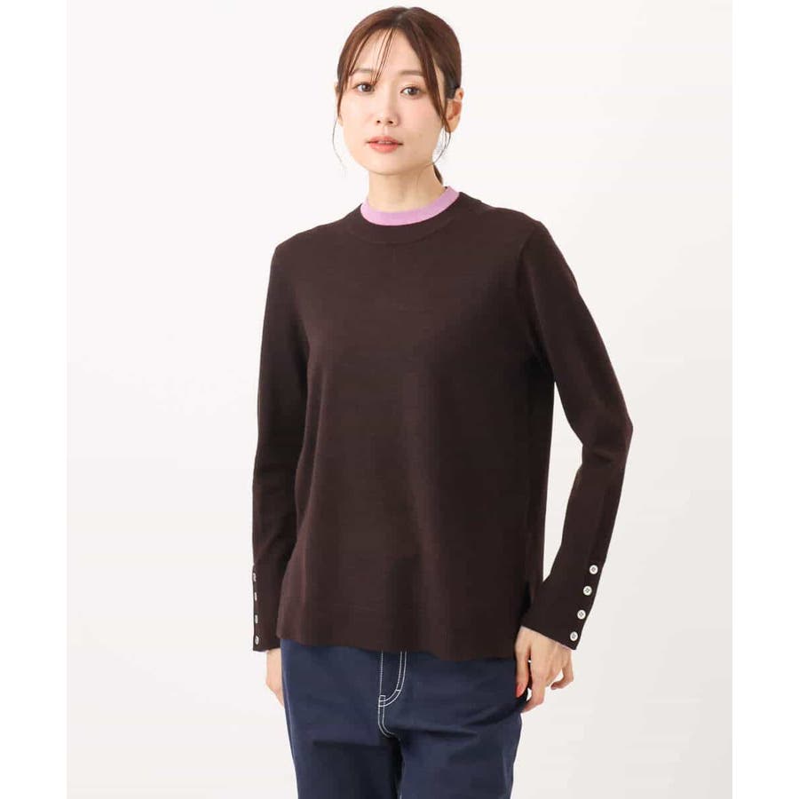 衿ぐりと袖口の配色デザインがポイントのニットプルオーバー。毎年人気のニットですが、今季は衿をやや低めにし、より着やすいデザインにアップデートしました。袖口は配色&メタル釦でアクセントに。釦の開け閉めで見せ方をアレンジできます。