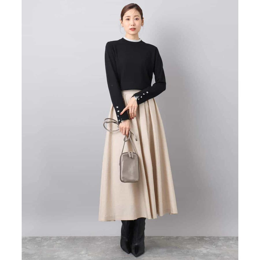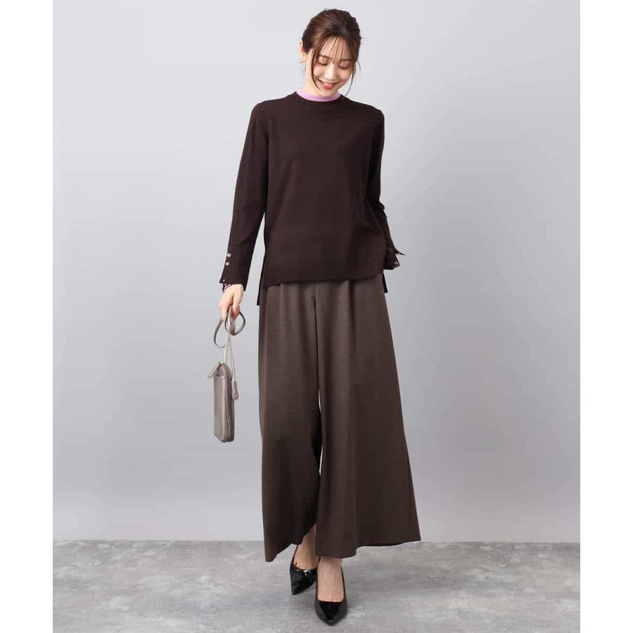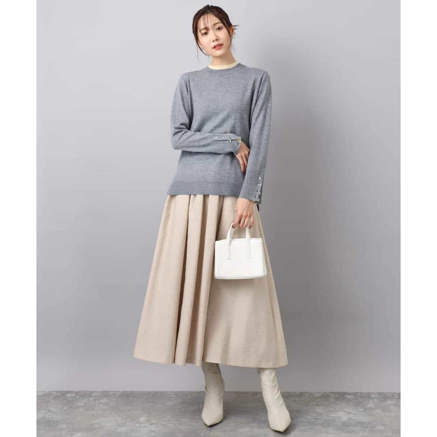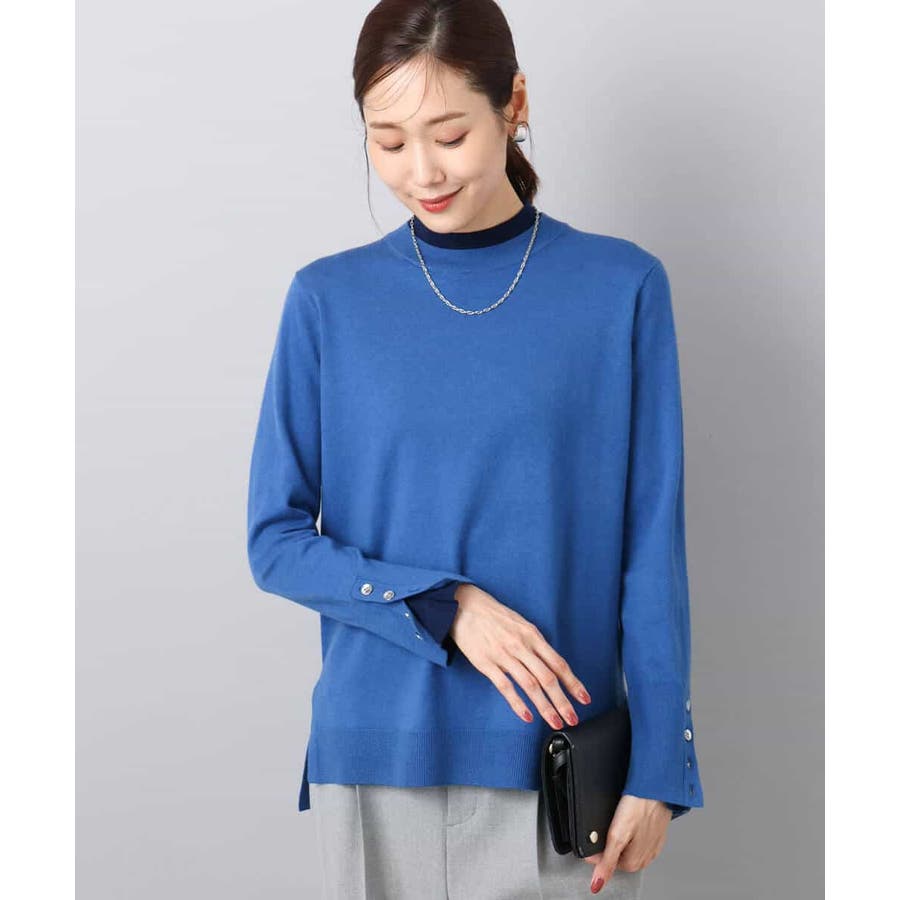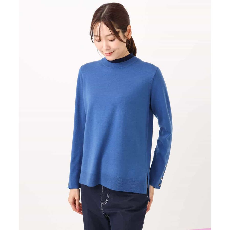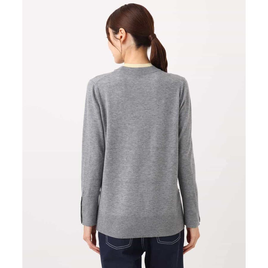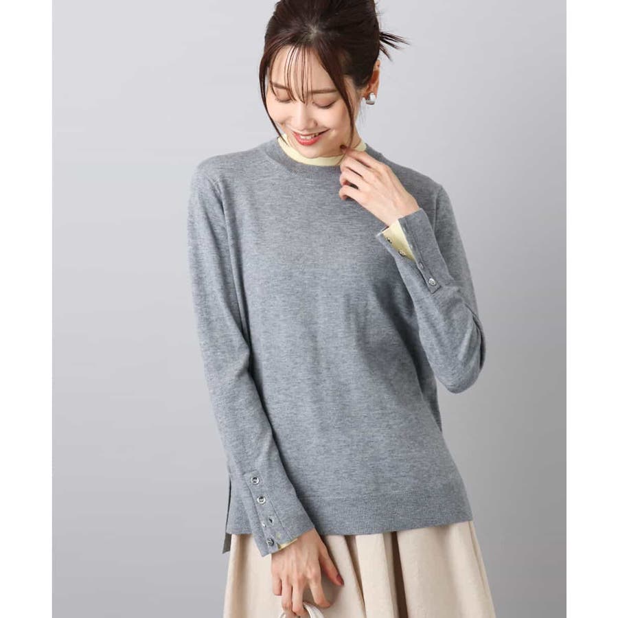 衿ぐりと袖口の配色デザインがポイントのニットプルオーバー。毎年人気のニットですが、今季は衿をやや低めにし、より着やすいデザインにアップデートしました。袖口は配色&メタル釦でアクセントに。釦の開け閉めで見せ方をアレンジできます。